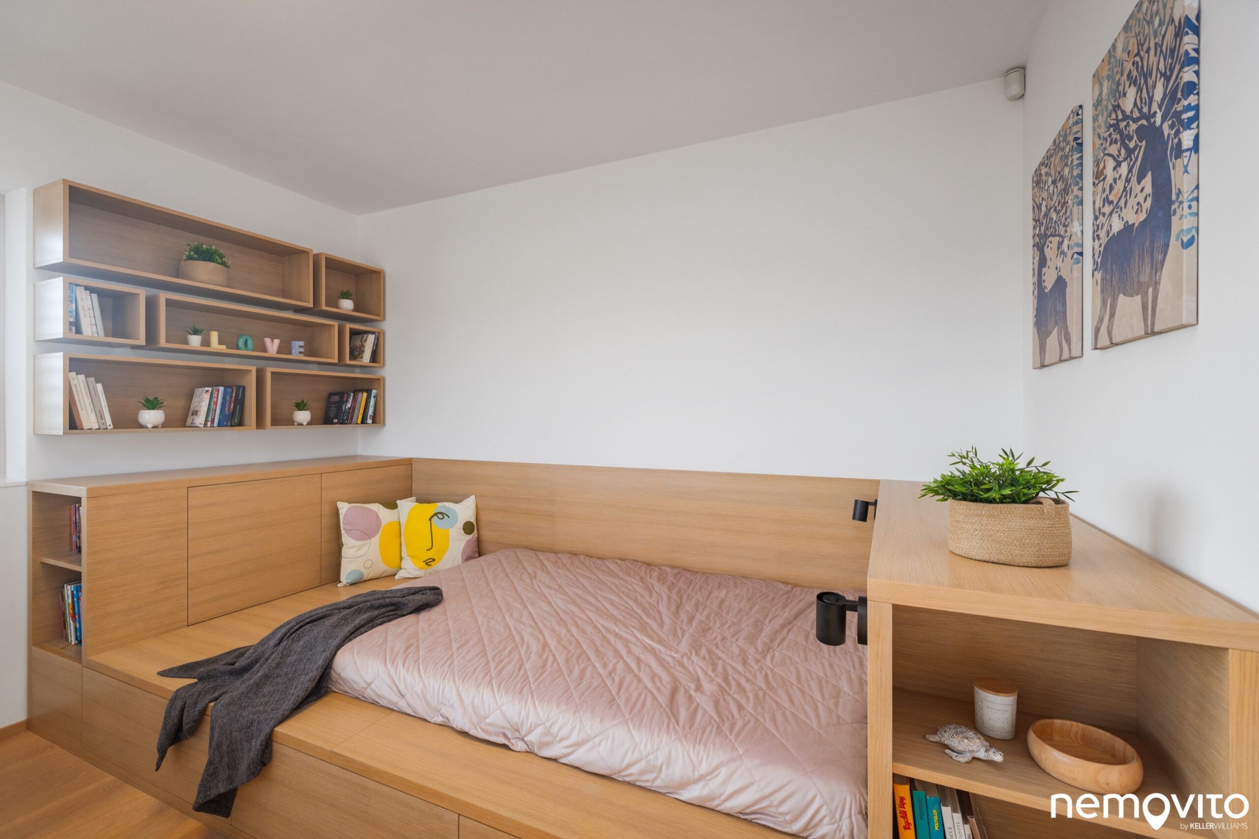 Poslední ložnicí je pak tento pokoj o celkové velikosti 18 m2, z čehož 3 m2 tvoří vstupní část se šatnou. Pokoj je vybaven velkým truhlářským prvkem, který v sobě pojí úložné prostory i postel.