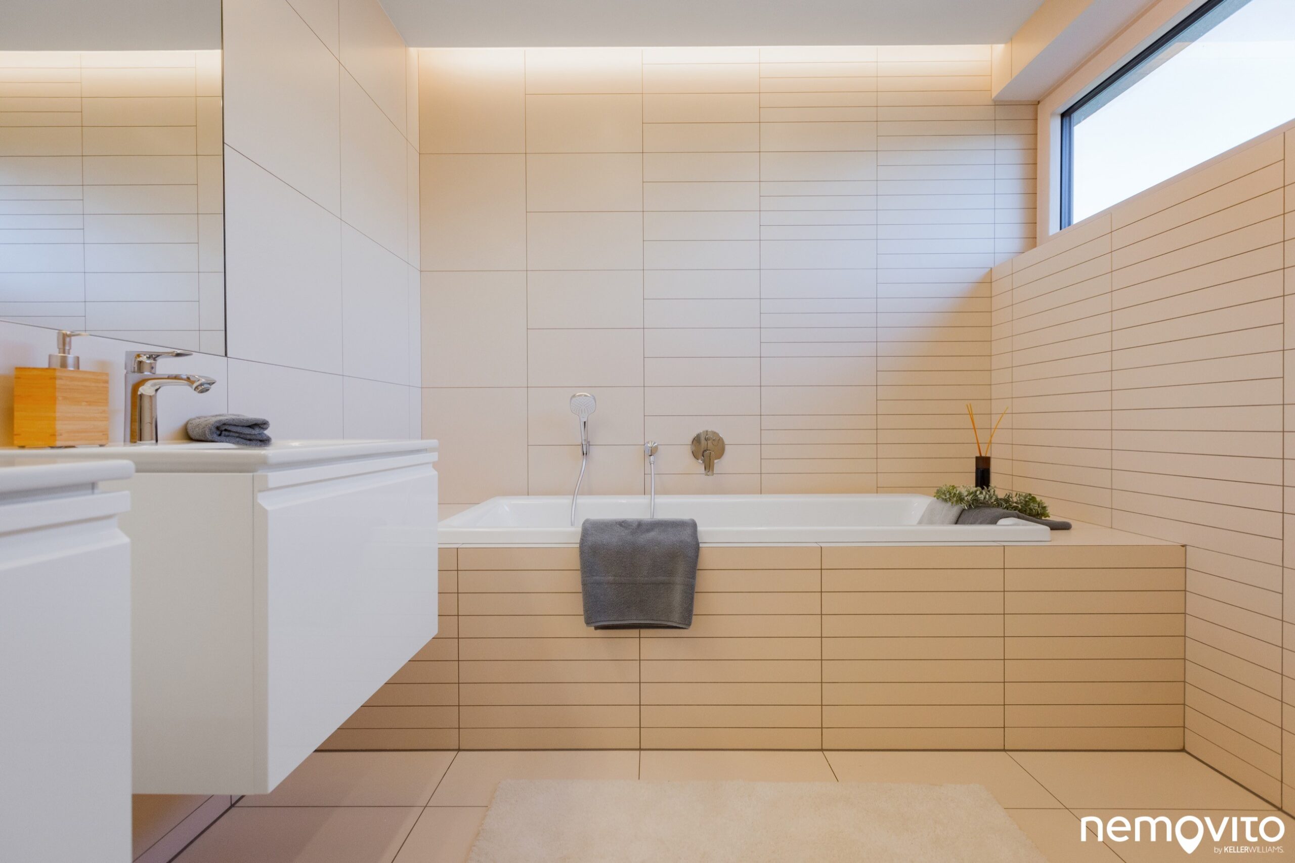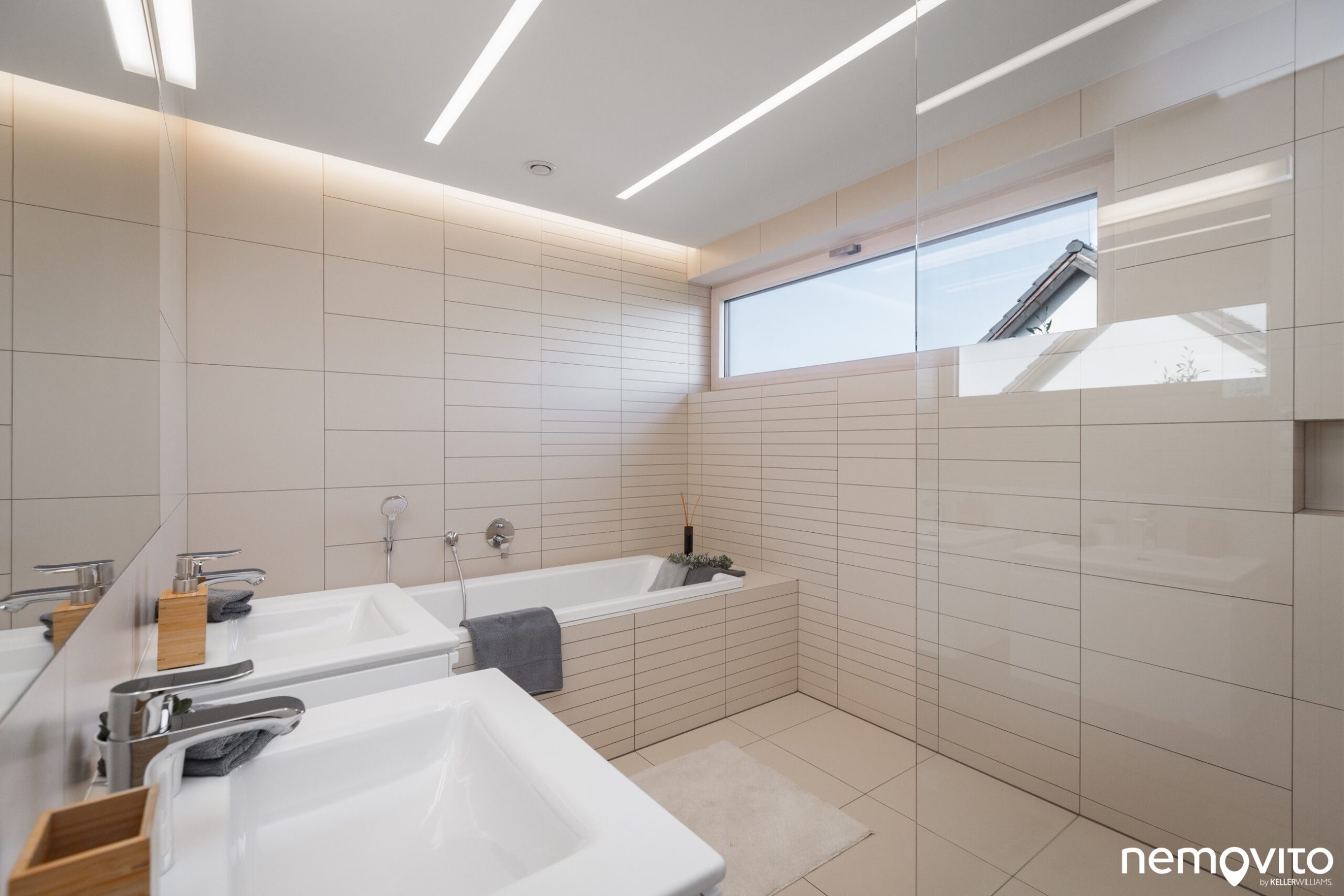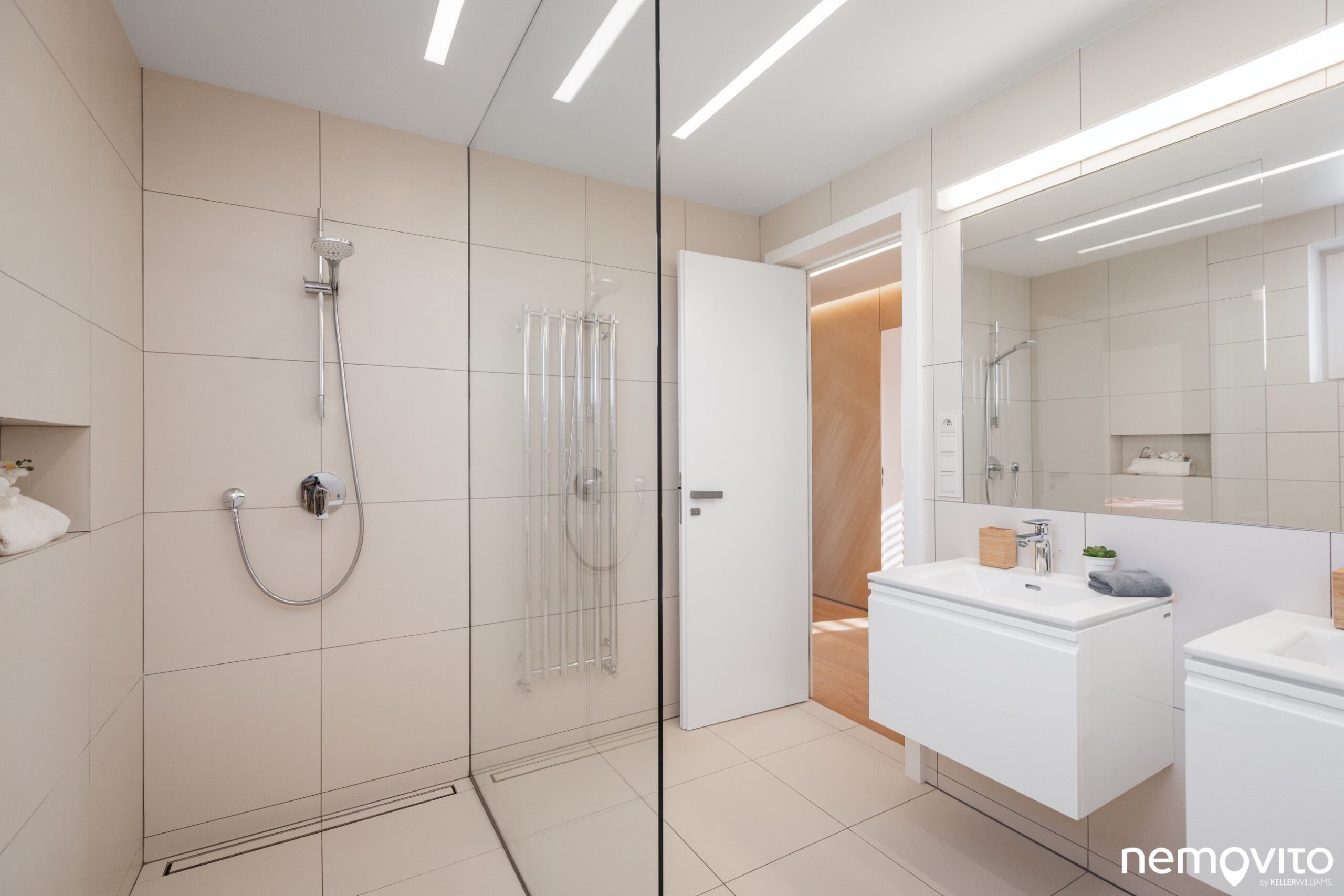 Koupelna rodičů je vybavena dvěma umyvadly, velkým zrcadlem přes celou stěnu a rozměrným sprchovým koutem (je vidět v zrcadle). Nechybí podlahové topení a okno.