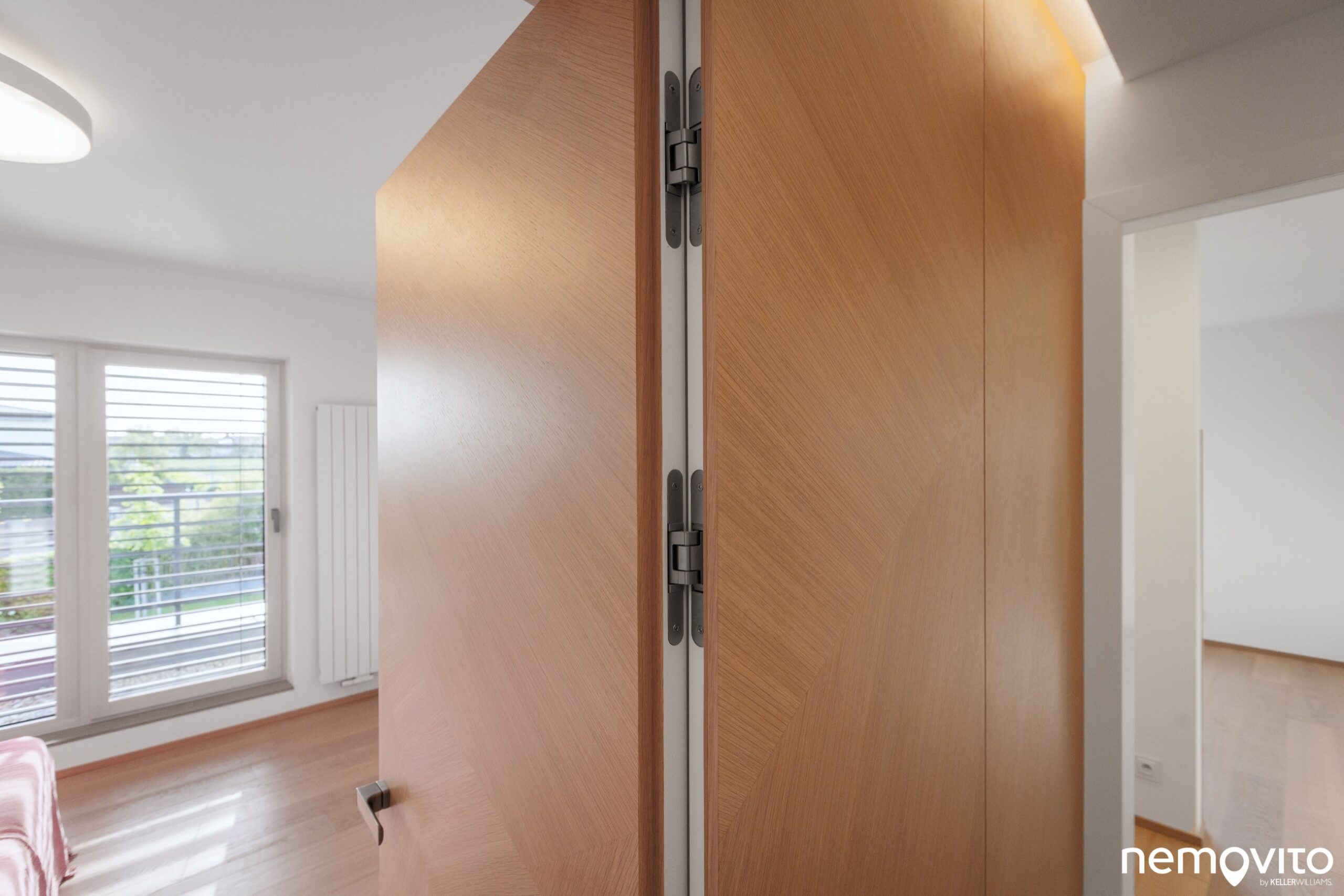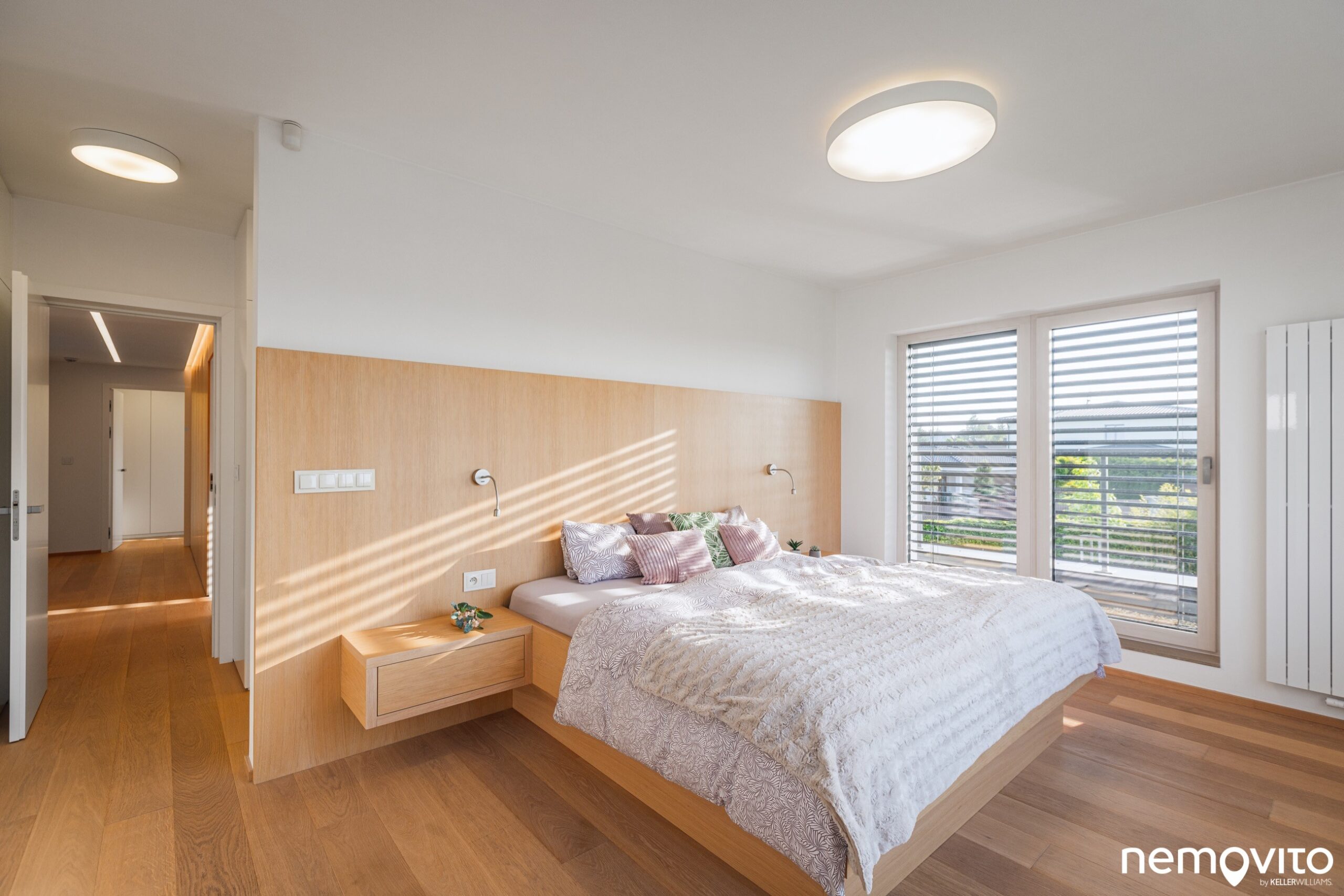 Než se vydáme do "tajné místnosti" za dřevěným obkladem, prohlédneme si hlavní ložnici. Její plocha je 21 m2. Podlaha druhého podlaží je dřevěná z běleného dubu, vytápění je tak nyní řešeno designovými radiátory.