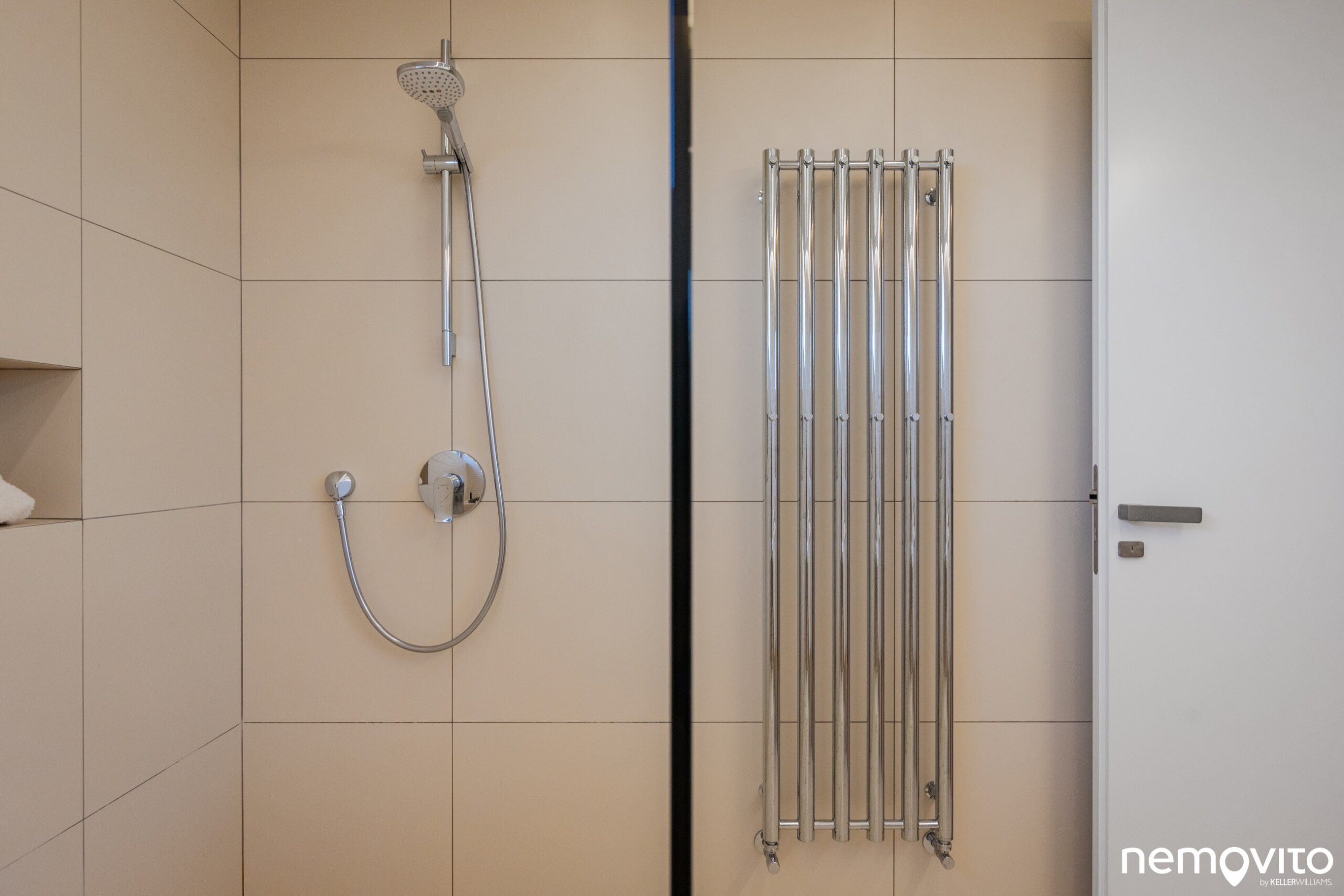 Přesto však koupelna vypadá skvěle. Několik variant osvětlení, střídmý dekor velkoformátových dlaždic a sprchová zástěna ze skla, které umocňuje dojem už z tak velké místnosti.