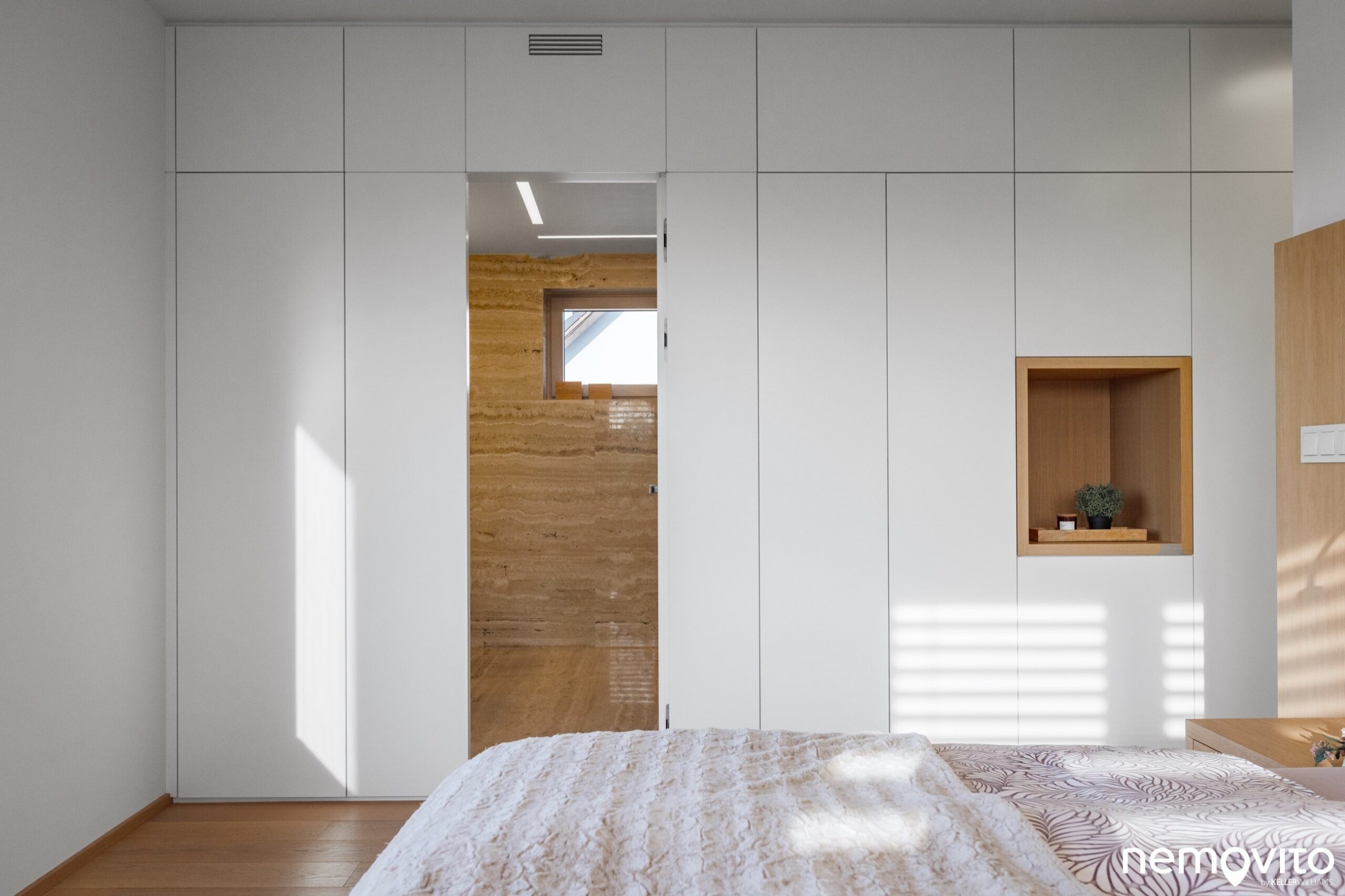 Trik s ukrytými dveřmi se promítl i do ložnice, kde je vstup do koupelny zakomponován do stěny s vestavěnými skříněmi. Ty nechybí ani při vstupu, kde tvoří walk-in šatnu.