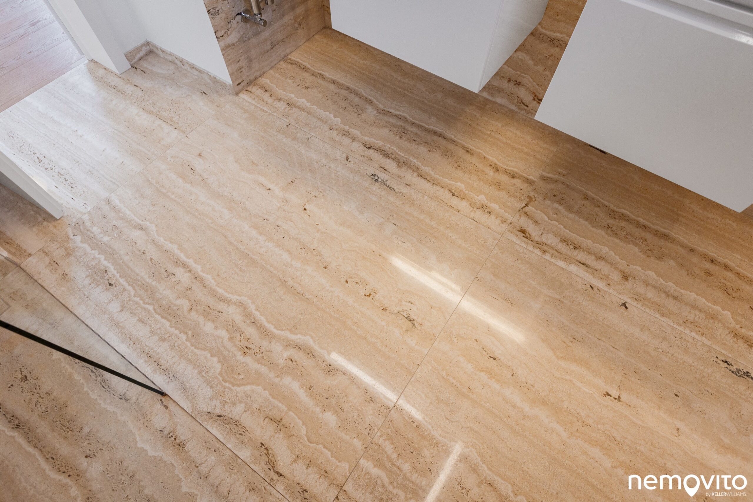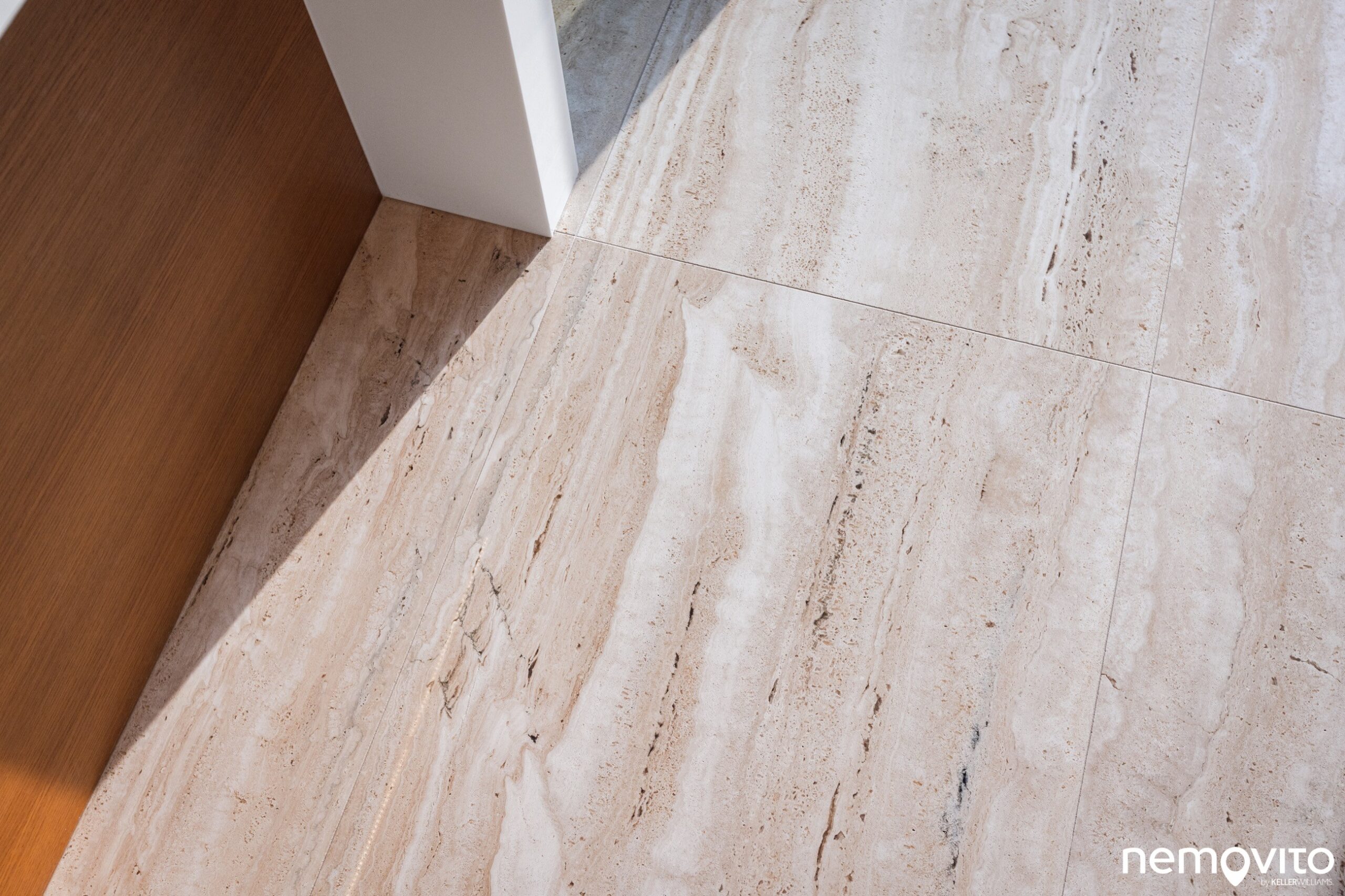 Když už byla řeč o podlaze, její provedení jste pravděpodobně nepřehlédli. Velkoformátový tvavertin je totiž společným jmenovatelem uvnitř, ale i zvenčí. Leštěná podoba materiálu, ze kterého je mimochodem postavené například koloseum v Římě, nalezla své uplatnění i v čistě moderní stavbě.