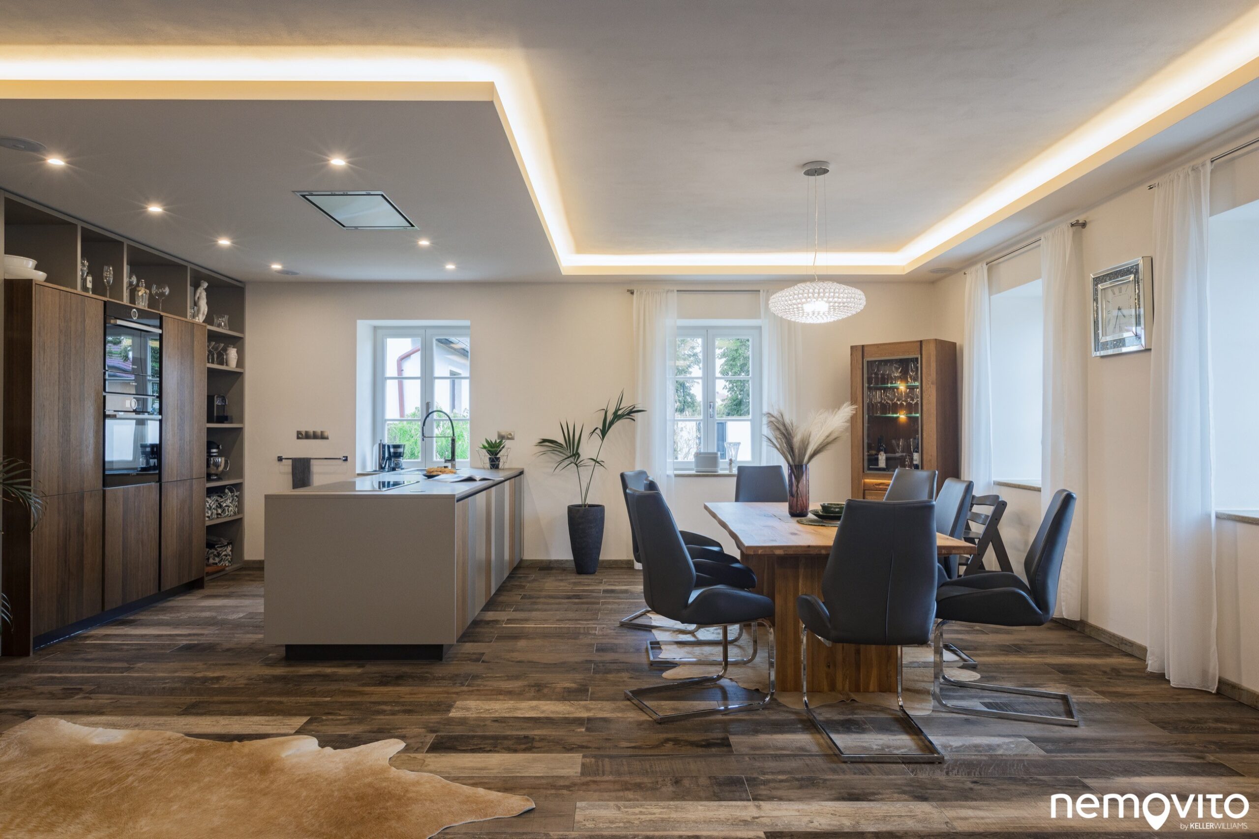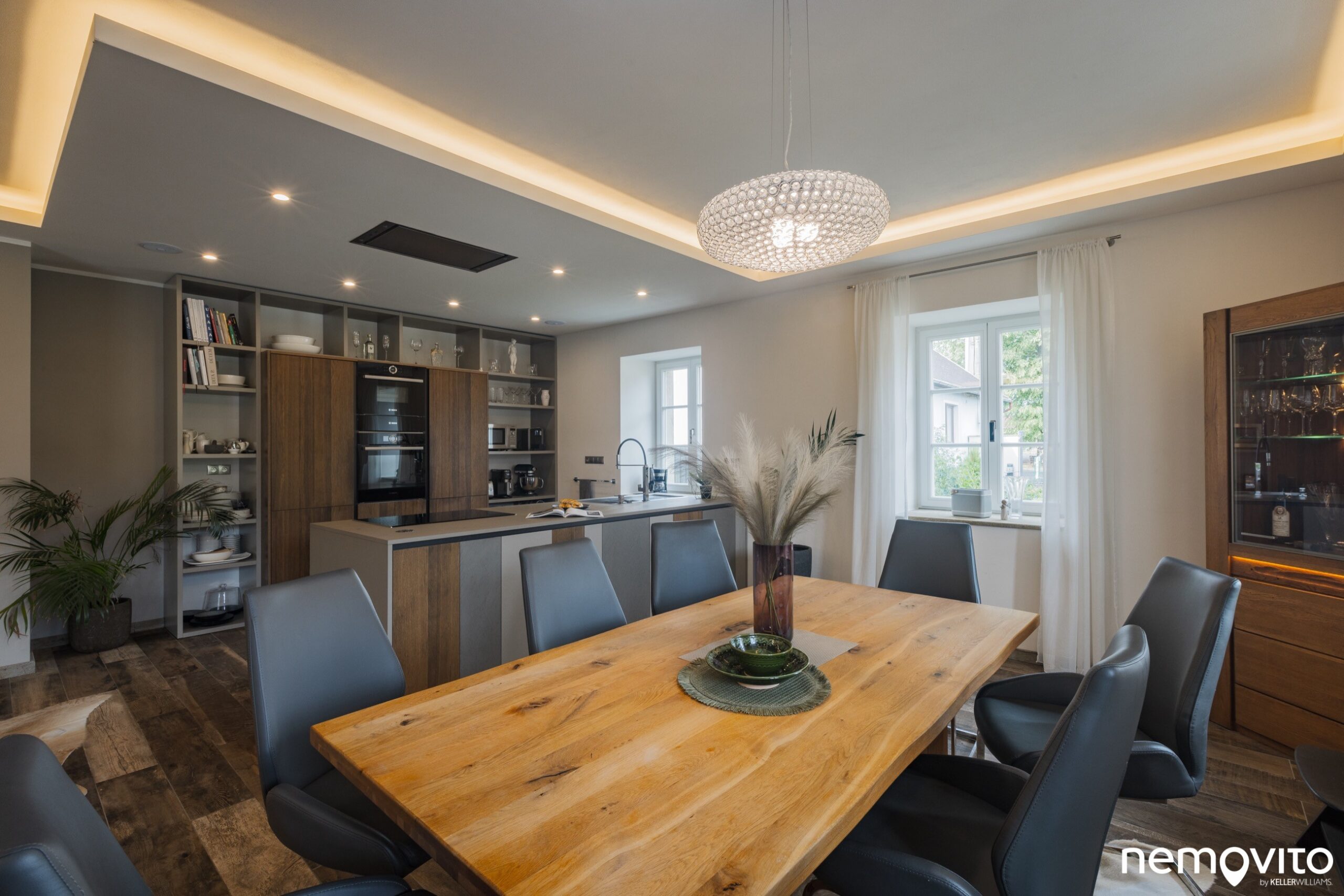 Jídelní prostor se nachází před kuchyňskou linkou, připraven je stůl pro 8 natěšených hostů. Pod holdujete muzice, pak vás jistě potěší vestavěný audio systém Jamo 5.1.