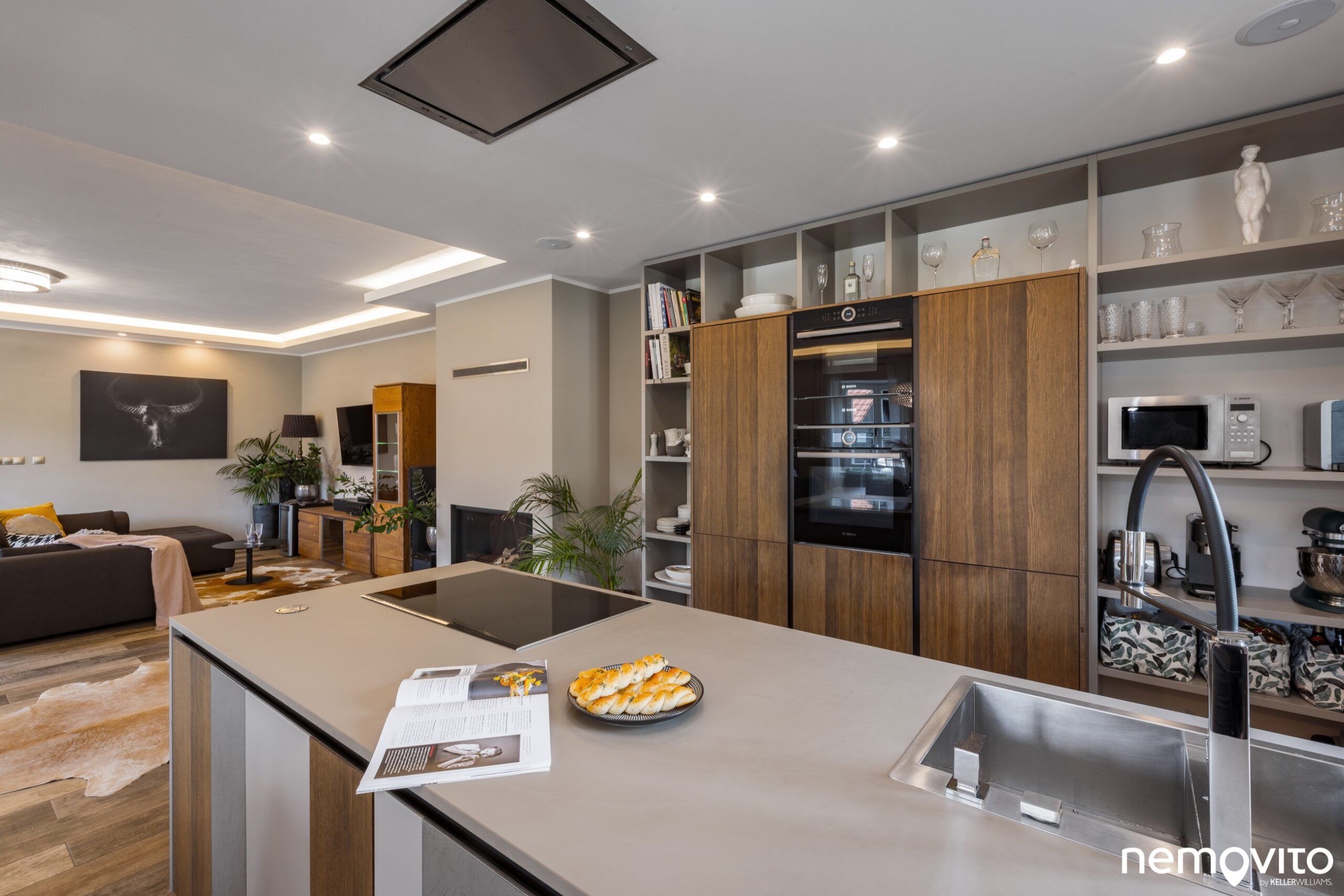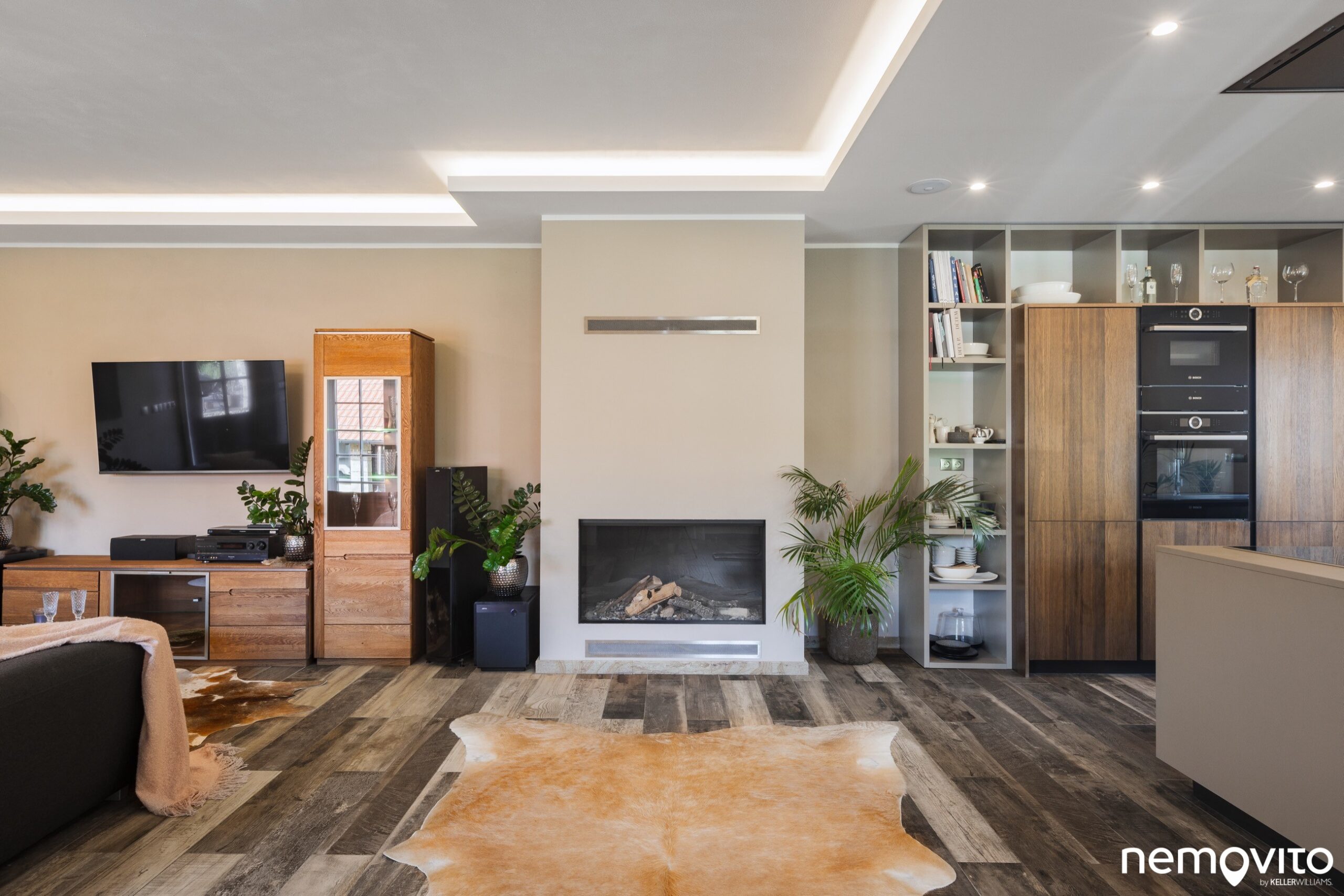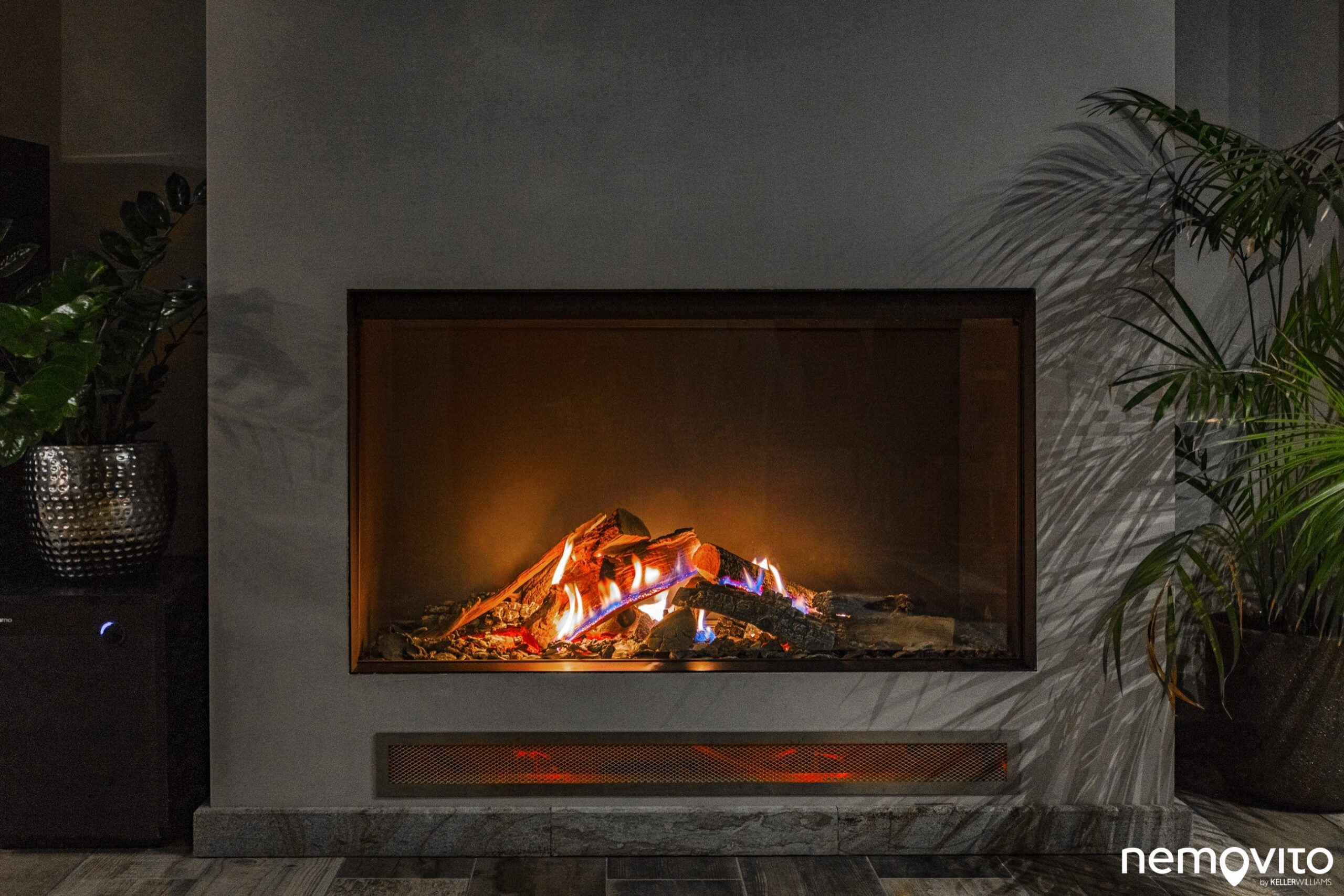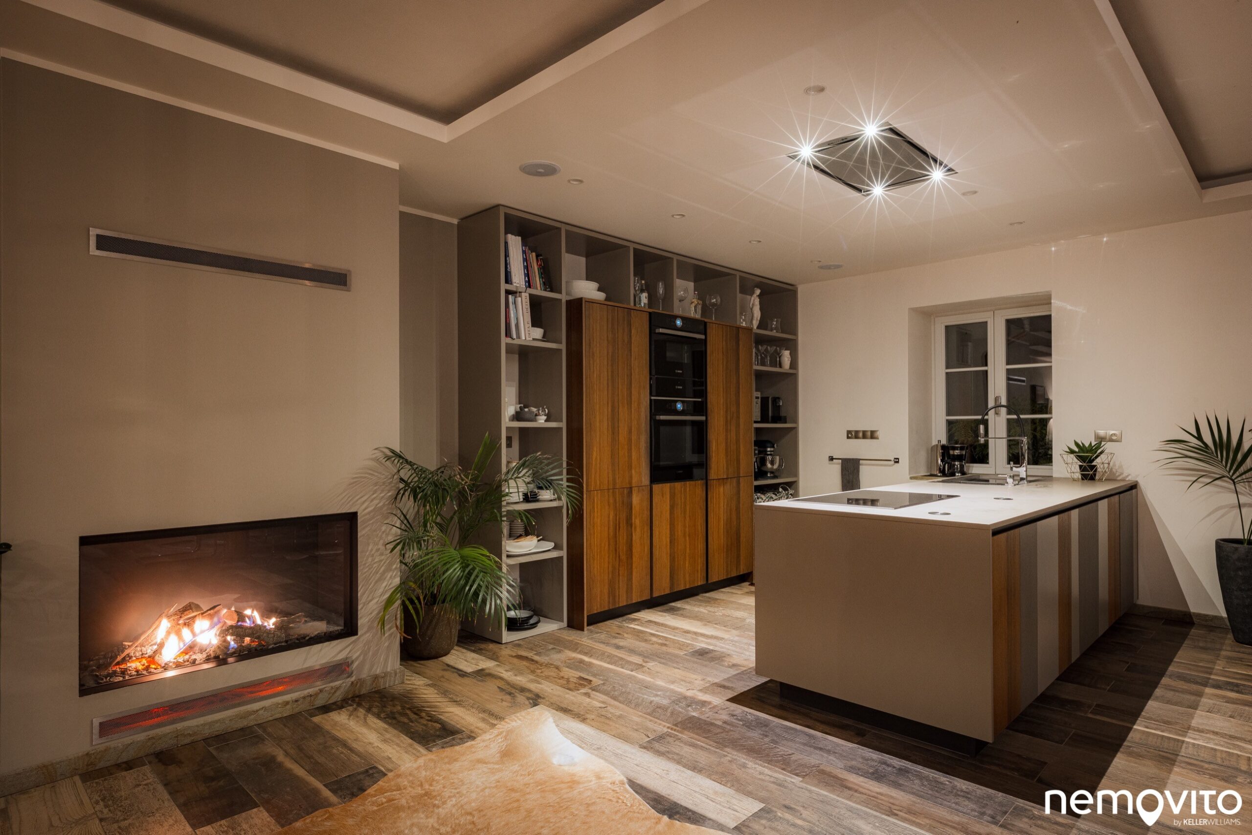 S hosty budete neustále v kontaktu, kuchyňská linka je totiž vybavena pracovní plochou ve formě ostrůvku. Krb, který se nachází hned vedle, je plynový, tedy bez trápení se s čištěním.
