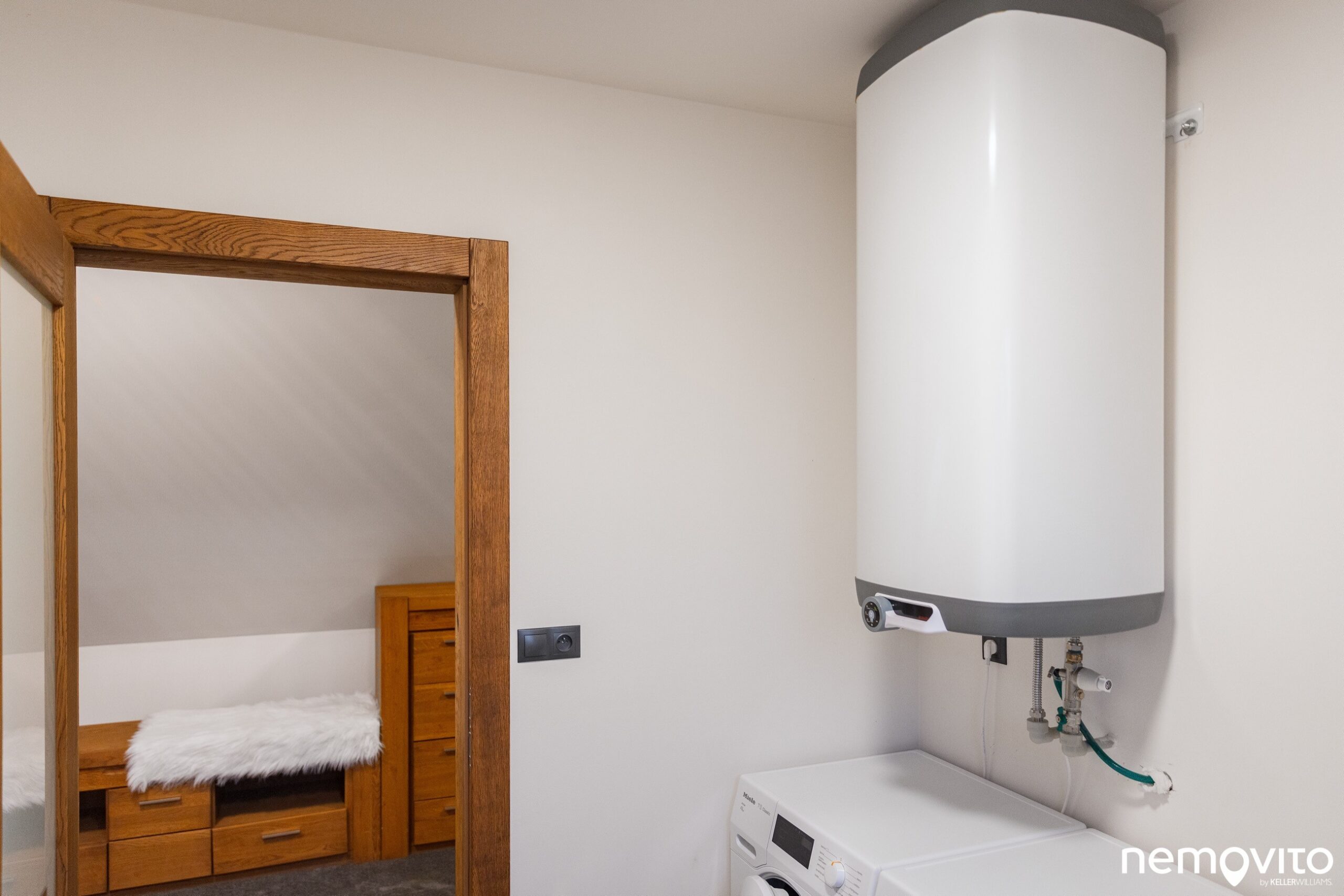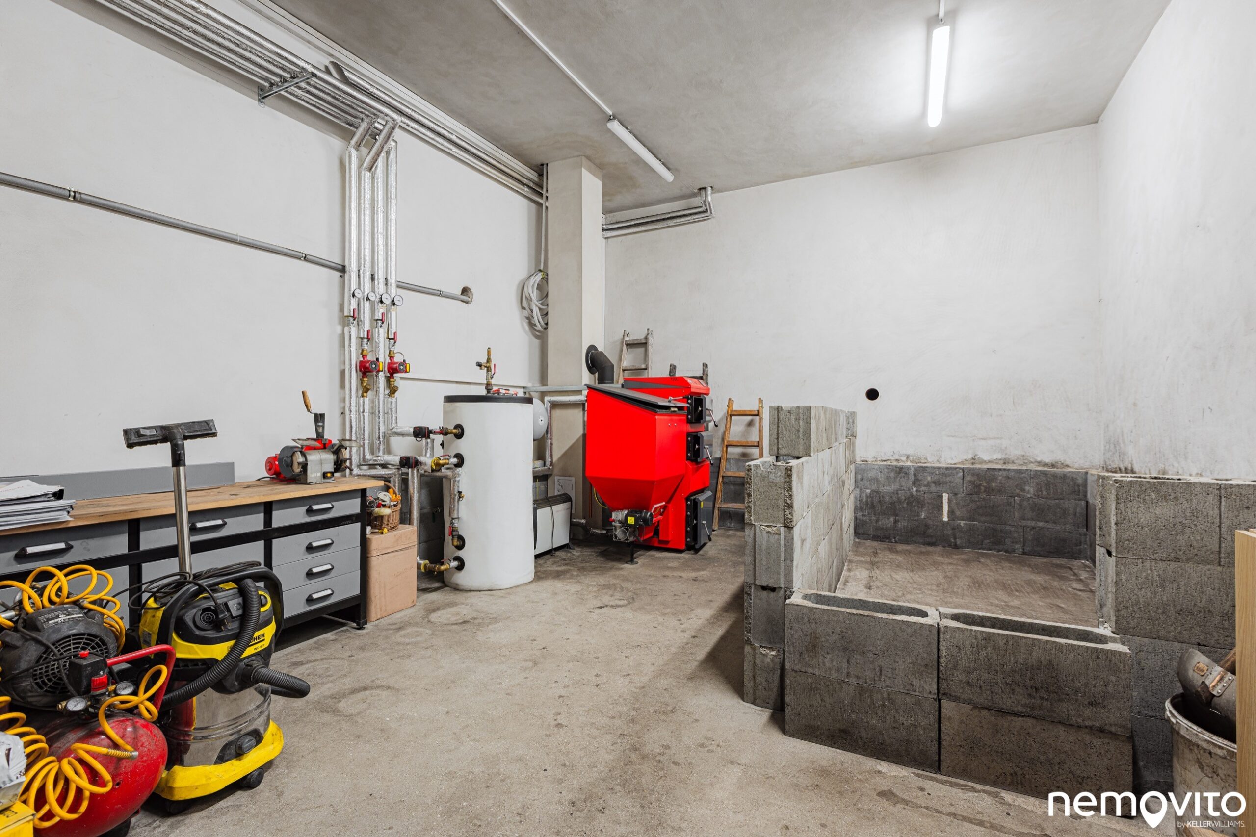 Zdrojem tepla pro celý dům je kotel na tuhá paliva s automatickým zásobníkem, který vystačí na 10 dnů topení. Sezónní spotřeba paliva činí 70 metráků (36.000 Kč za 2022). Zázemí k vytápění domu má 29 m2 a tak pojme i skutečně velkou technologii. Pokud se rozhodnete pro umístění solárním panelů na rozměrnou střechu, baterek tu můžete mít až nad hlavu. Výměna za tepelné čerpadlo je samozřejmě možná. Dům utáhne čerpadlo o výkonu kolem 13 kW (je spočítáno).