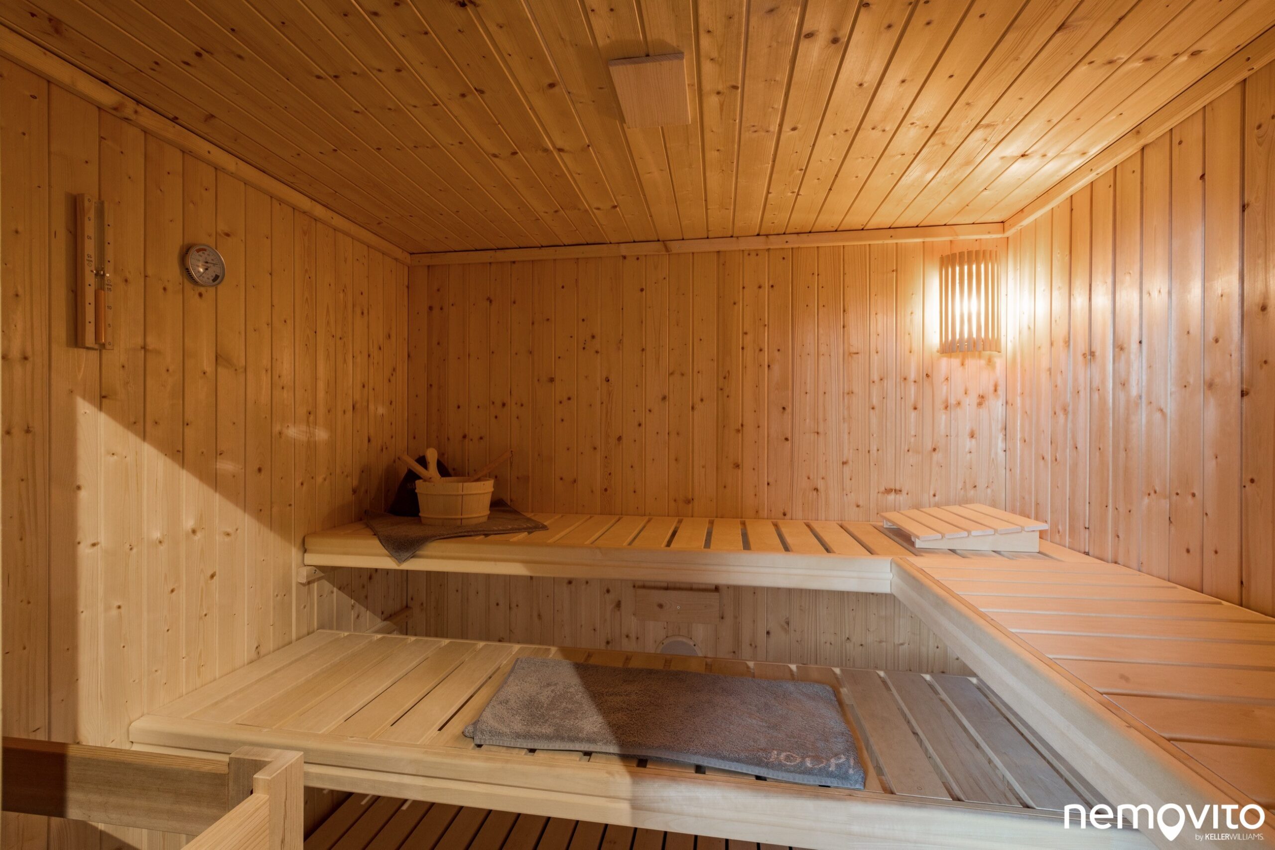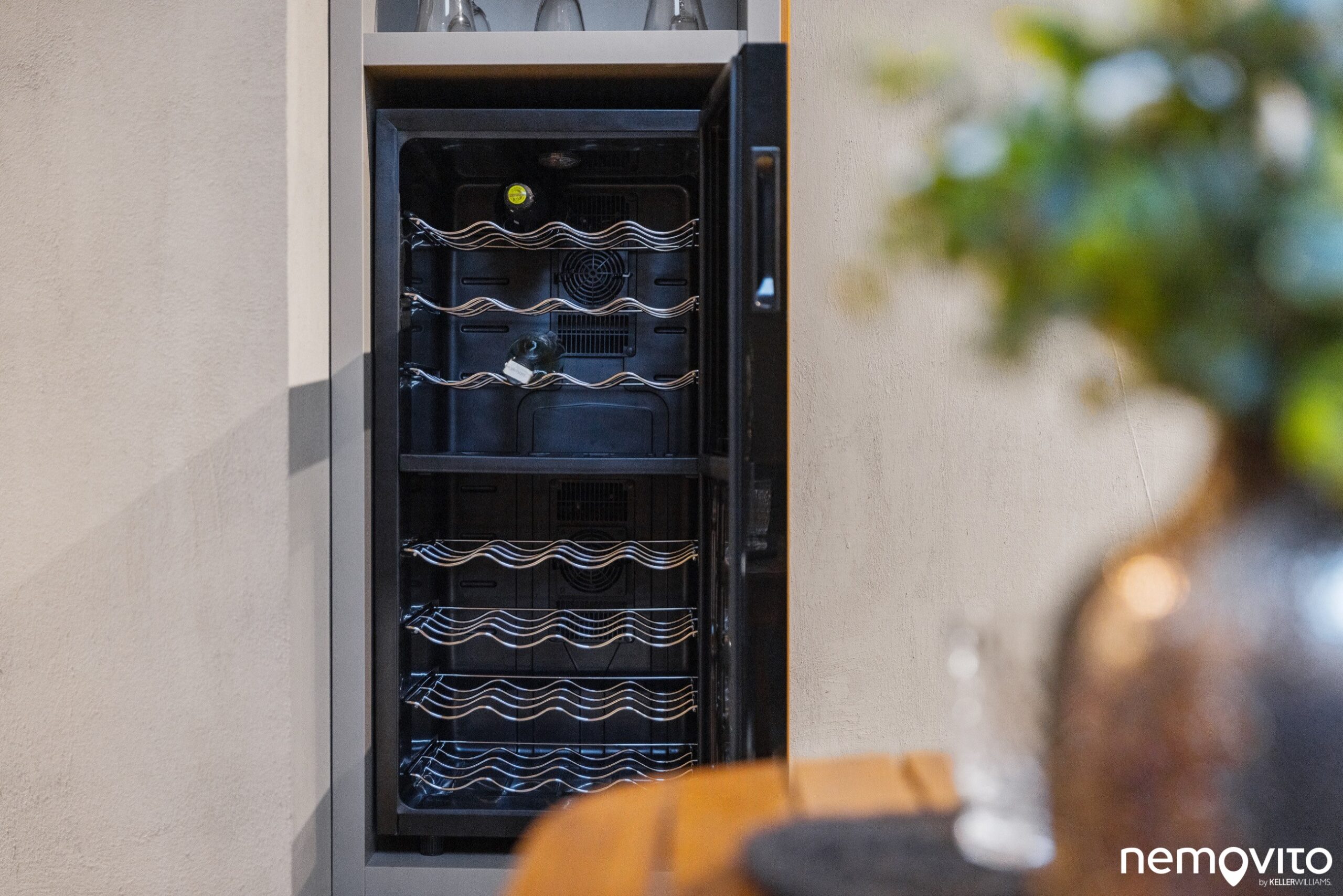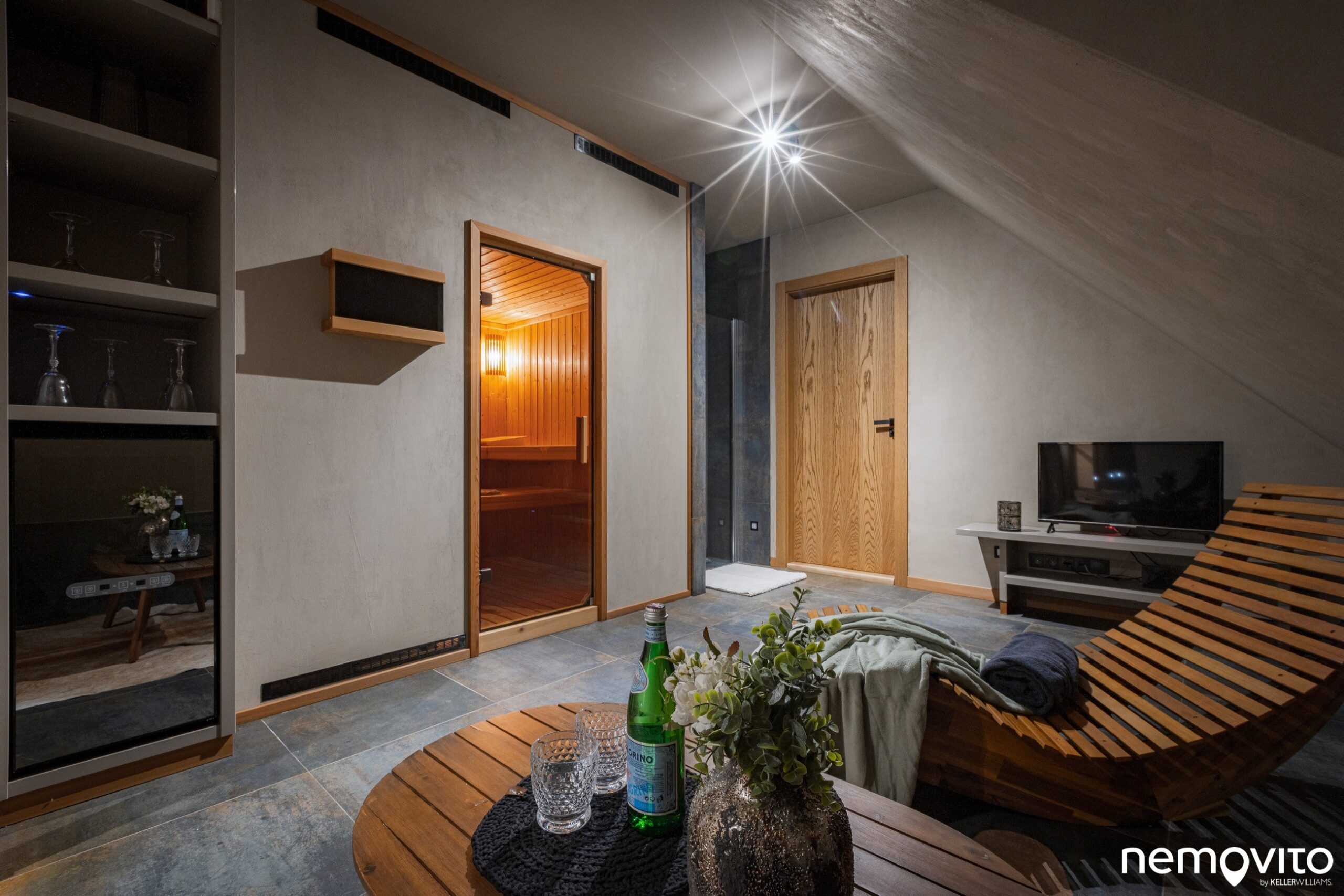 Mimo finské sauny se z jedné strany nachází sprcha, z té druhé pak must-have opravdového požitkáře - vinotéka. Takže dvě lehátka, víno, sauna, sprcha - možná zbytek domu ani nepotřebujete, co? 🙂