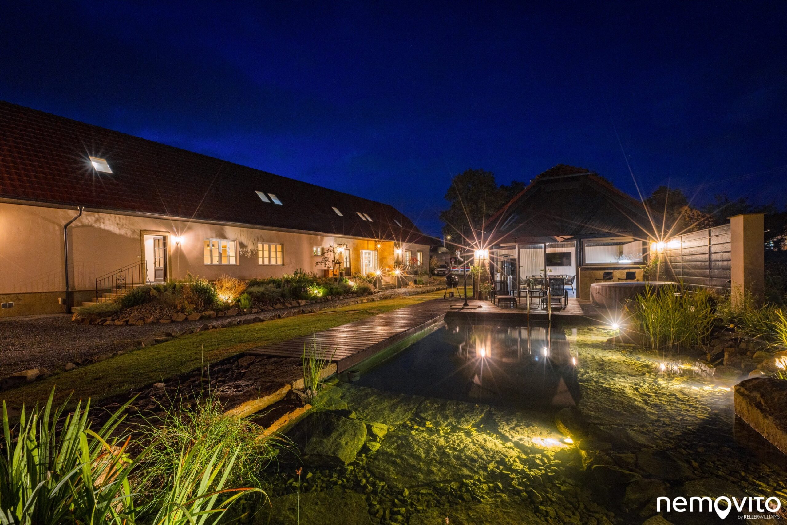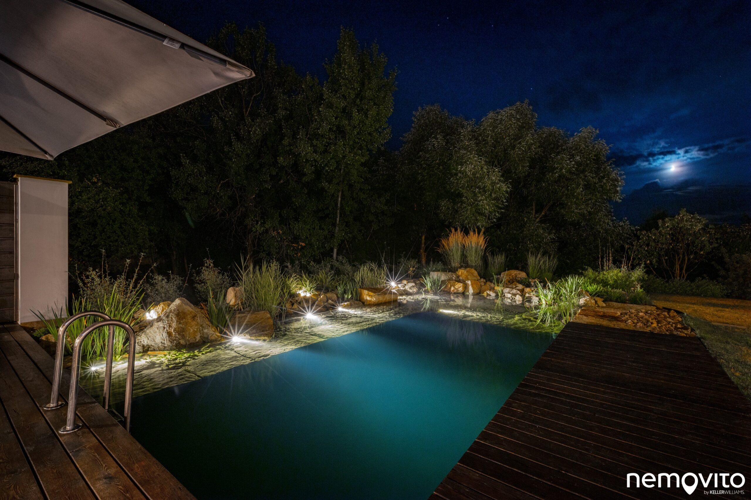 Ve dne v noci vypadá naprosto perfektně. Přírodní osvěžení, které hlavně v letních měsících přijde vhod, se skládá ze dvou částí - hluboké koupací a mělké navazující, ve které se mezi kameny nachází vodní rostliny. Voda je filtrována technologií, která je ukryta v zahradním domku.