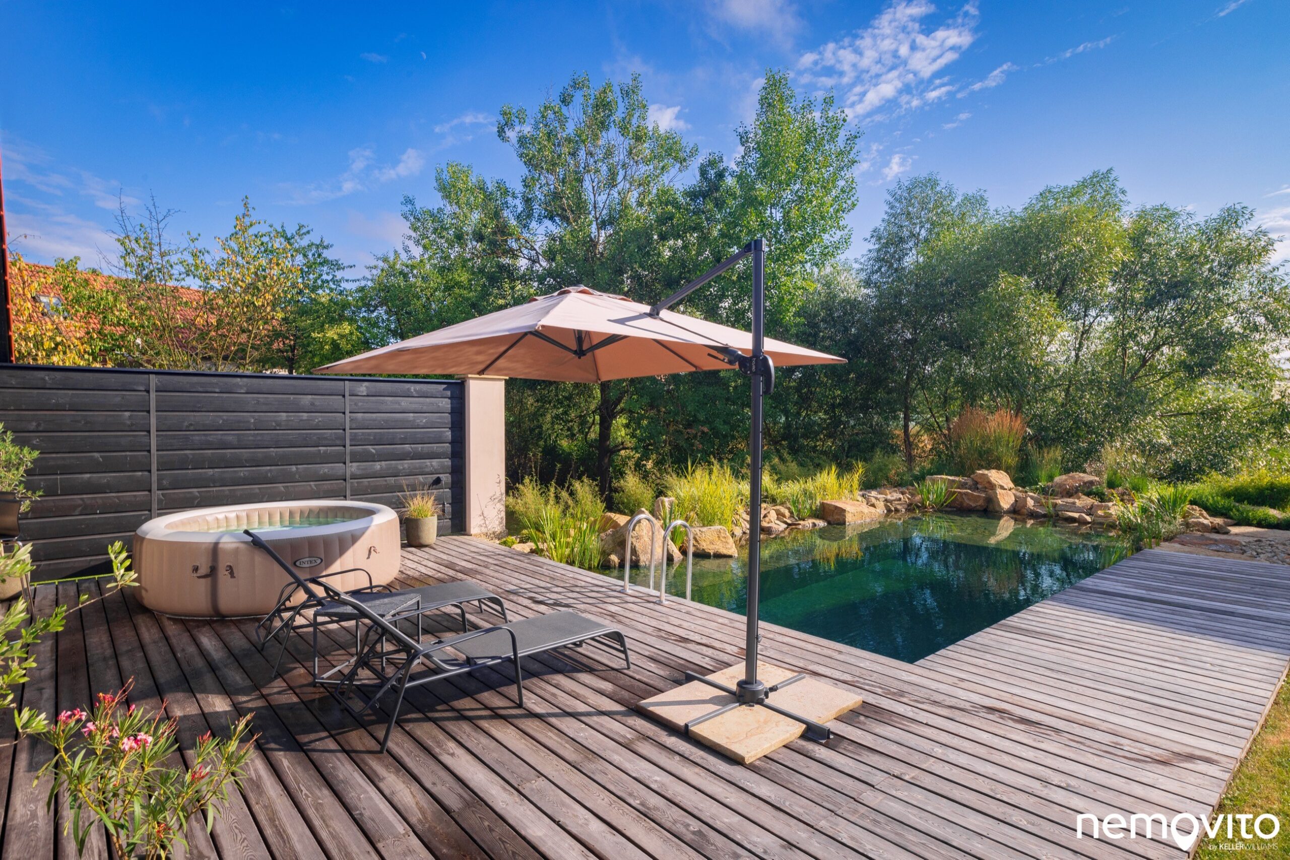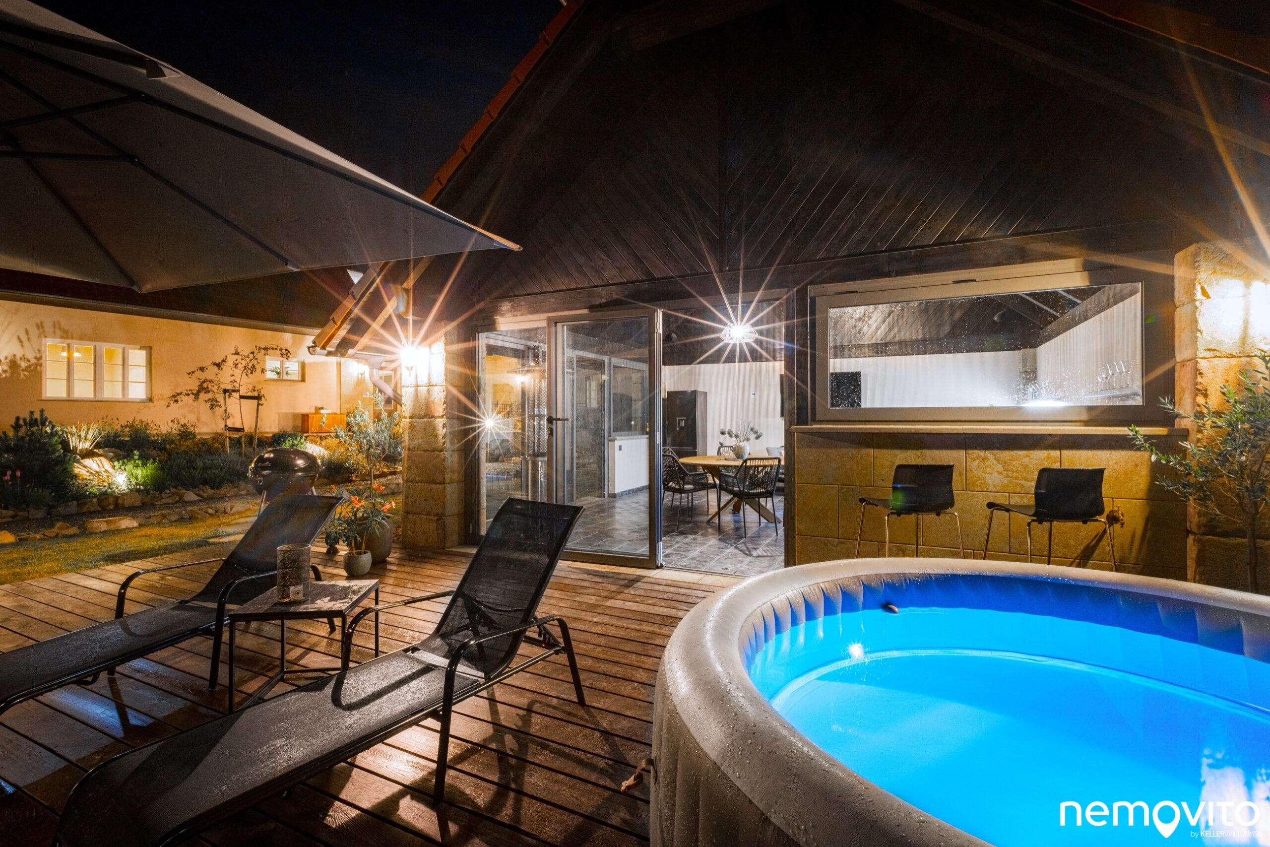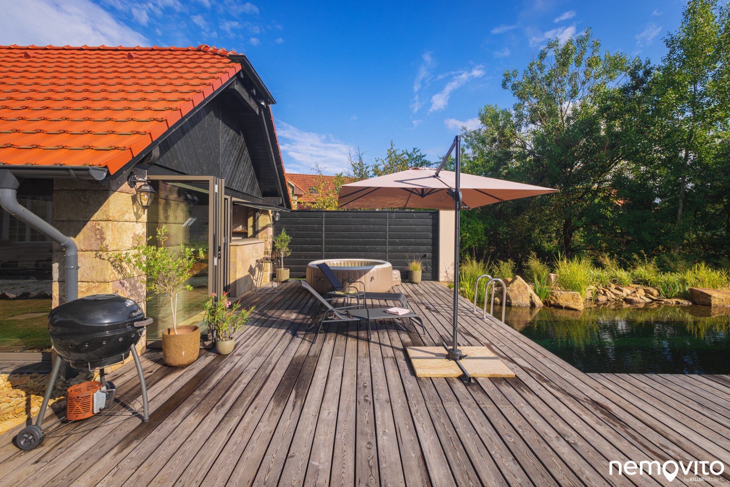 Propojení grilovacího zázemí s biotopem je řešeno přes dřevěnou terasu, na které je vyhrazené místo pro umístění vířivky.