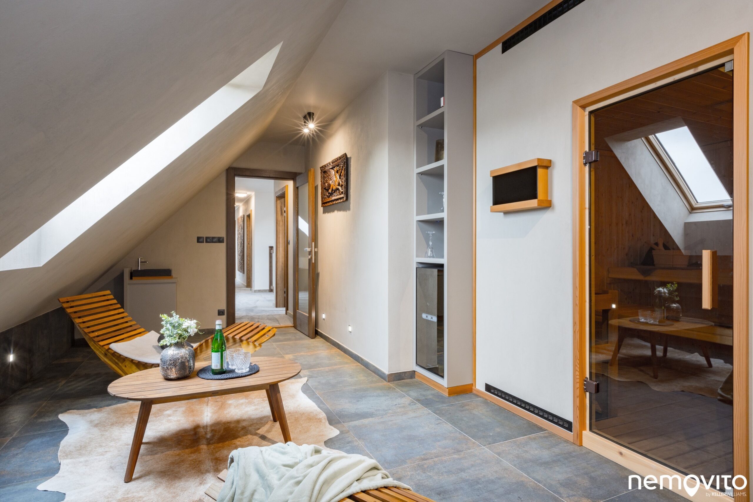Teď se ale přesuneme do horního podlaží, kde nás čekají ložnice a překvapení pro milovníky saunování.