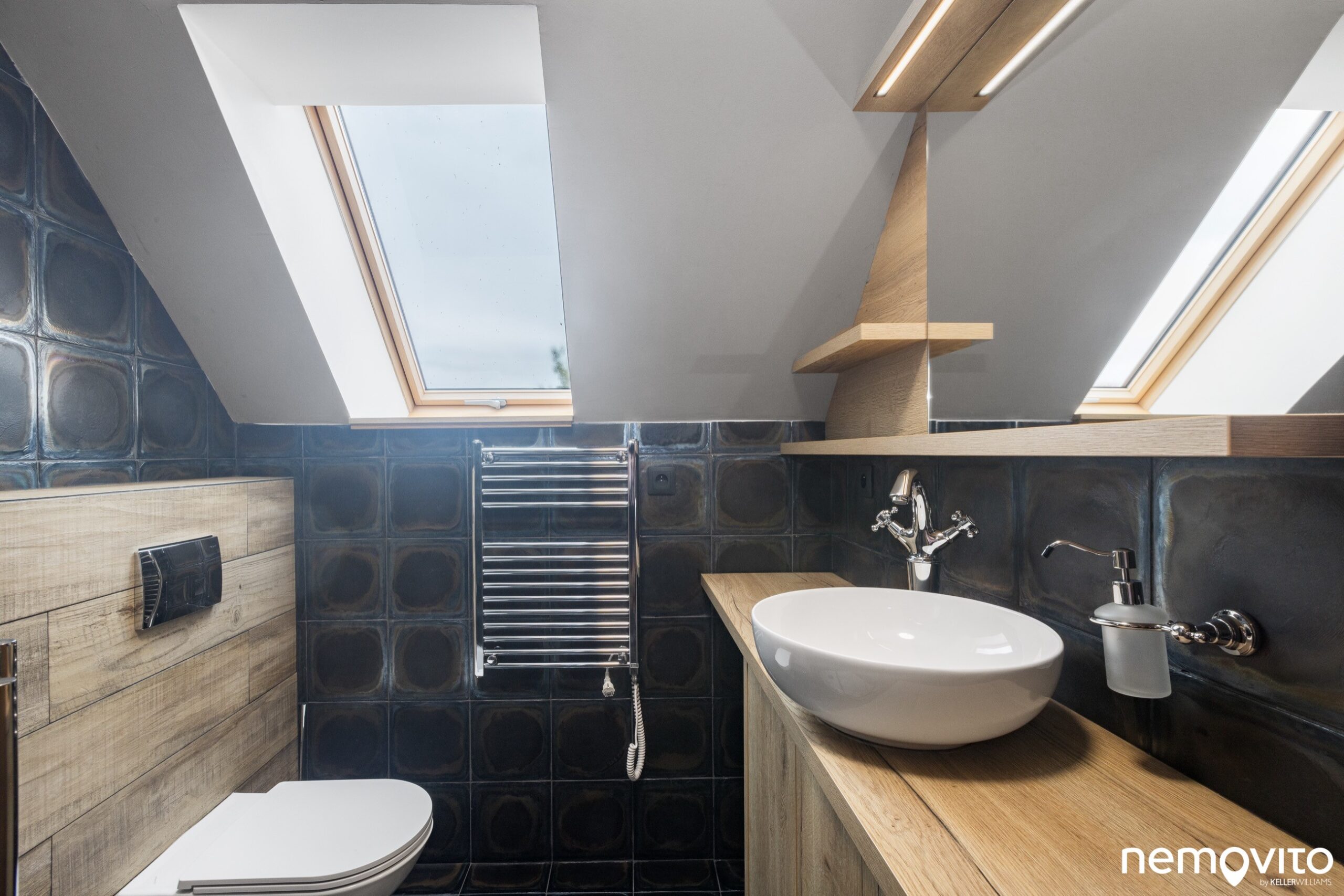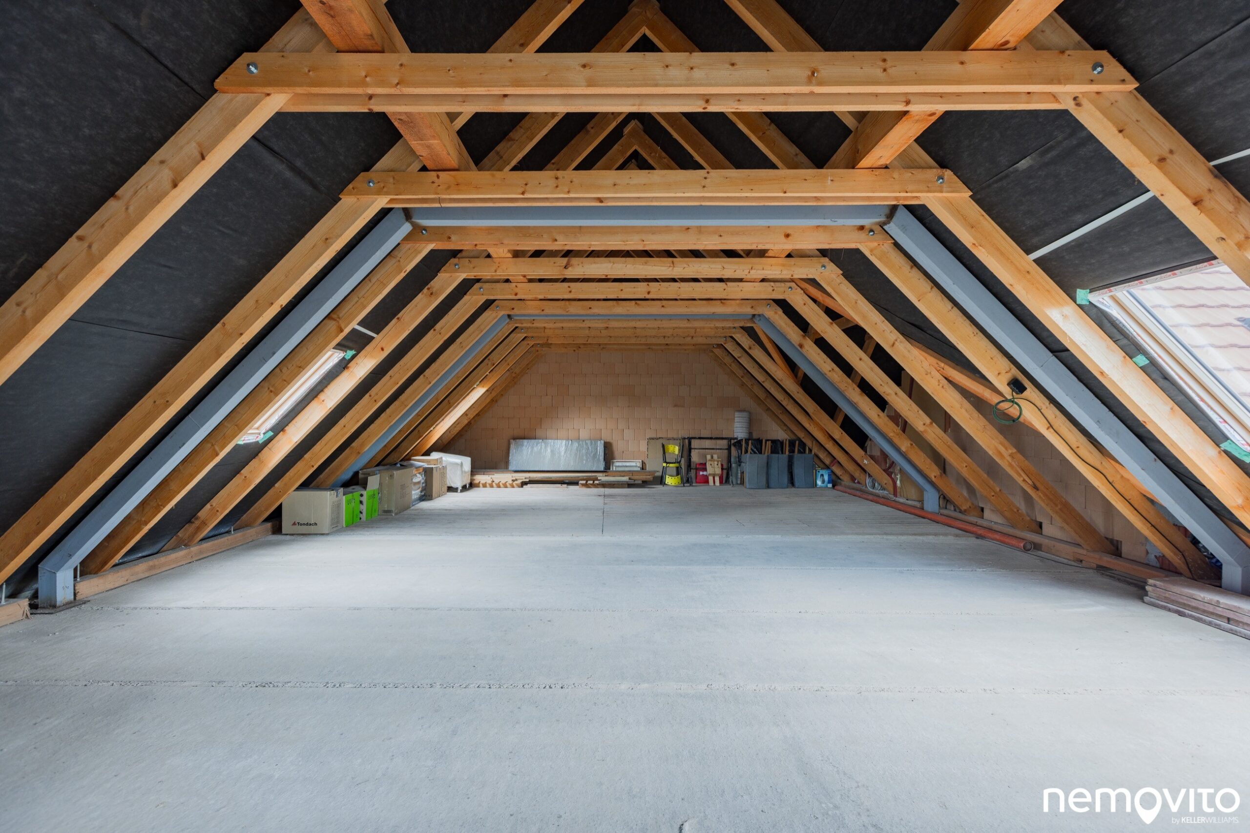 Až vás to chytne, nebudete muset běžet přes půl pozemku. Samostatné WC se totiž nachází přímo v garáži. Ta má schované ještě jedno eso v rukávu, kterým je obrovský půdní prostor. V něm mělo původně vzniknout nahrávací studio, ale finální podoba zůstává otevřená vaší fantazii a potřebám. Půdorysná plocha je přes 130 m2. K dispozici je voda i odpad.