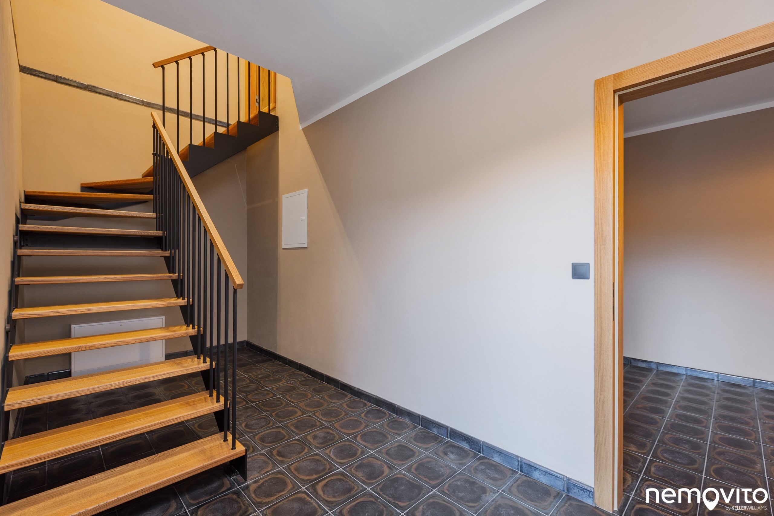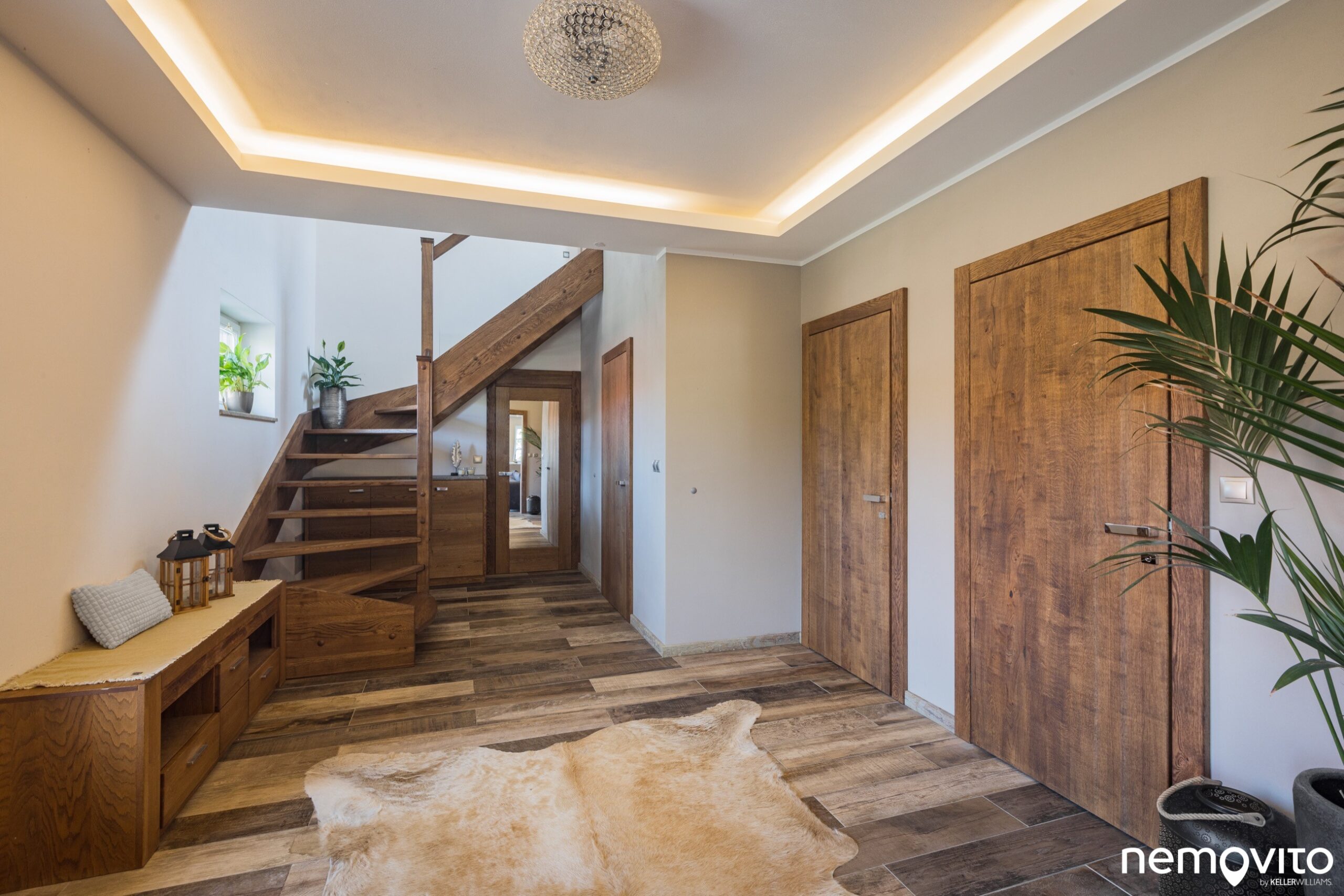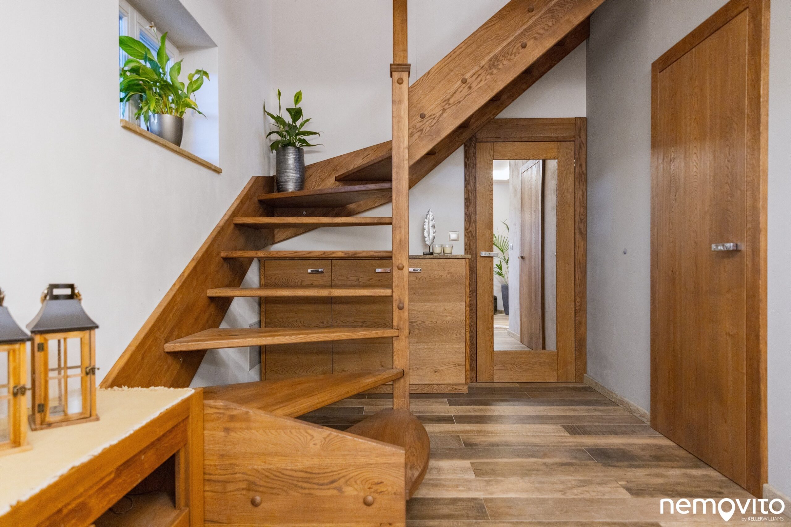 Horní jednotka je přístupná přes samostatné schodiště, které je od hlavní části domu (4+kk) odděleno. Předsíň má vlastní vstup zvenčí a je společná pro obě jednotky. Vaši hosté nebo nájemci tak mají prostor pro schování kočárku přímo za dveřmi bytu.