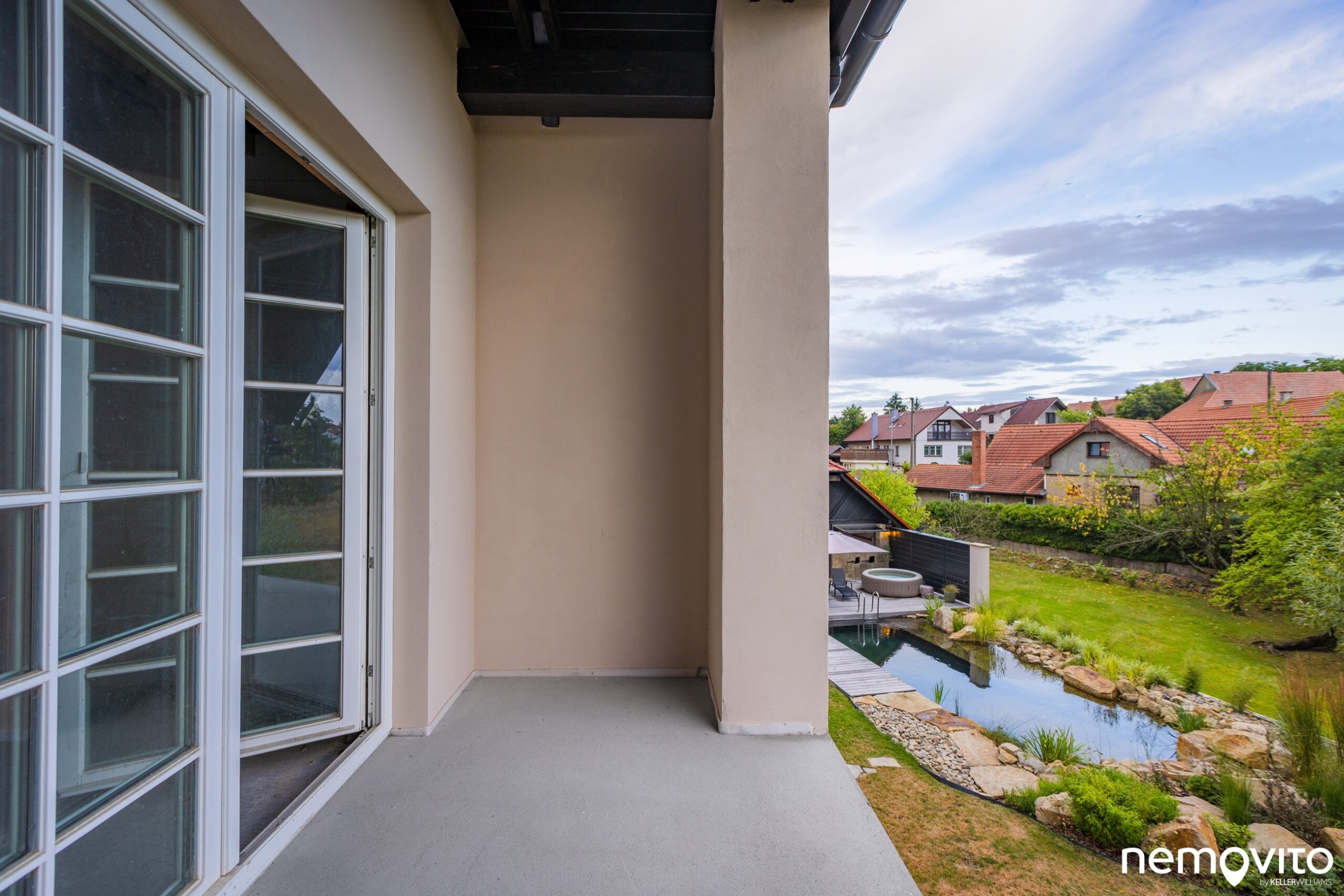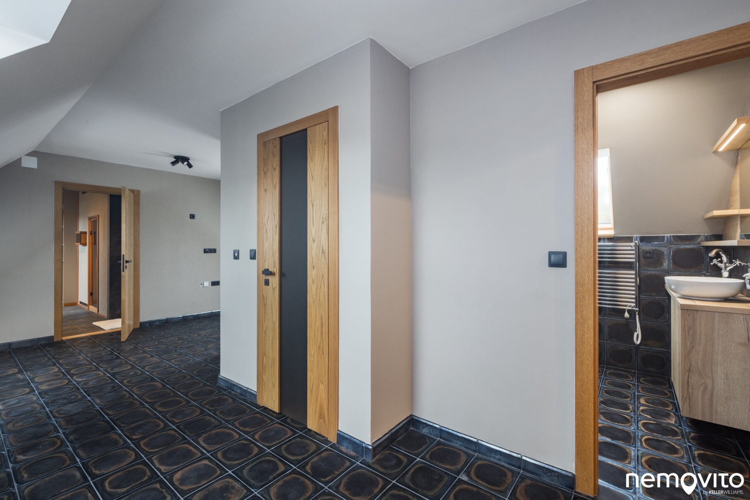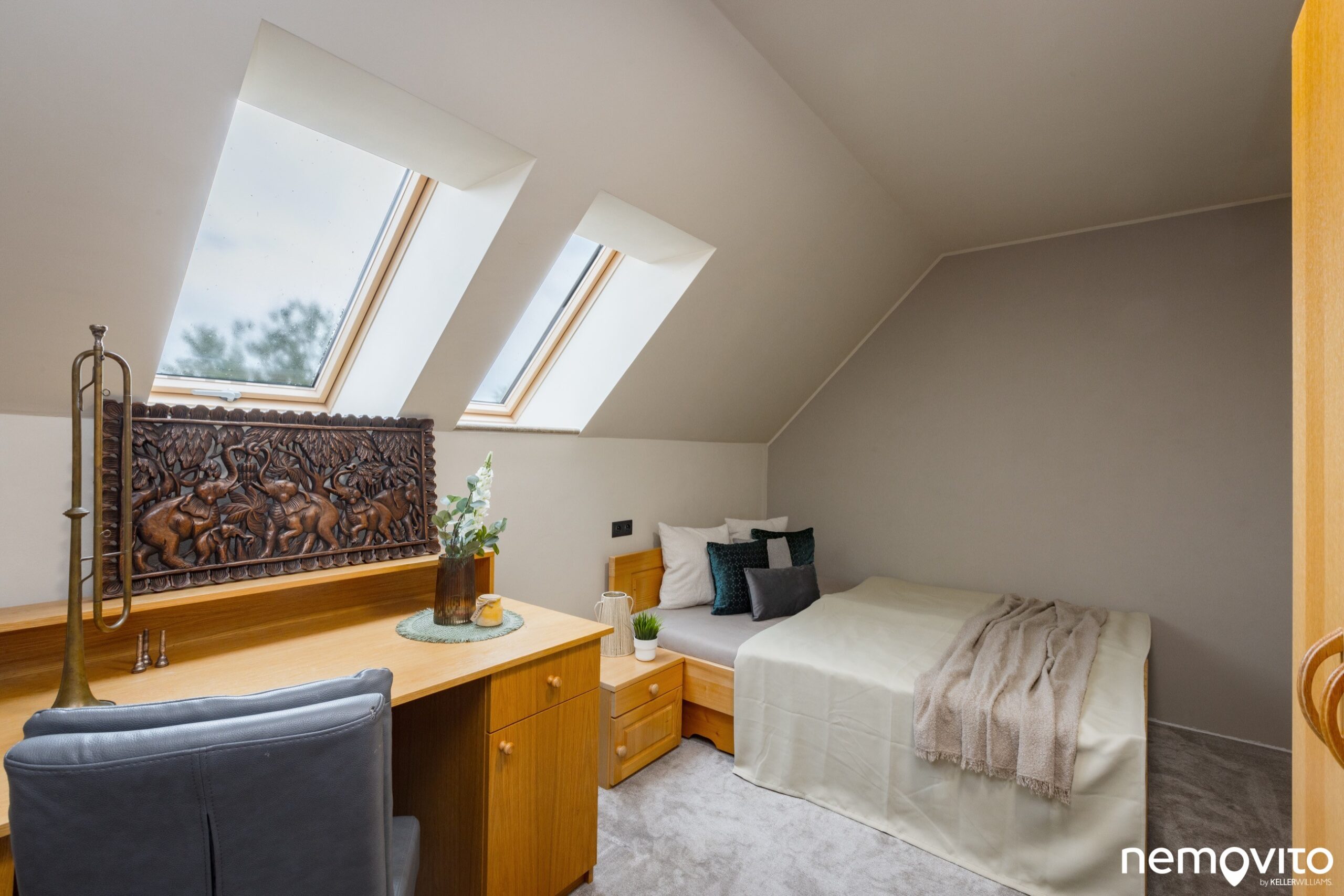 Horní jednotka je přístupná přes samostatné schodiště, které je od hlavní části domu (4+kk) odděleno. Předsíň má vlastní vstup zvenčí a je společná pro obě jednotky. Vaši hosté nebo nájemci tak mají prostor pro schování kočárku přímo za dveřmi bytu.