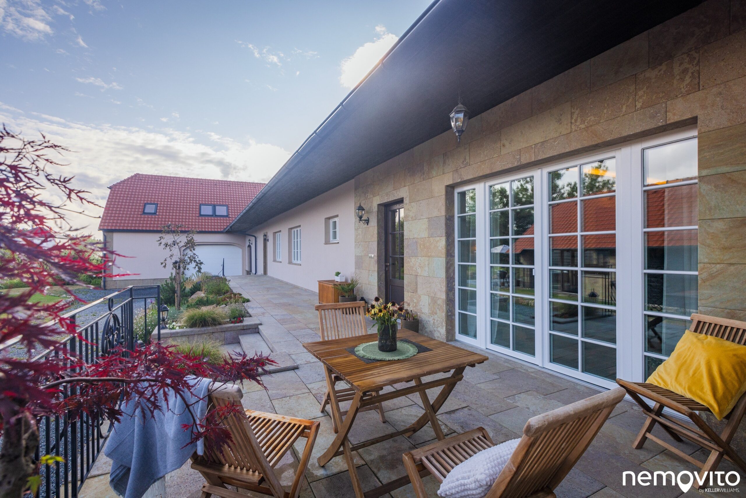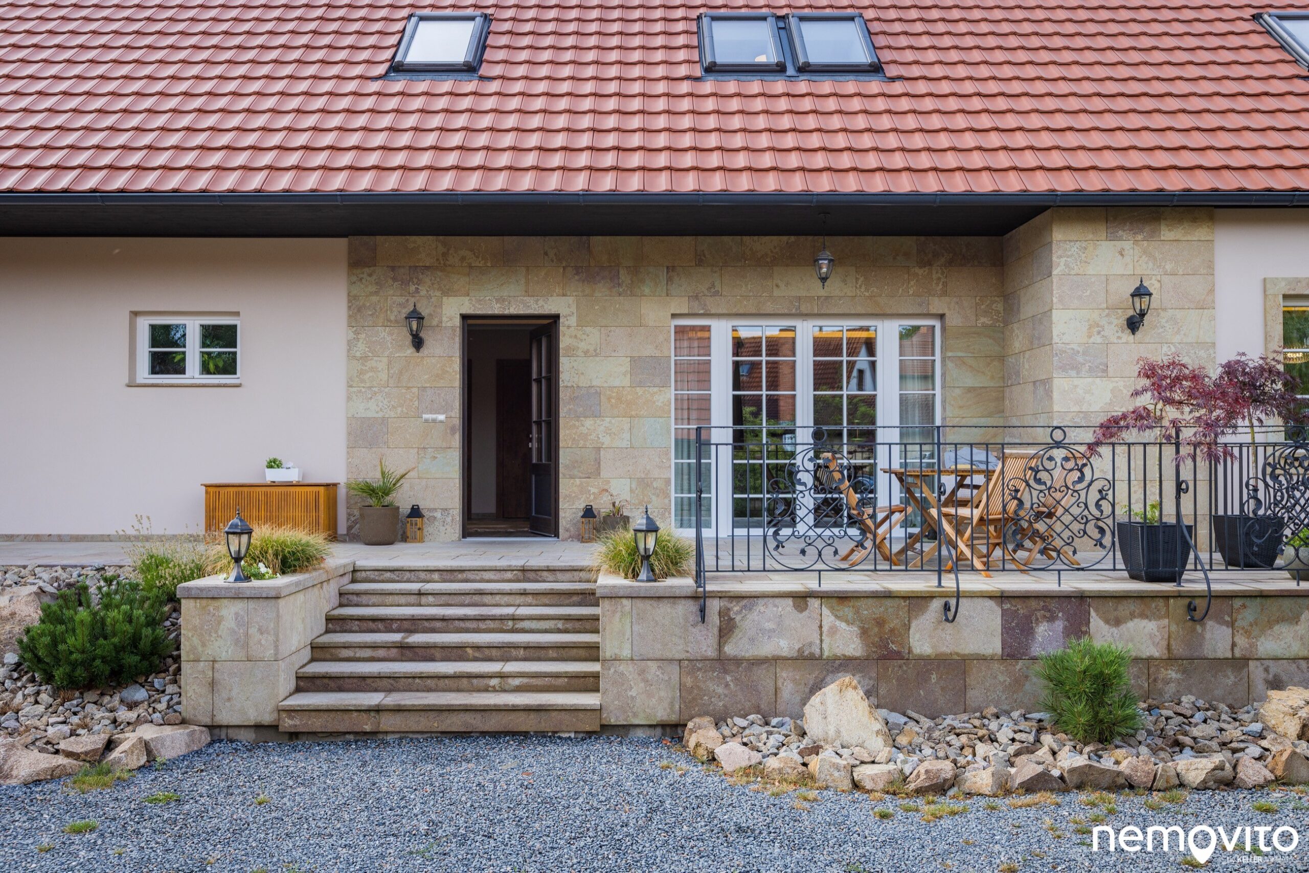 Vstupu do hlavního domu vévodí jižně orientovaná terasa s velkým oknem do obývacího pokoje.