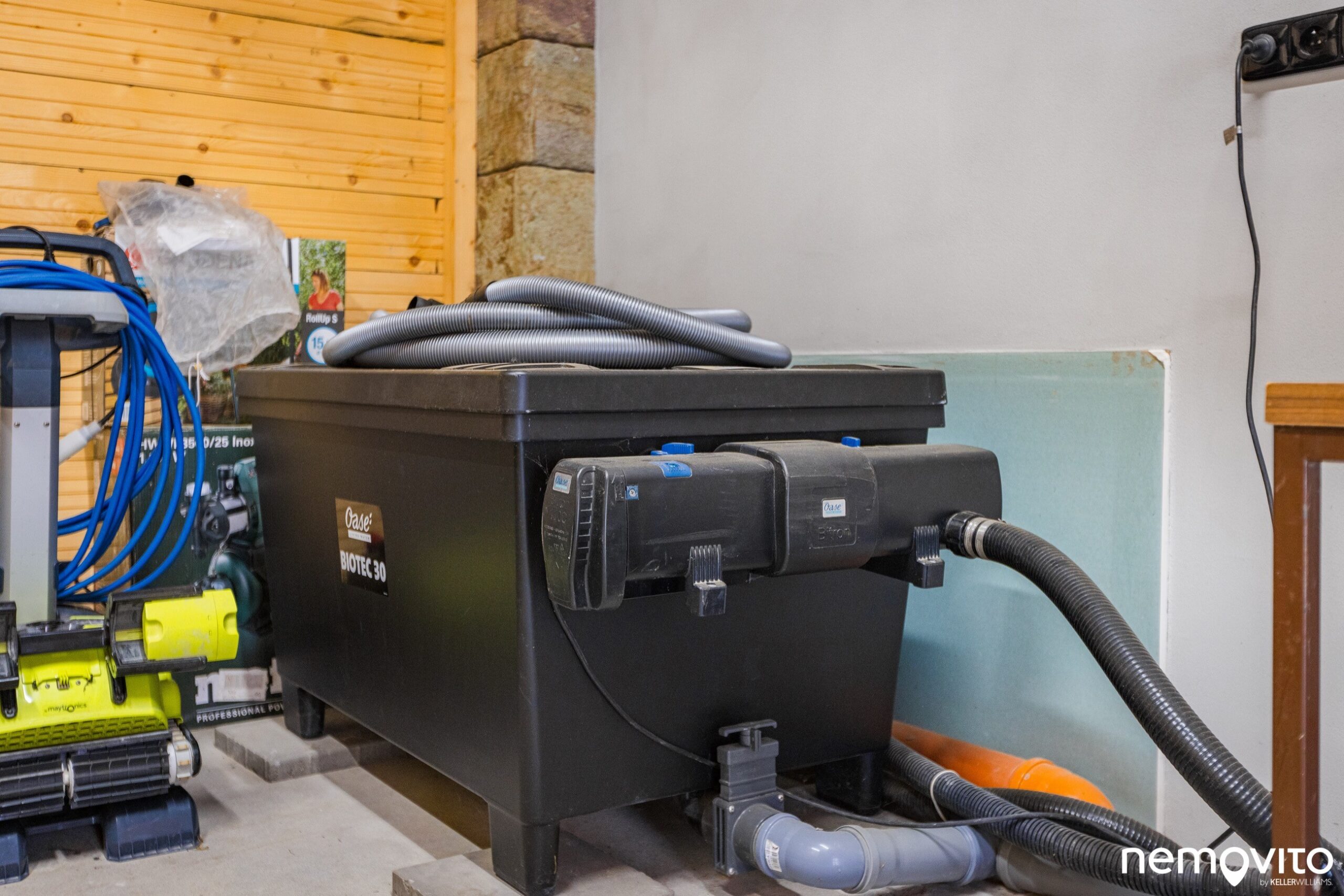 Druhou částí zahradního domku je pak prostor o ploše 29 m2, který funguje jako místo pro uskladnění zahradního náčiní nebo kol a hraček dětí. Nachází se zde také technologie k filtrování vody biotopu. Ten žádnou zásadní údržbu nevyžaduje, v zásadě se udržuje pouze hladina pH prostřednictvím bakterií. Voda se z něj vypouští zpravidla jednou za 3 - 5 let dle míry užívání.