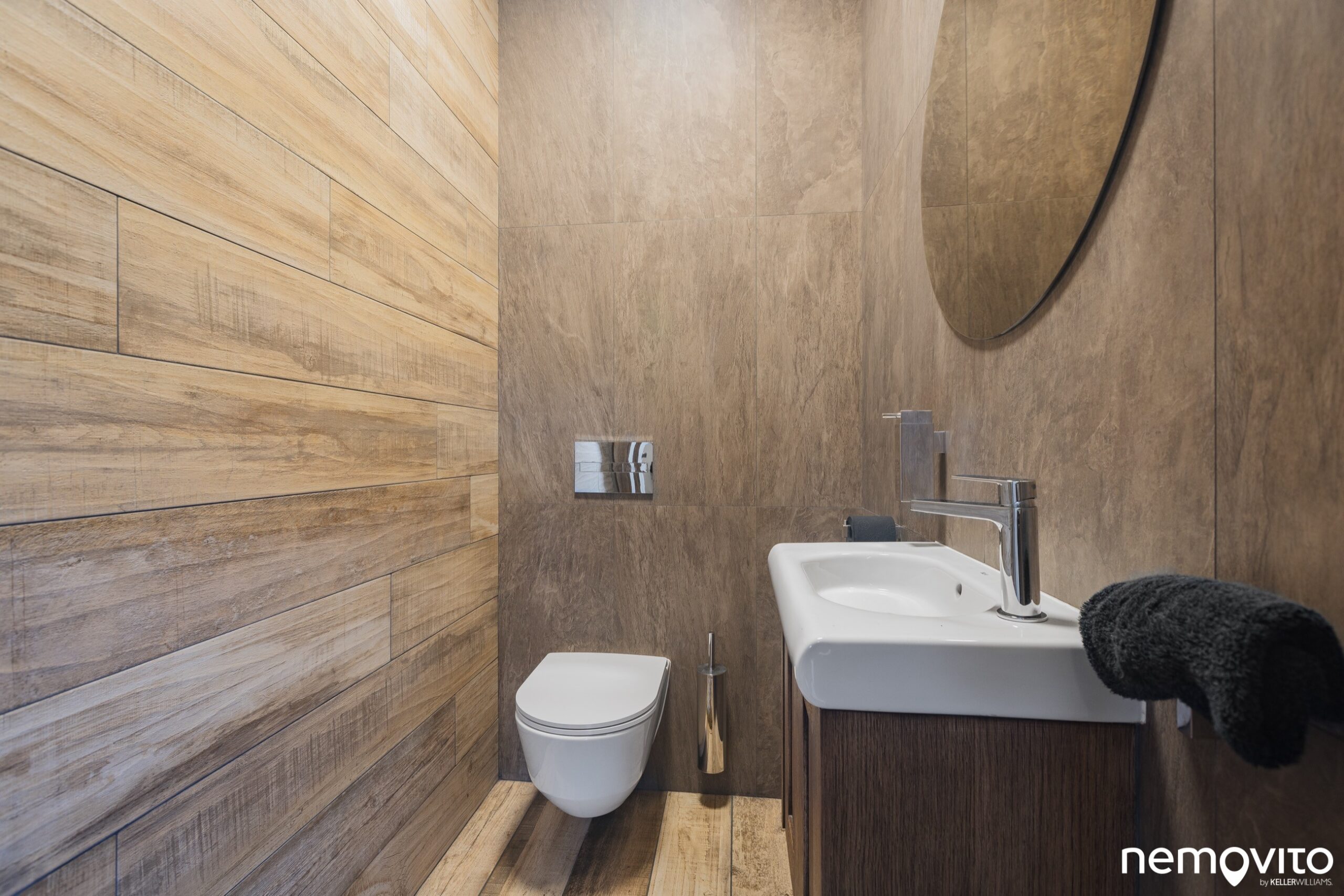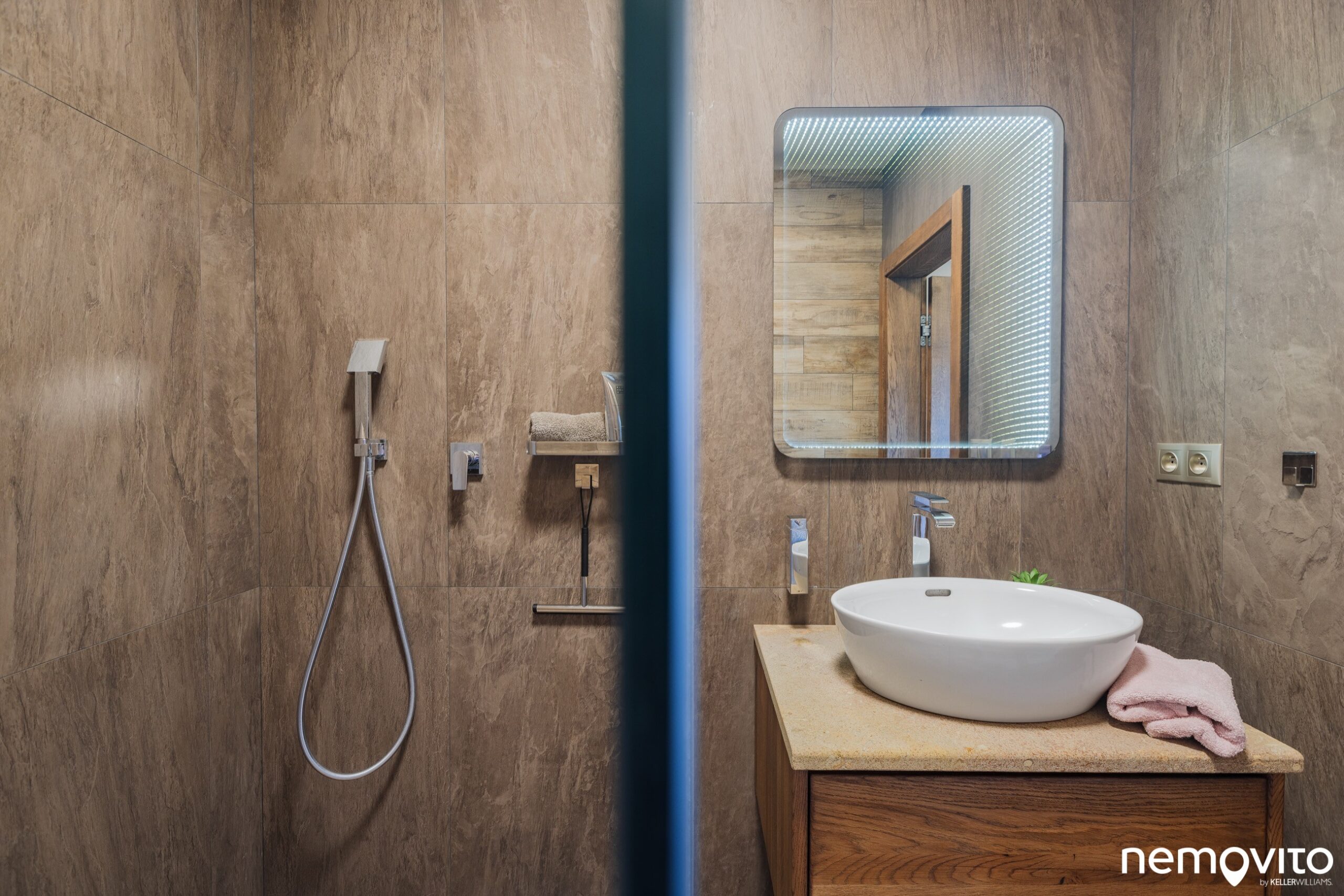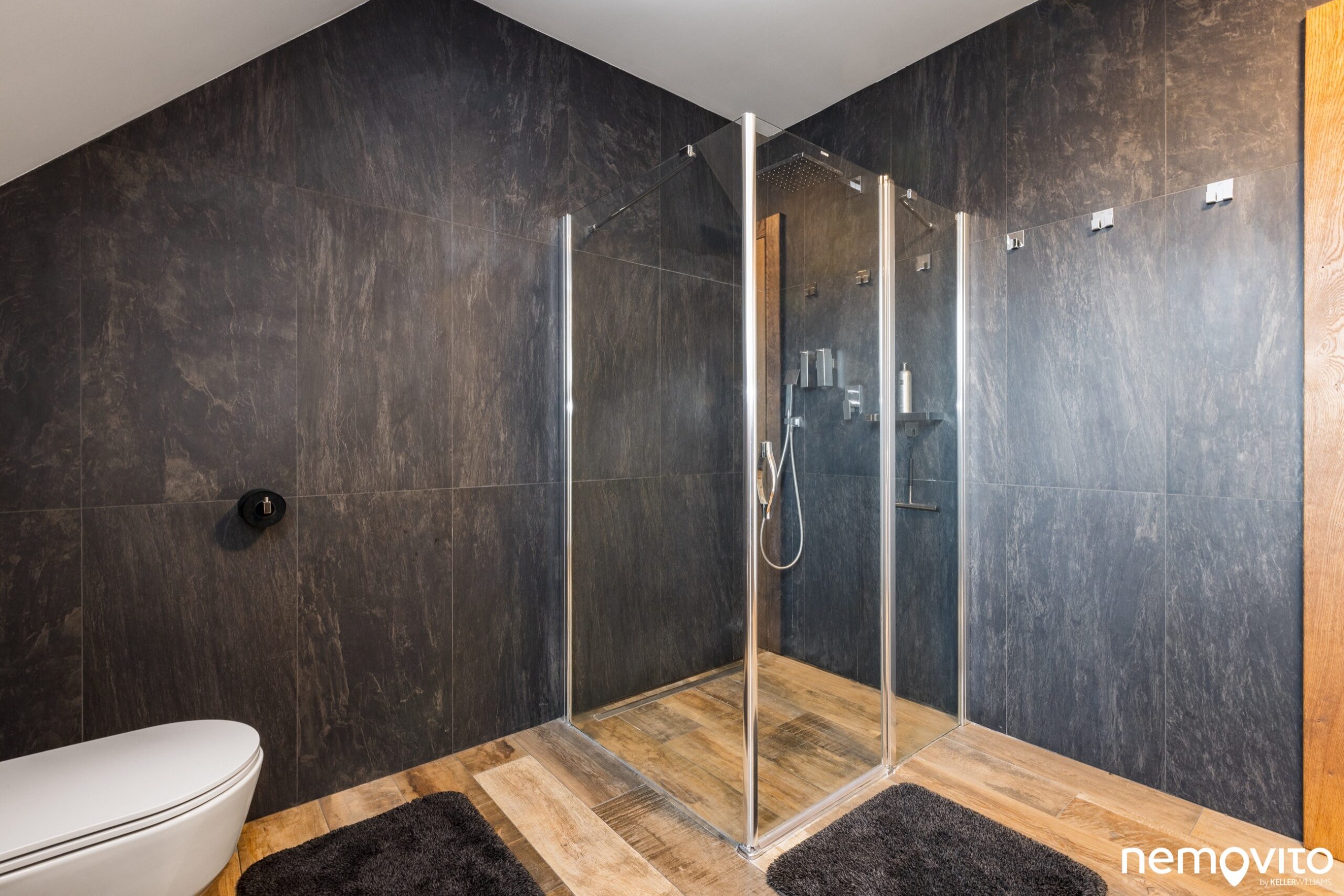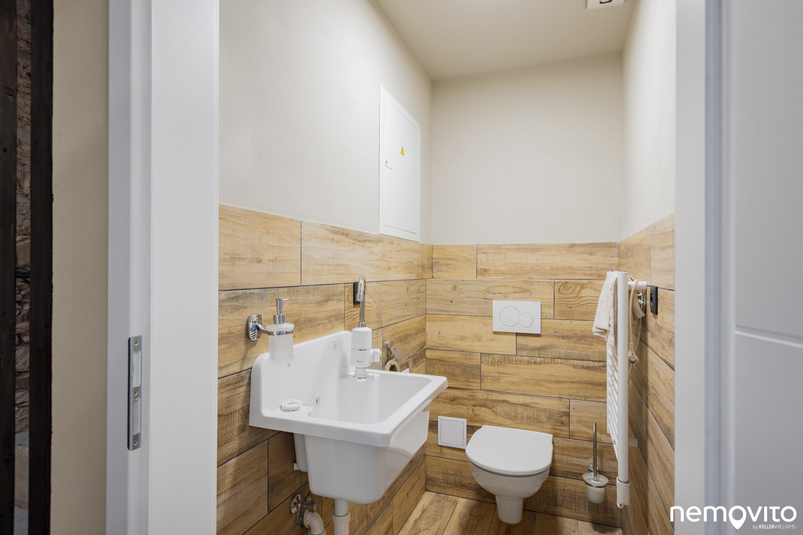 Přímo z chodby je totiž přístupná toaleta a taktéž spodní koupelna, která je vybavena sprchovým koutem. Obklad tvoří velkoformátová dlažba.