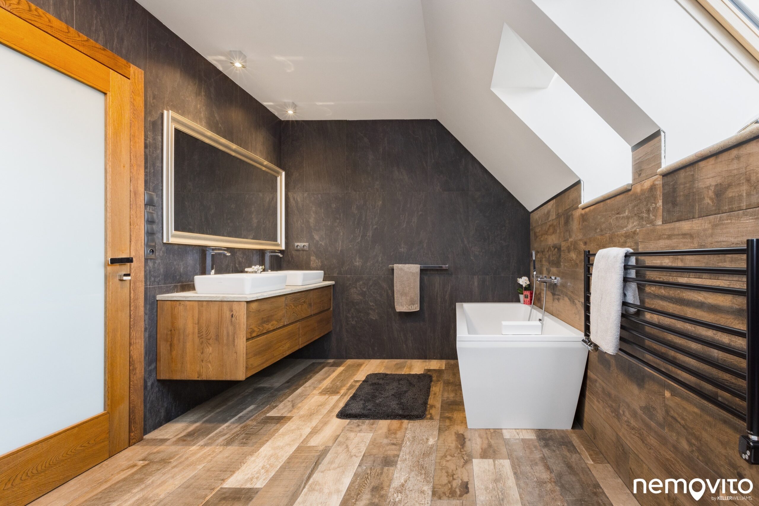 I koupelna druhé jednotky je provedena v obkladu, který navazuje na podlahy. Rustikální, přesto moderní a svěží.