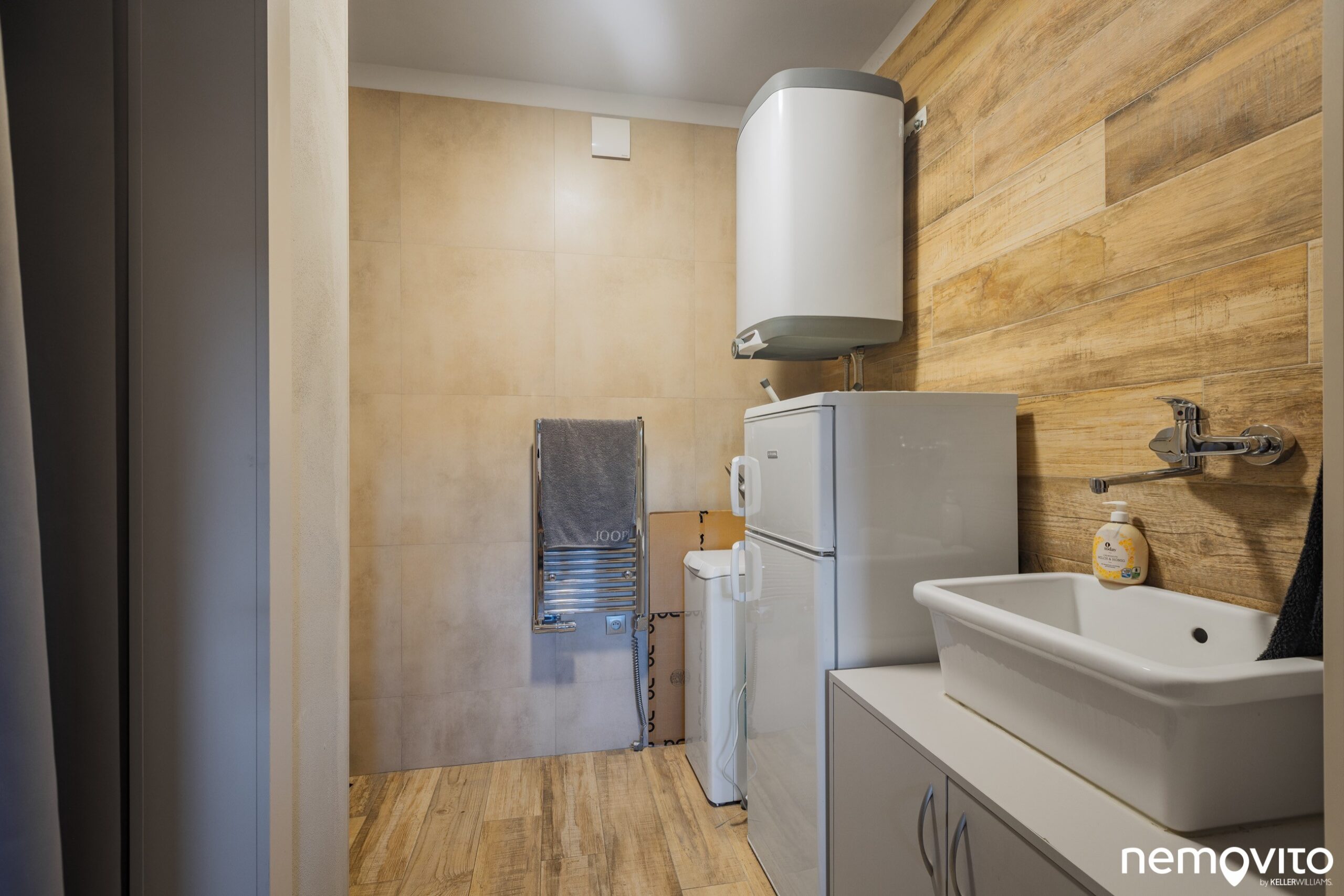 Třetí dveře jsou pak do technické místnosti, ve které je ukrytá prádelna, další lednice a také zázemí pro mytí vašich domácích mazlíčků - další velká otevřená sprcha. Poslední dveře se zrcadlem jsou fígl - jedná se o vestavěnou skříň, kterou je vyplněný otvor mezi hlavní částí 4+kk a sousedním menším 2+kk. Pokud byste tedy chtěli tyto části propojit spodem, otvor je již připravený a stačí vyndat skříň.