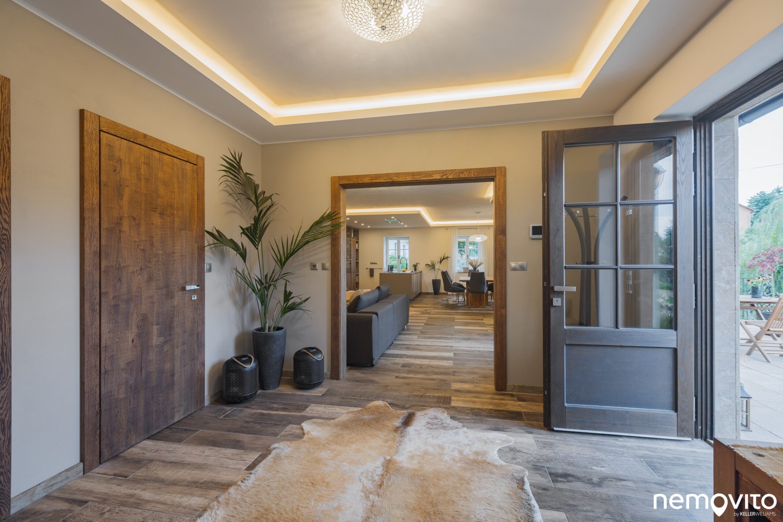 Interiérové dveře jsou sladěné do jednotného designu. Jsou bezfalcové (schované panty) a stejně jako obložky jsou dubové. Za obývákem vás na chodbě čekají rovnou troje.