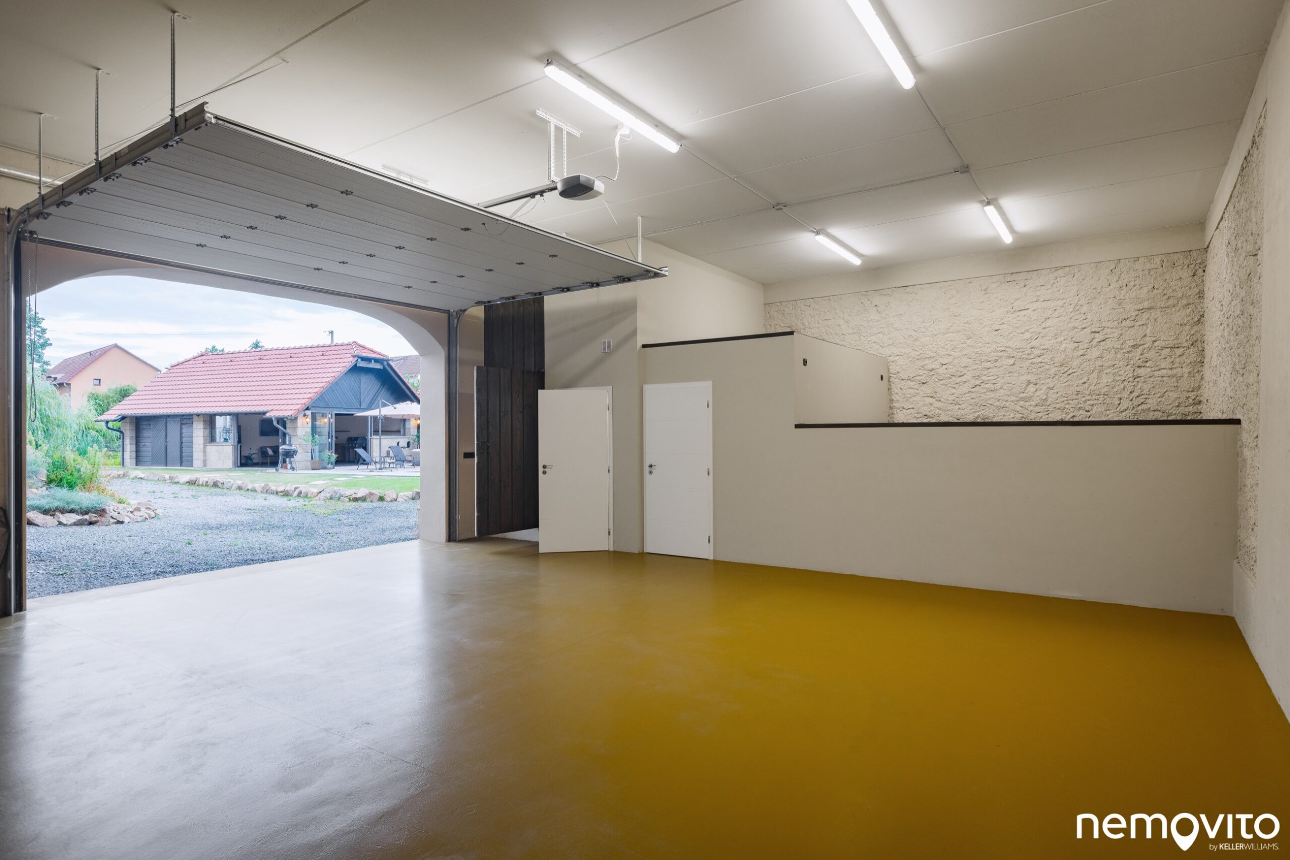 To ale není všechno. Ještě jsme nebyli tam, kde zaplesá srdce každého fanouška motorových mazlíčků. Garáž se zcela rovnou a omyvatelnou podlahou nabízí plochu, a teď se podržte, přes 120 m2! Vrata mají výšku 4 metry, do garáže se tedy vejde i obytný vůz nebo vlek s lodí. Ke hladině slapské nádrže je to totiž zhruba 18 km.
