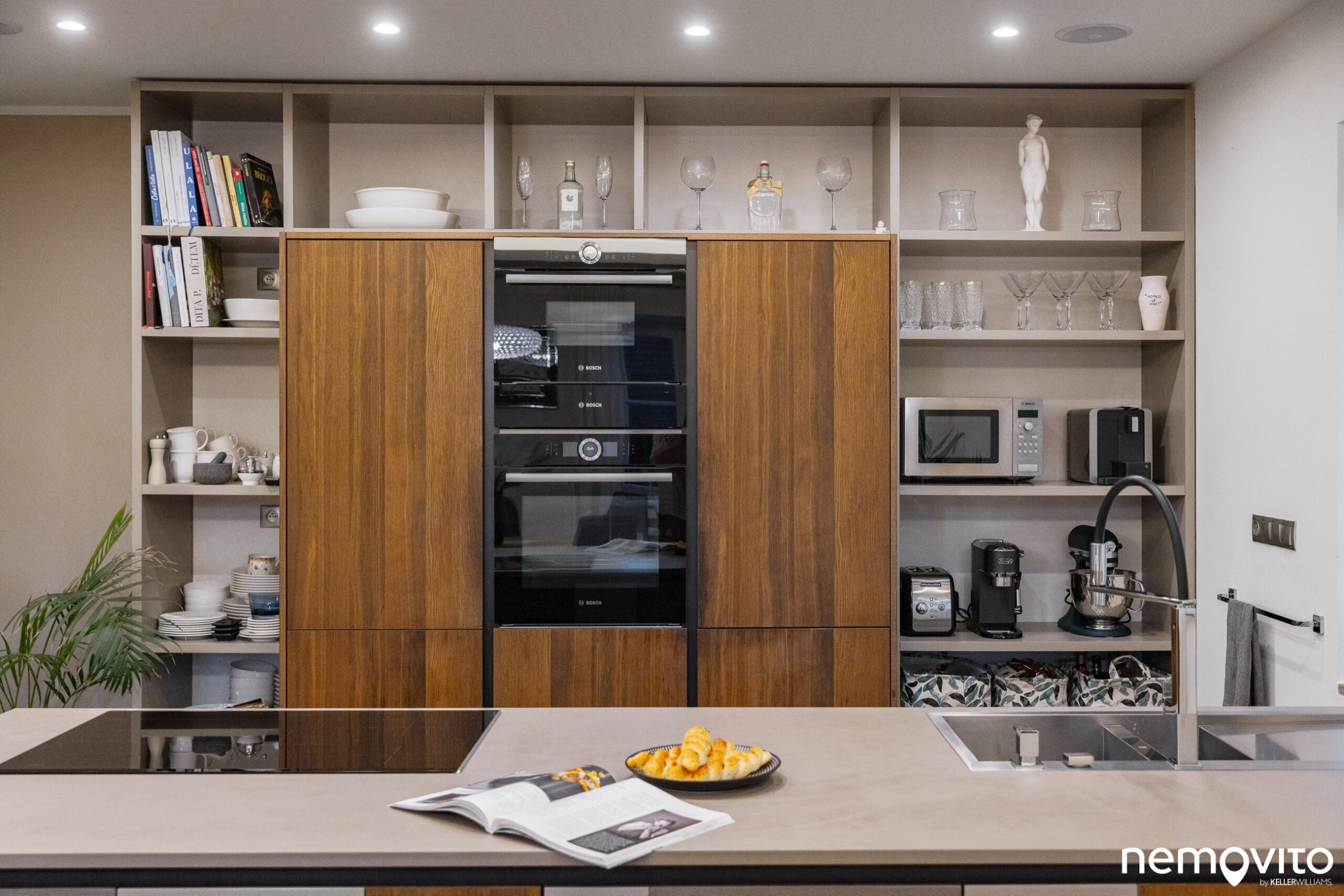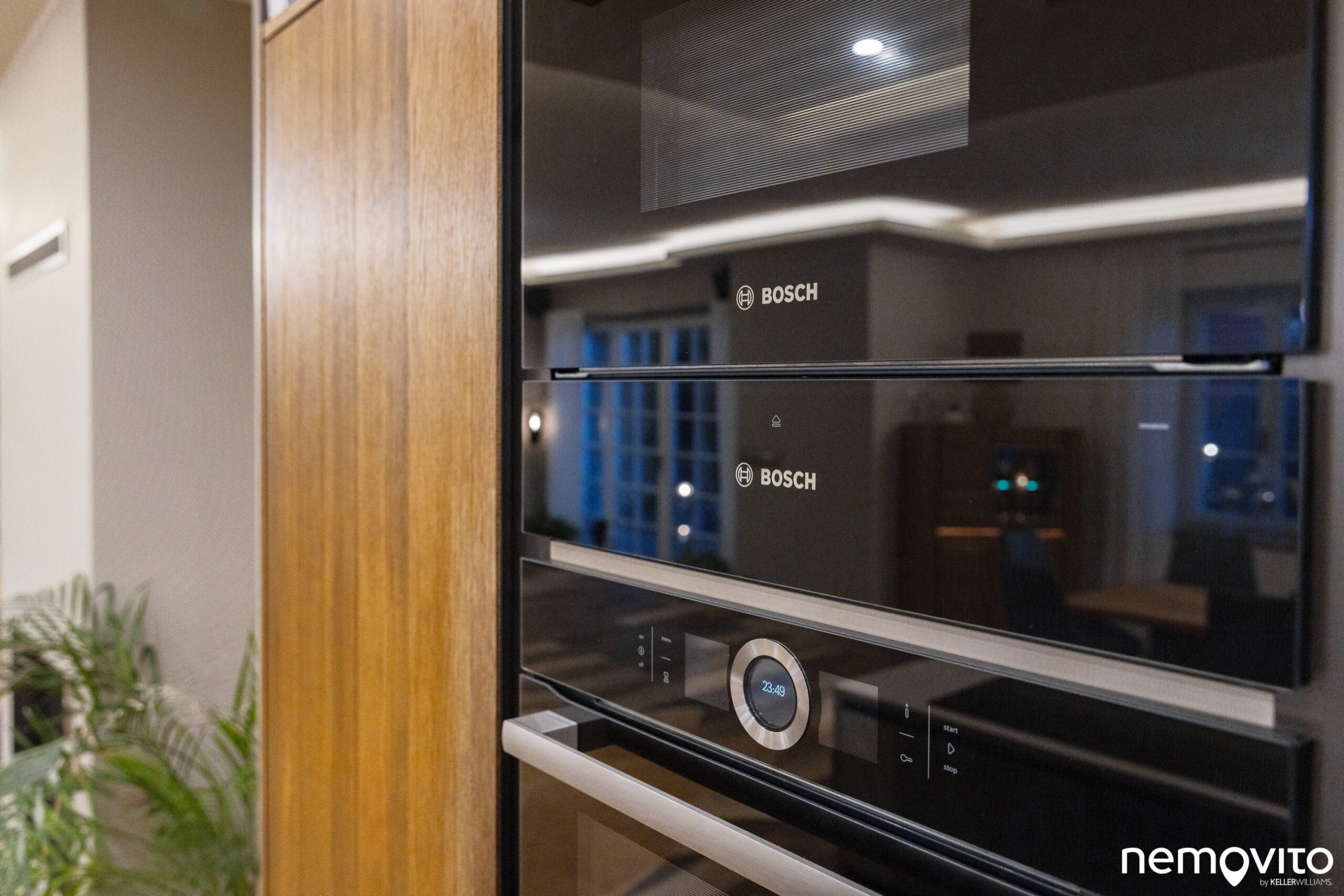 Linka je pochopitelně vybavena všemi nutnými spotřebiči. Zastoupené jsou vyšší řady spotřebičů BOSCH. Jsou pochopitelně zcela nové a nepoužívané. Odsavač par je ukrytý v podhledu s osvětlením a nehyzdí tedy volný průhled mezi linkou a jídelním stolem.