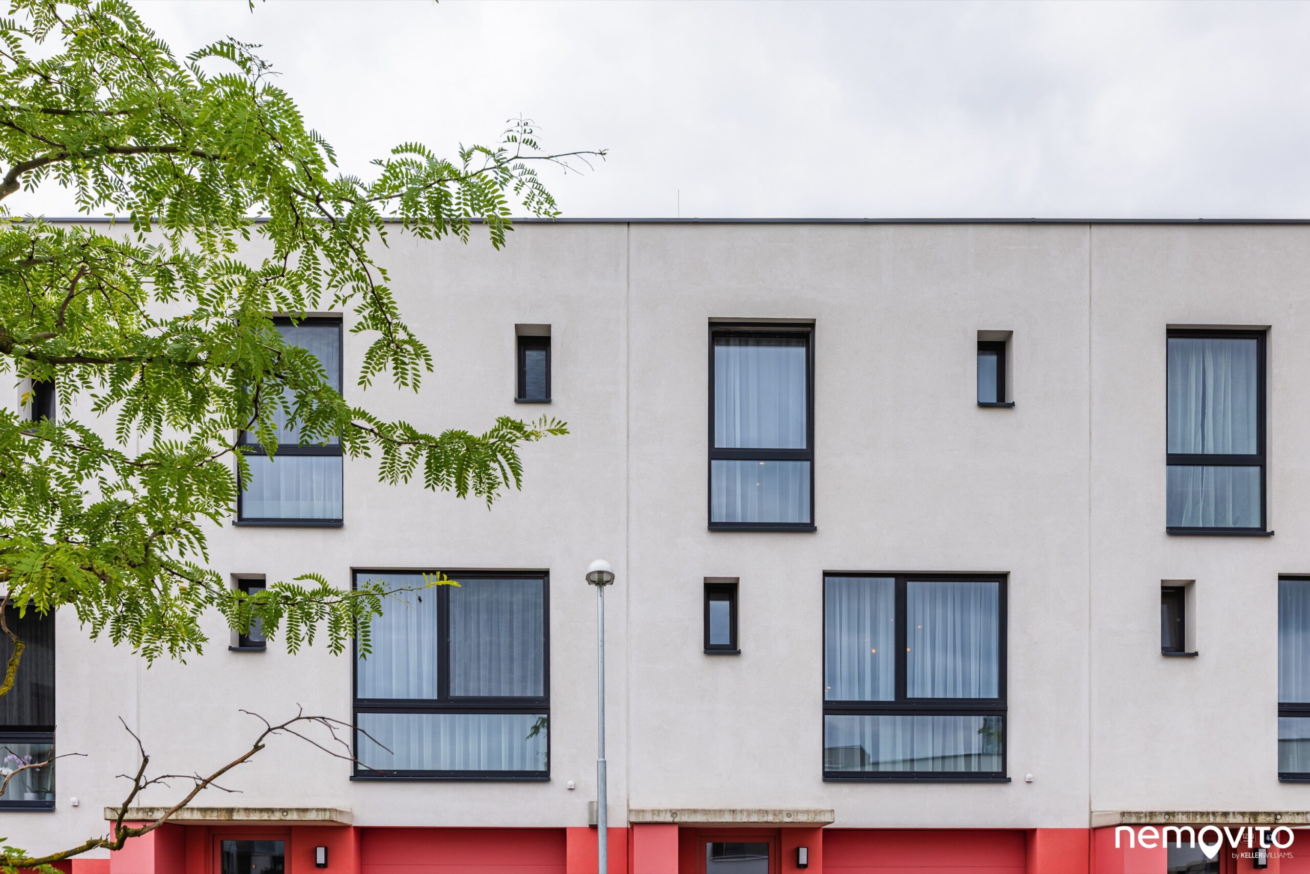 Na severní straně pak stínění nutné není. Celý řadový dům je v jednotné architektuře a provedení. Domy od sebe poznáte podle barevného pásu v úrovni garáže. Adresu si tedy pamatovat úplně nemusíte - k nám jedete do červeného/růžového. U domu je pak jedno vyhrazené stání v řadě naproti. Dobře řešené je i odpadové hospodářství - domy mají vlastní popelnice bokem a mimo zorné pole.