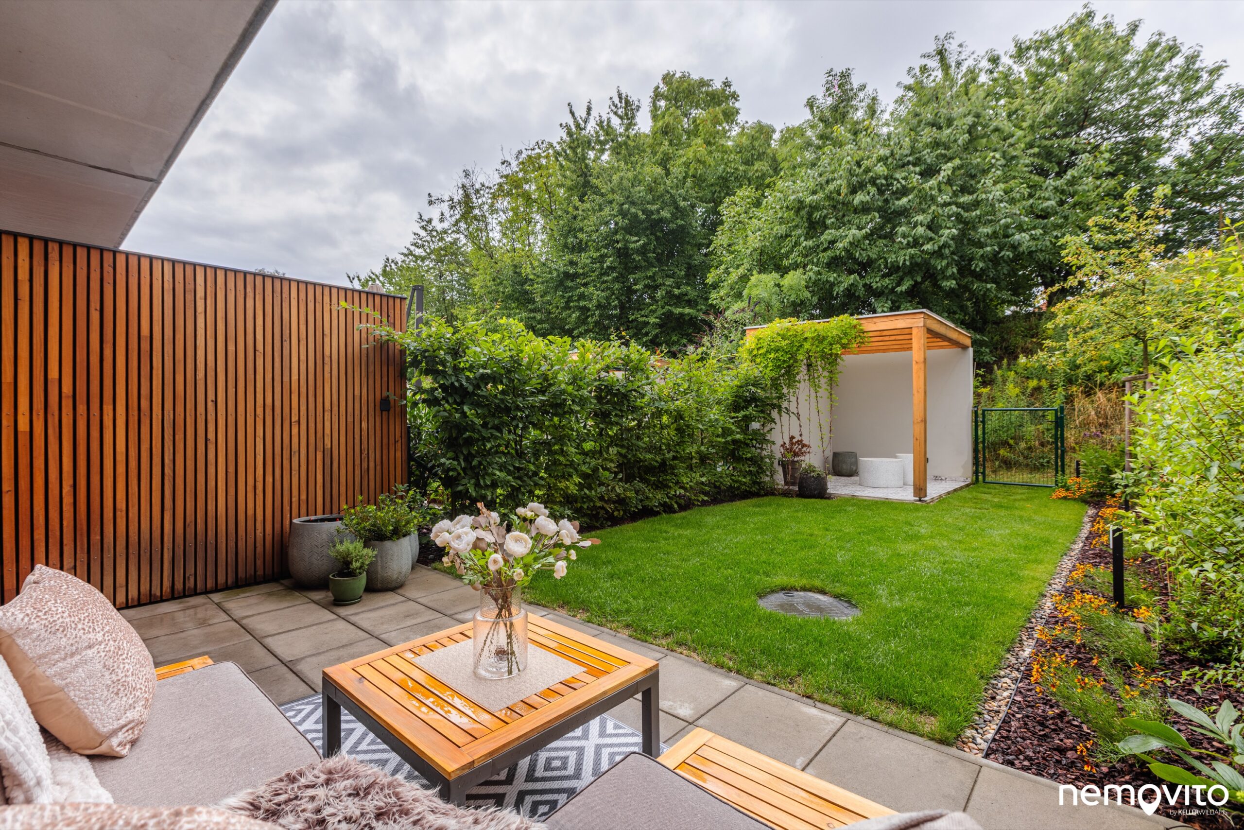 Voda tedy bude špičková, zejména pak pokud ji budete popíjet tady (případně vodu lehce zkvašenou či jinak upravenou). Posezení na zahrádce je opravdu příjemné a výhled je doslova zenový. Od sousedů jste odstínění dřevem obloženými stěnami a vašich 59,4 m2 je tak překvapivě klidných.