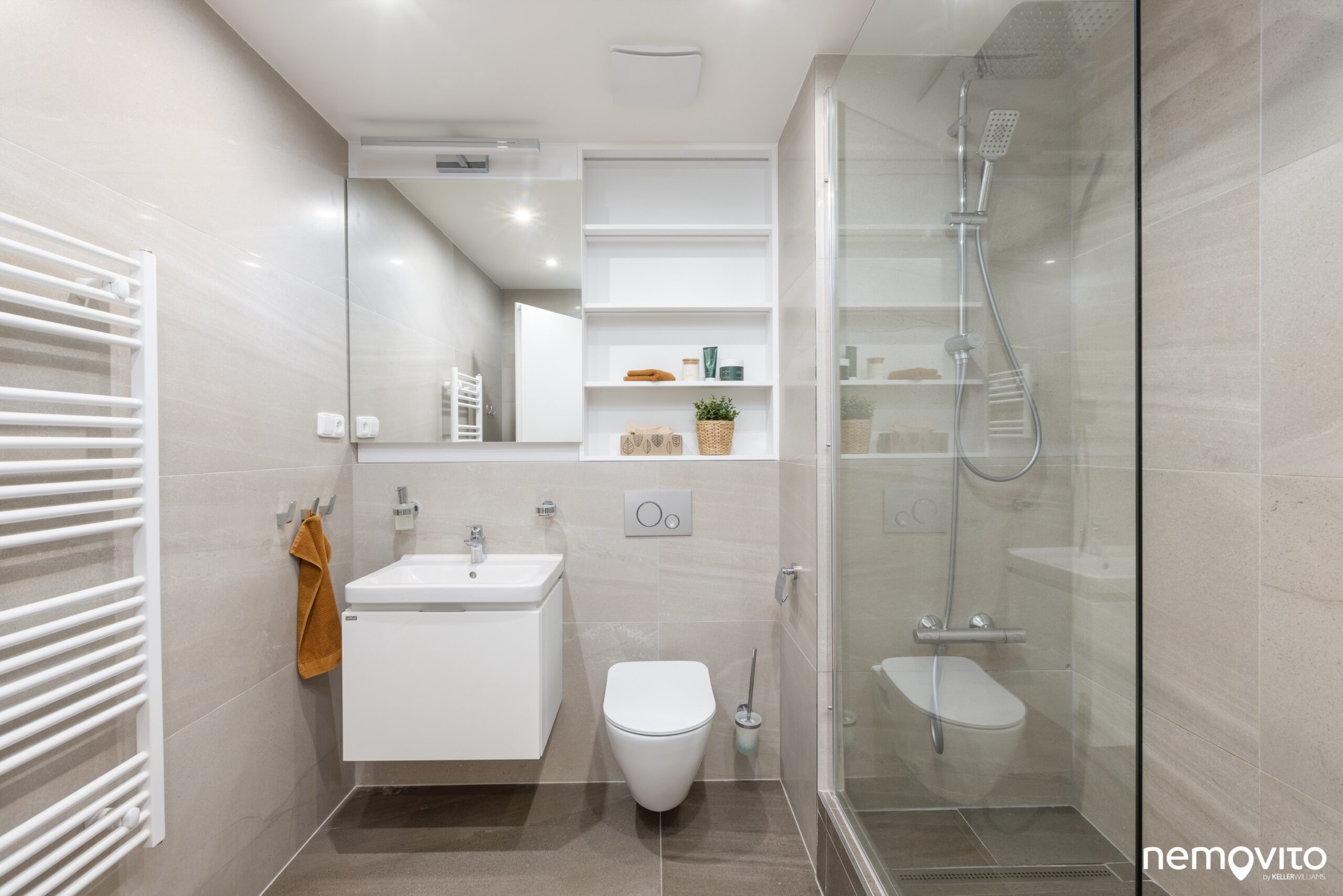 Ta je provedena ve velkoformátovém obkladu v tlumených tónech, který dobře odolává zubu času. Doba svítivě oranžových koupelen už je naštěstí pryč. Nikde tu nestraší pračka, protože tu máme dole v již zmíněné prádelně.