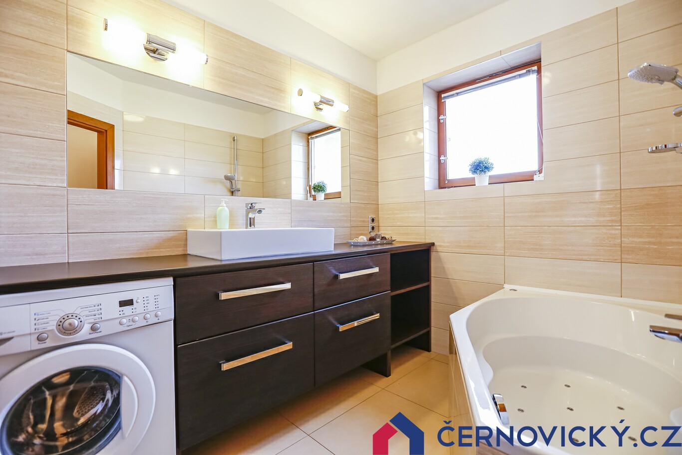 Spodní koupelnu najdete naproti vstupu do domu, ve dveřích vedle je pak samostatná toaleta. V koupelně je příjemně velké okno a komfortní rohová masážní vana.