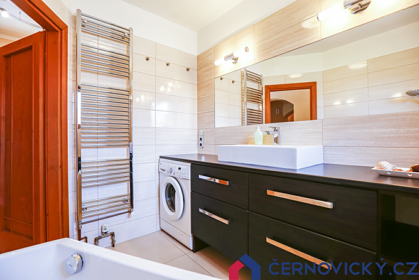 Koupelnou v moderním provedení naleznete pochopitelně i nahoře, tentokrát s velkým sprchovým koutem. Zrovna tak je na podlaží i oddělená toaleta. Poslední a zároveň největší místností je klubovna s barem. Pro pořádání sešlostí a oslav je toto místo jako stvořené. To hlavní vám nabídne venku.