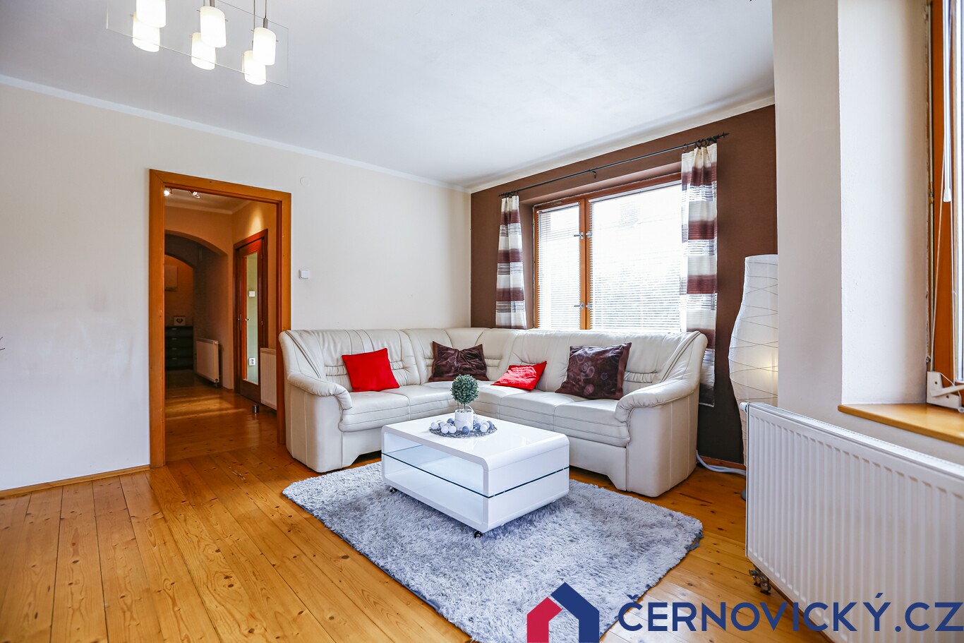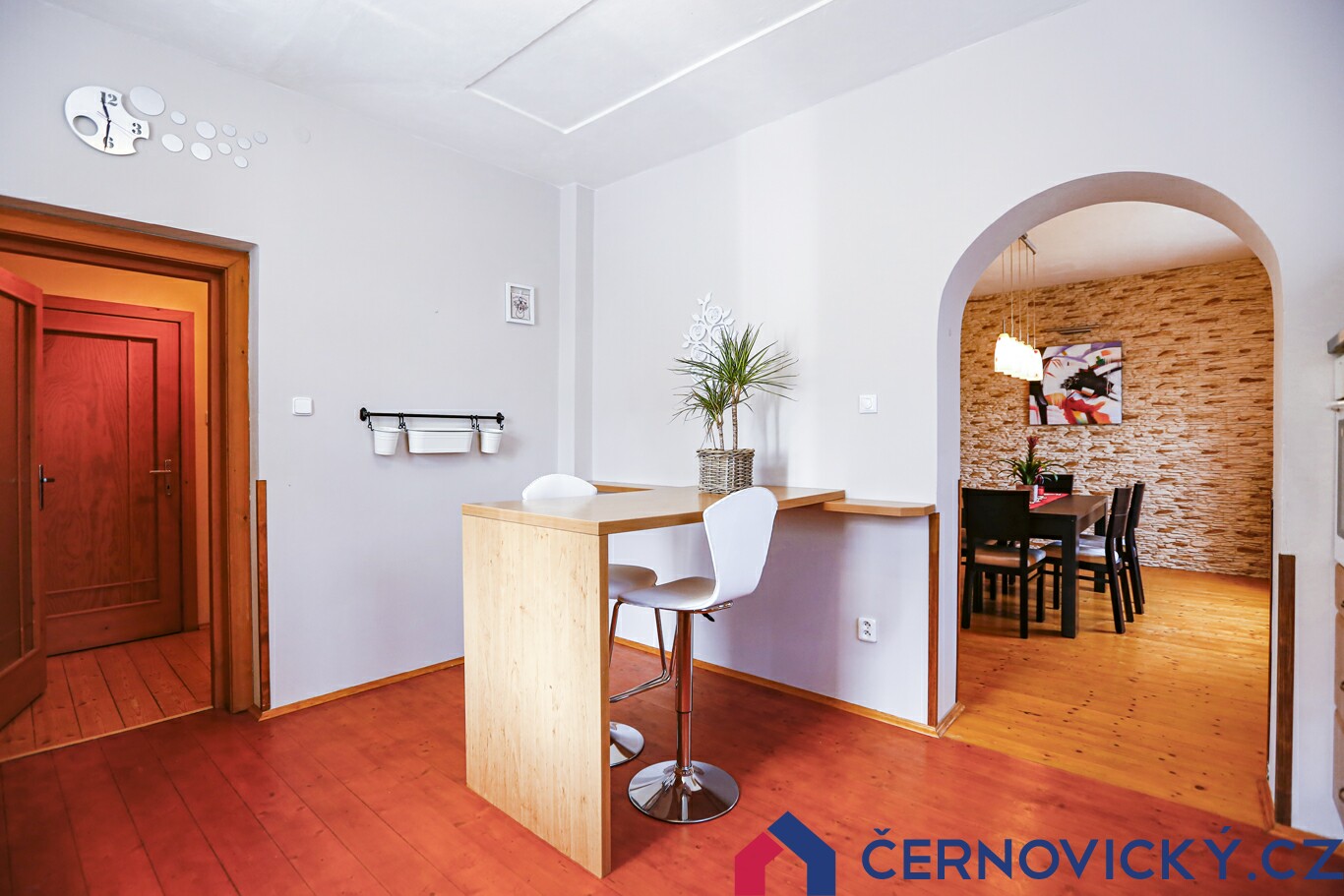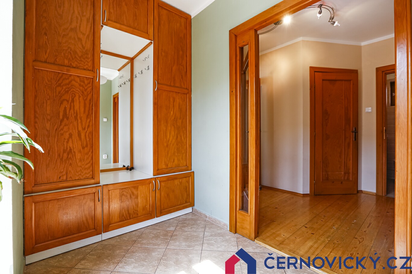 Vítejte univtř domu. Vstupní zádveří je vybaveno vestavěným nábytkem. Doleva je obývací pokoj, naproti WC s koupelnou a doprava kuchyně s jídelnou, kam se přesouváme. Zároveň se jedná o starší část domu. Současná podoba totiž vnikla rozšířením původní stavby. O tom svědčí podoba stropů.