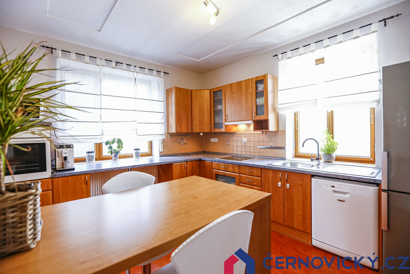 Kuchyně i jídelna jsou dostatečně prostorné místnosti, dohromady mají 33 m2. Na takové ploše žijete v panelákových bytech 1+kk. Tady vám ale nedostatek místa opravdu nehrozí. Díky velkým oknům je v místnostech velké množství světla.