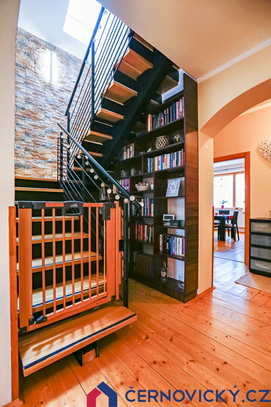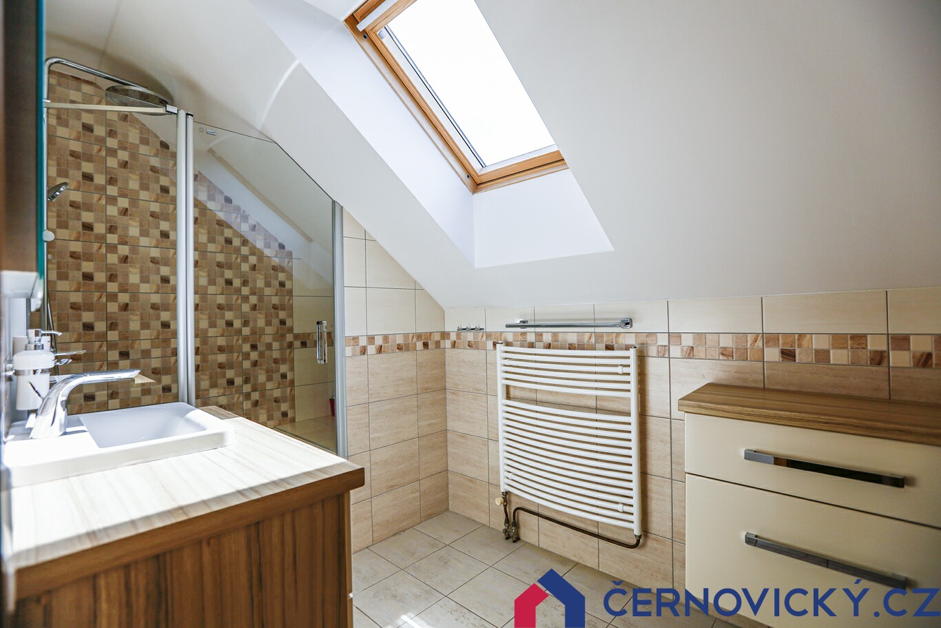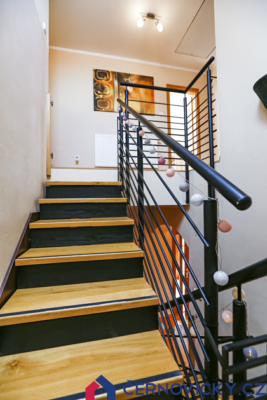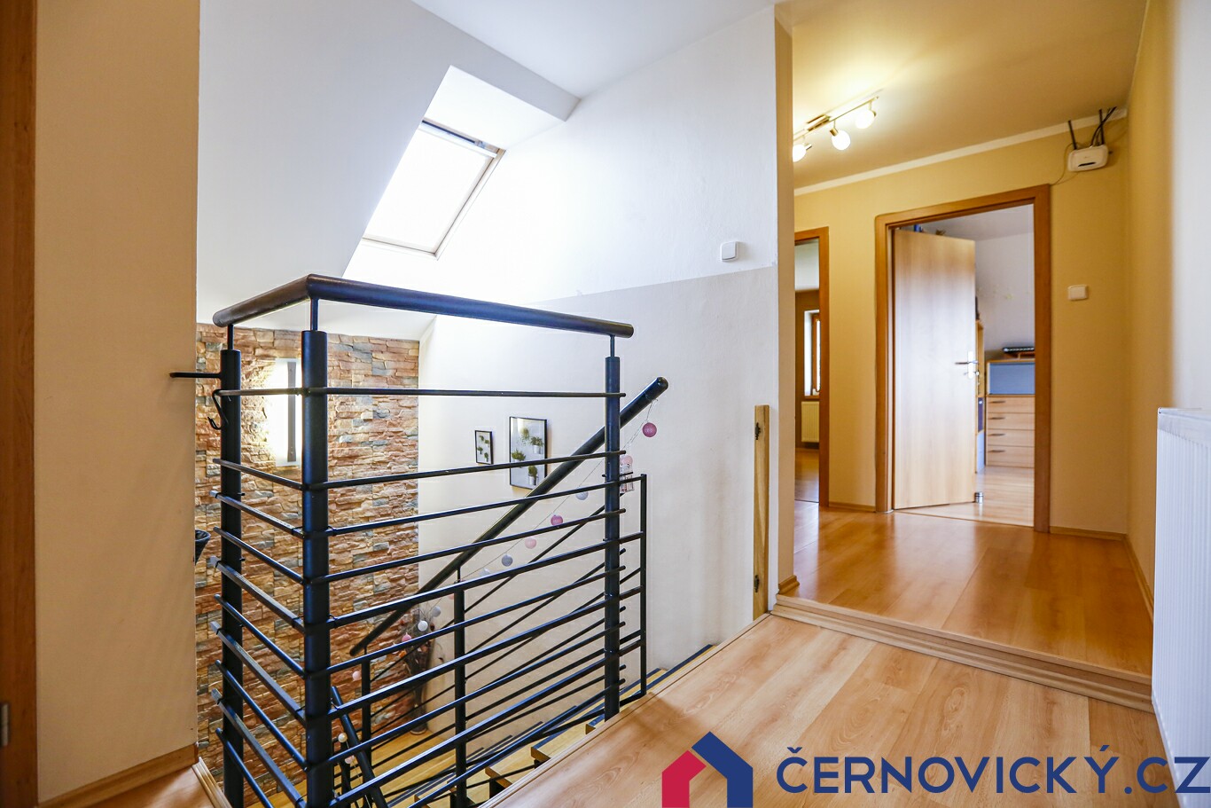Přes schodiště vyběhneme nahoru, kde nás čekají ložnice. Ani na schodišti není díky střešnímu oknu tma. Otevřené dveře na druhé fotce vedou do koupelny.
