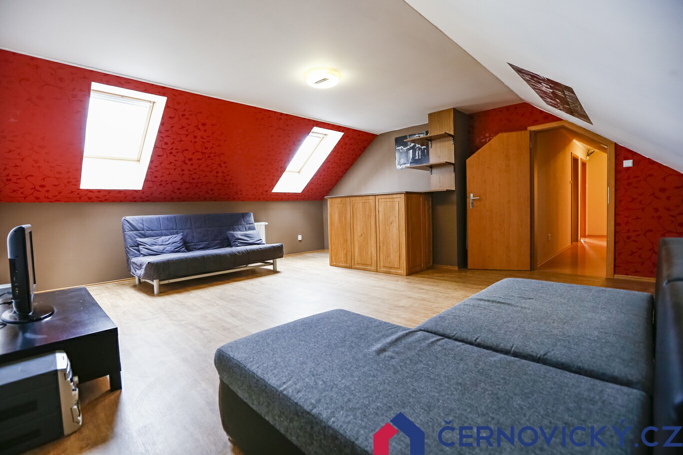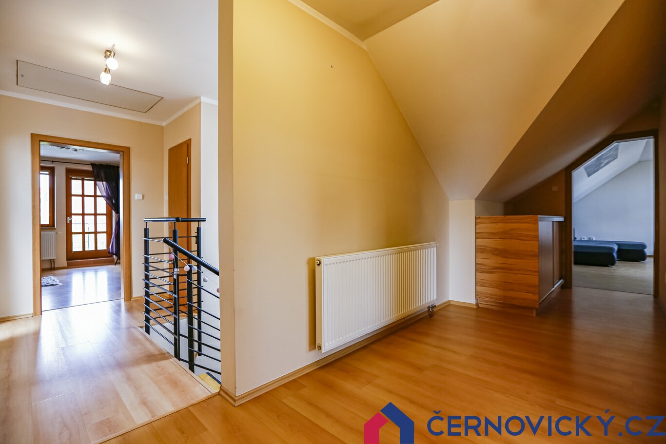 Z horní chodby je dobře patrné dělení podlaží. Na první fotce jsou dvoje dveře do ložnic směrem k ulici. Na druhé fotce vpravo vzadu je tzv. klubovna. Nalevo potom dveře na balkon a hlavní ložnice k bazénu. Tou v tomto podlaží začneme.