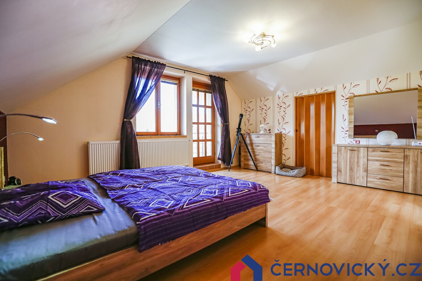 Hlavní ložnice má k dispozici výstup na balkon a krásný výhled na pozemek. Pokud se ptáte, kde jsou šatní skříně, tak nejsou potřeba. Každá ložnice má totiž vlastní šatnu. V této místnosti se nachází za posuvnými dveřmi naproti posteli.