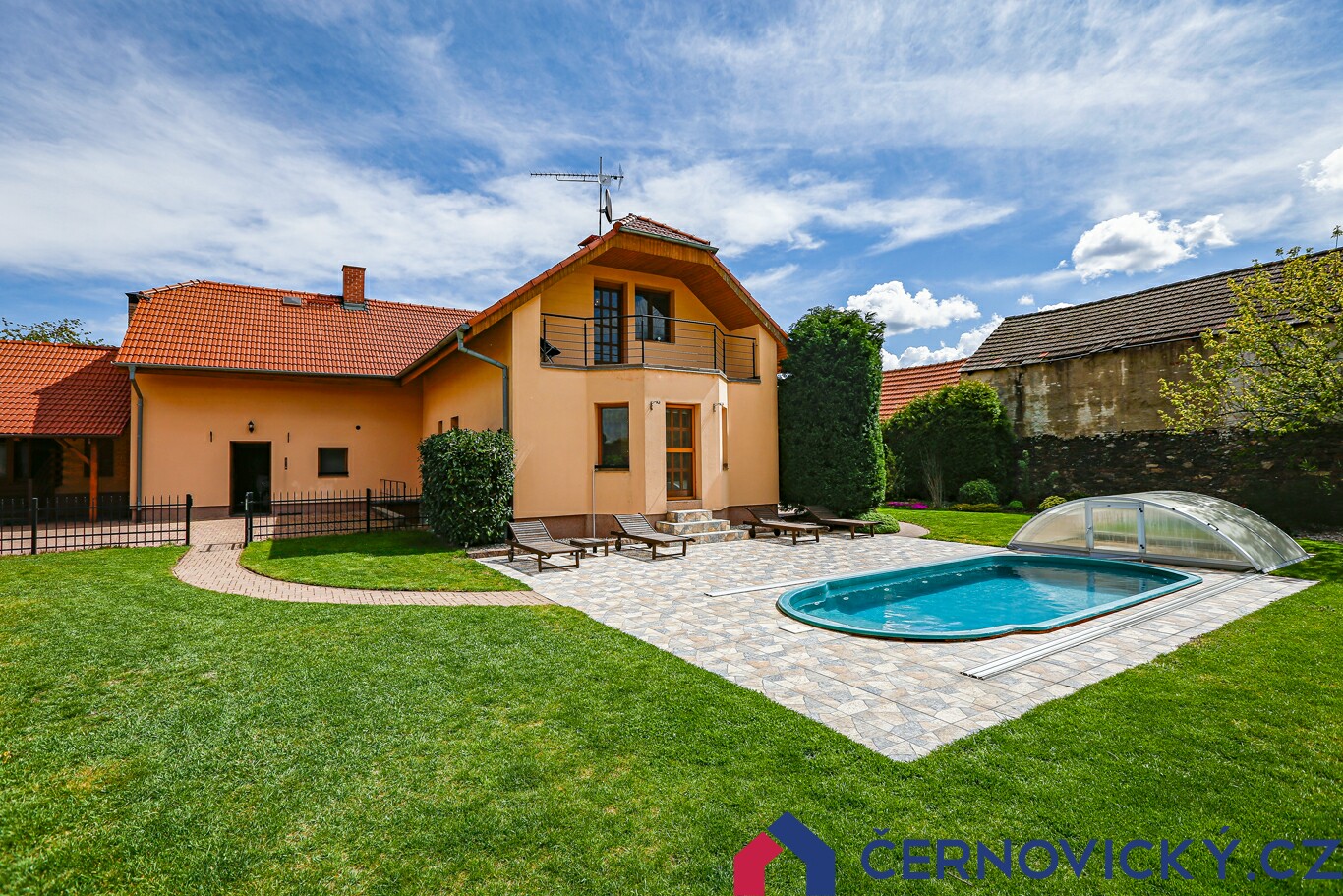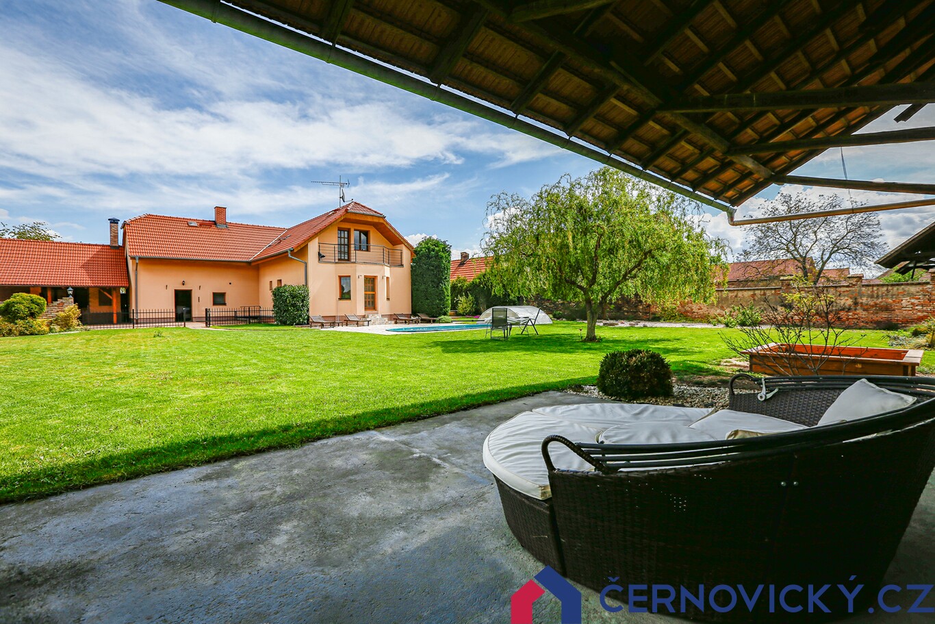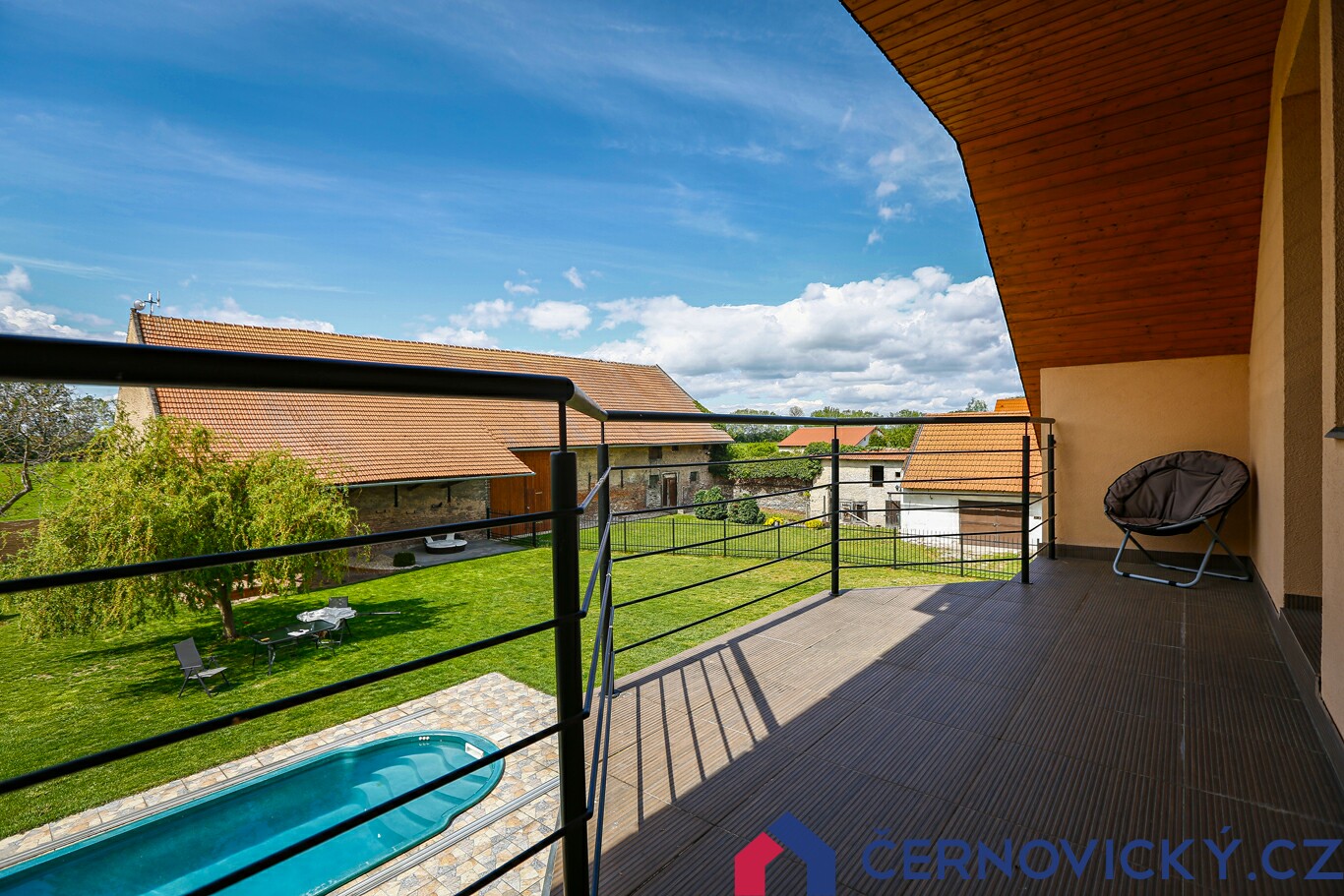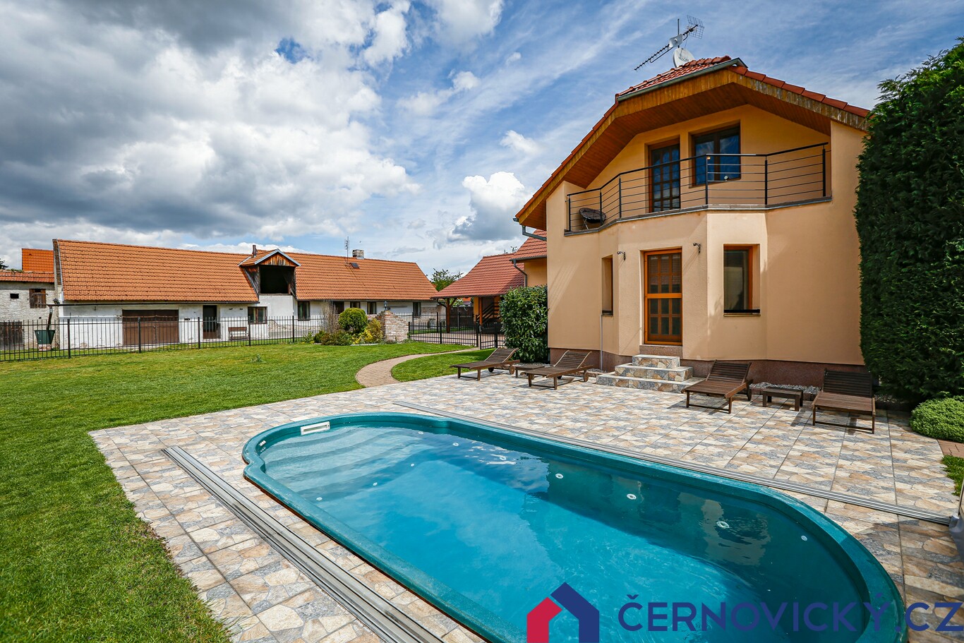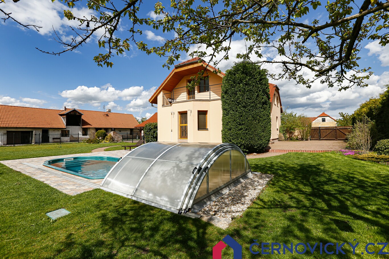 Před zrekonstruovaným domem se nachází krytý bazén o velikosti 6.5 x 2.6 metru, ve kterém je slaná voda a automatická regulace pH. K dispozici jsou i "perličky" a samozřejmostí je filtrace. Terasa kolem bazénu má cca 80 m2. Orientace průčelí domu s balkonem je na jihozápad. Pro umístění bazénu tedy naprosto perfektní místo.