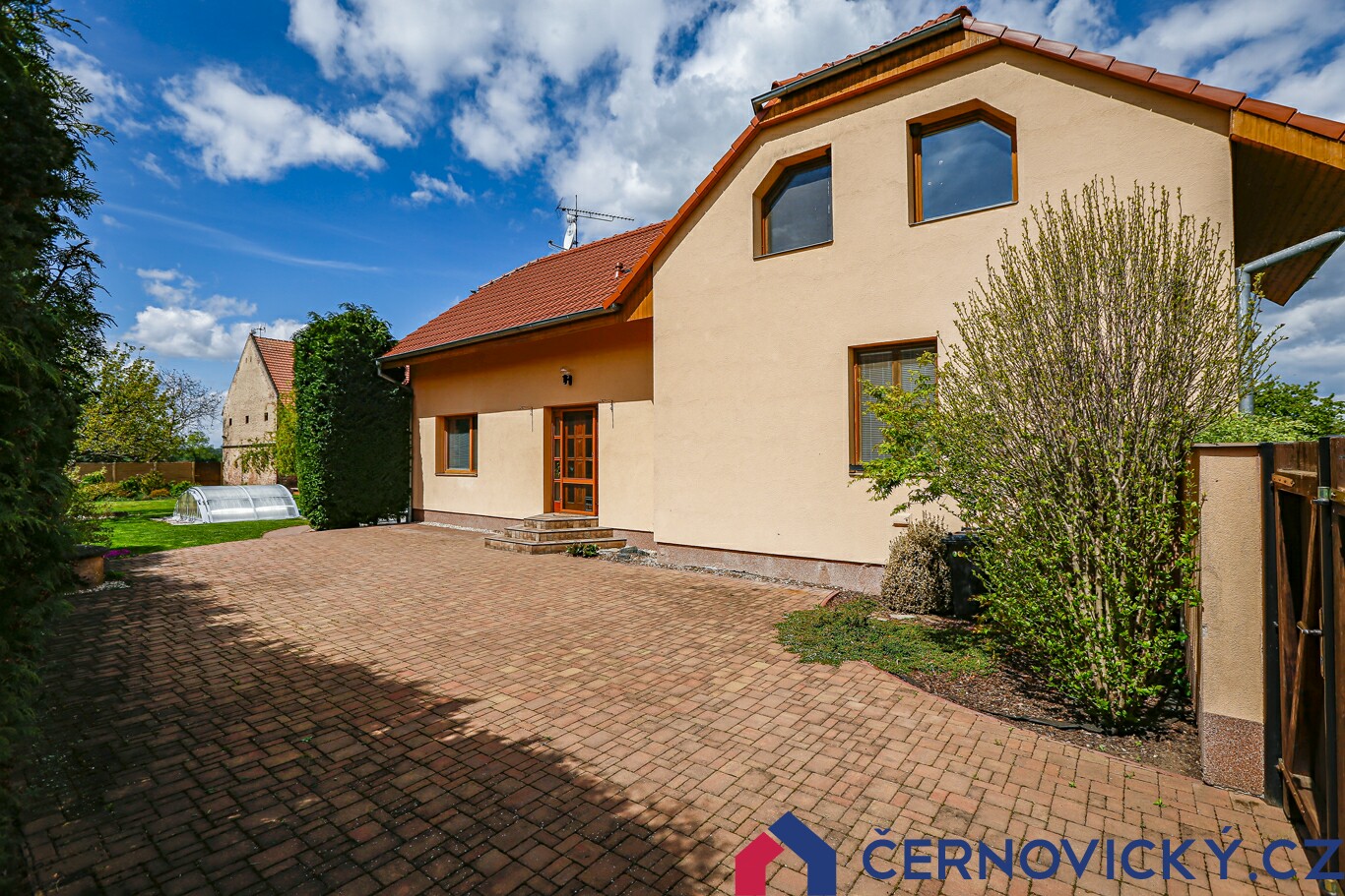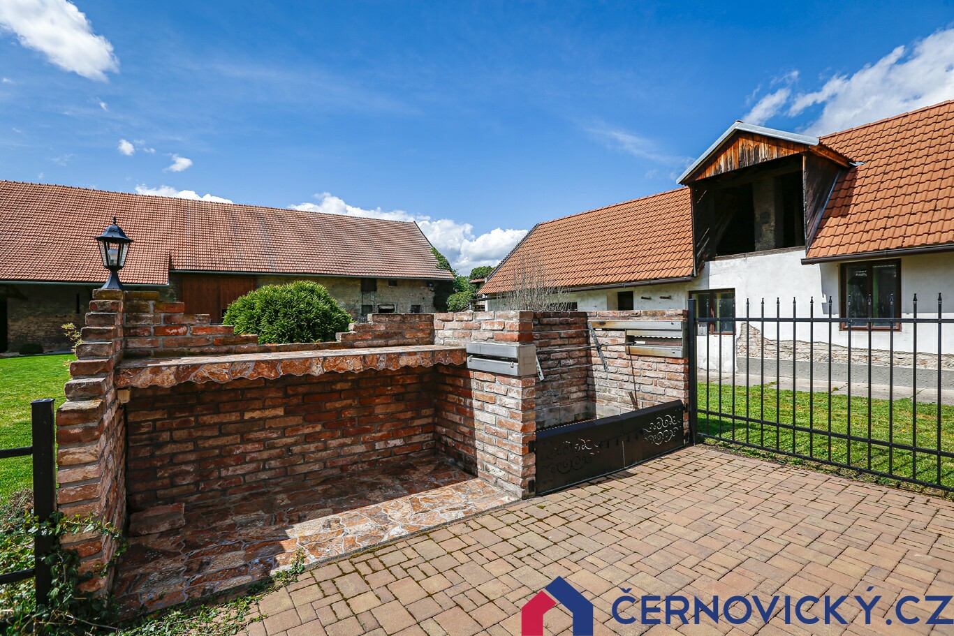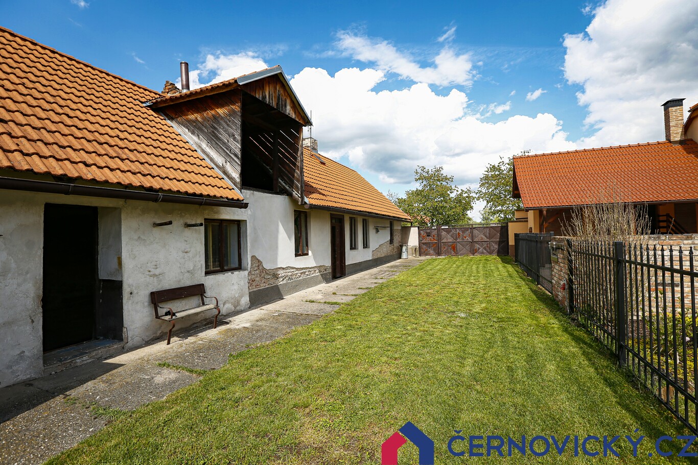 Boční pohled na hlavní dům, u kterého je další zpevněná plocha s příjezdem přes bránu. Na cca 115 m2 zaparkuje pohodlně i vaše návštěva, kterou tu budete mít často. Je tady totiž opravdu co ukazovat. V tomto místě je zároveň umístěna i jedna ze dvou studen. Obecní vodovod je úplně nově k dispozici (jaro 2020), dům se na něj tedy ještě nenapojil. Zcela soběstačný byl ale i bez vodovodu.
