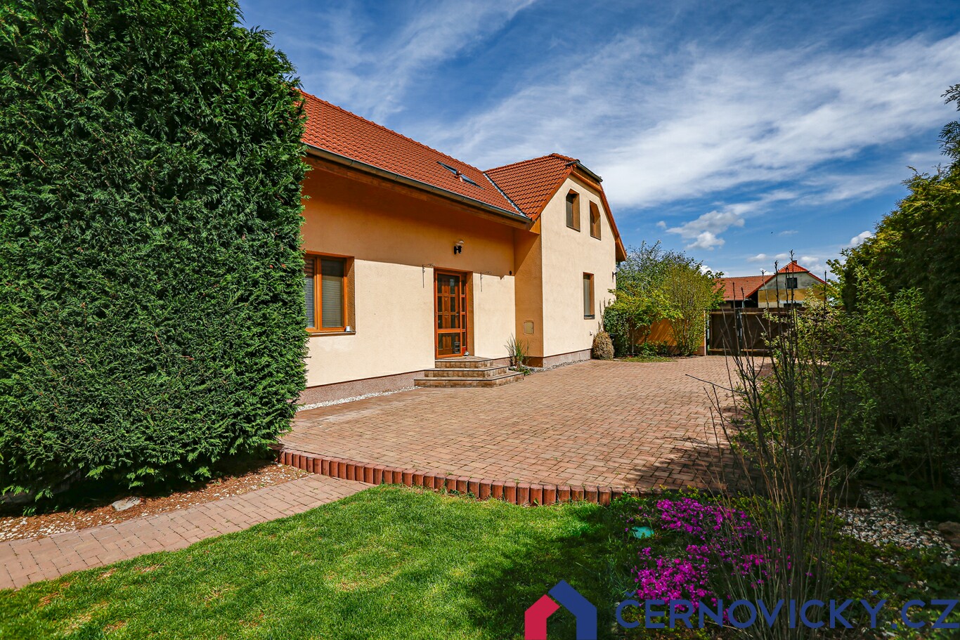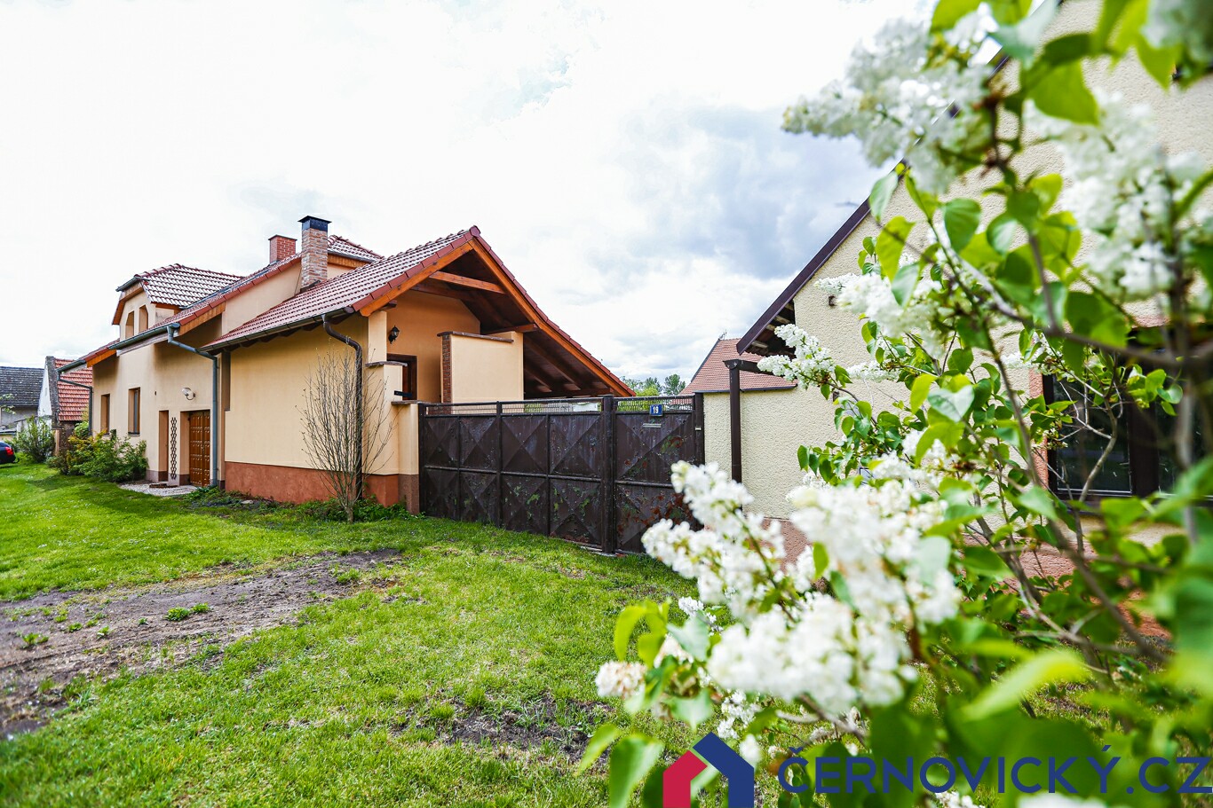 Čelní pohled na dům z ulice. První dvě okna jsou do kuchyně a jídelny, hned vedle jsou dveře do technické místnosti a přístup do garáže. Hnědá vrata mezi domy jsou druhým vjezdem na pozemek.