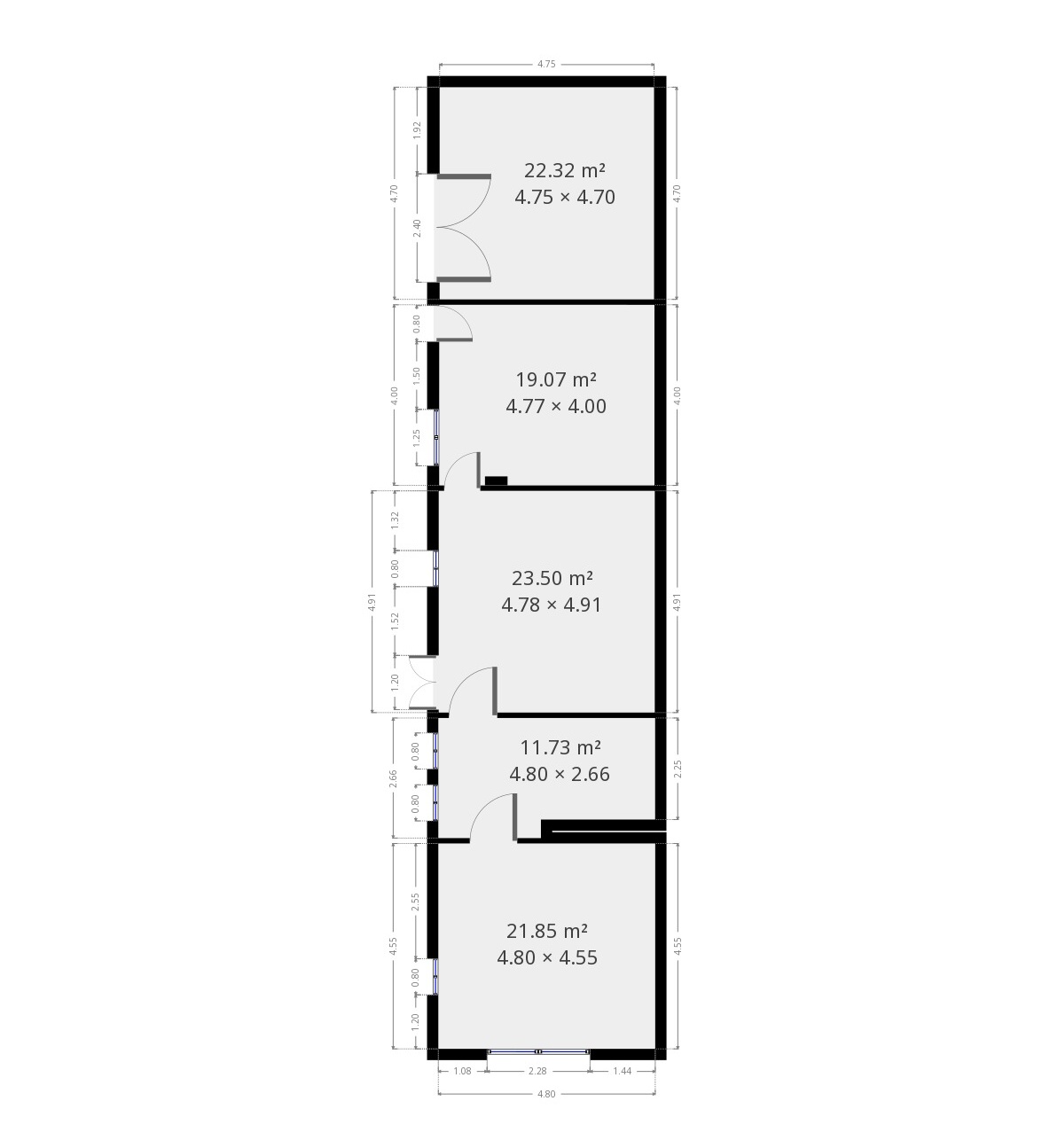 Plán tohoto domu, stejně jako plány všech ostatních budov, naleznete na konci tohoto webu. V části u chlévu se nachází garáž. Plot, který aktuálně rozděluje plochu nového domu od starého, je pomyslným dělením pozemků. Majitelé jsou totiž ochotni prodat jen část, to znamená bez starého domu a části stodoly.