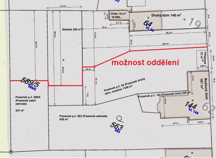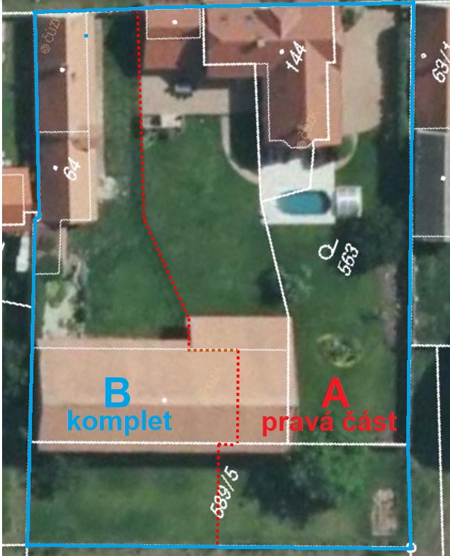 Snímek s katastrální mapou odhaluje členění staveb a pozemku. Červená linka na prvním obrázku zobrazuje jednu z možných variant dělení pozemků.