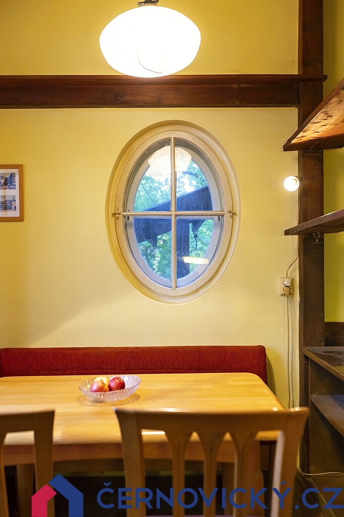 Není to tu jednoduché. Protože kamkoliv se podíváte, tam je nějaká zajímavost. Tady třeba kulaté okno v kuchyni a nebo výklenek ve spodní ložnici s atypickým radiátorem.