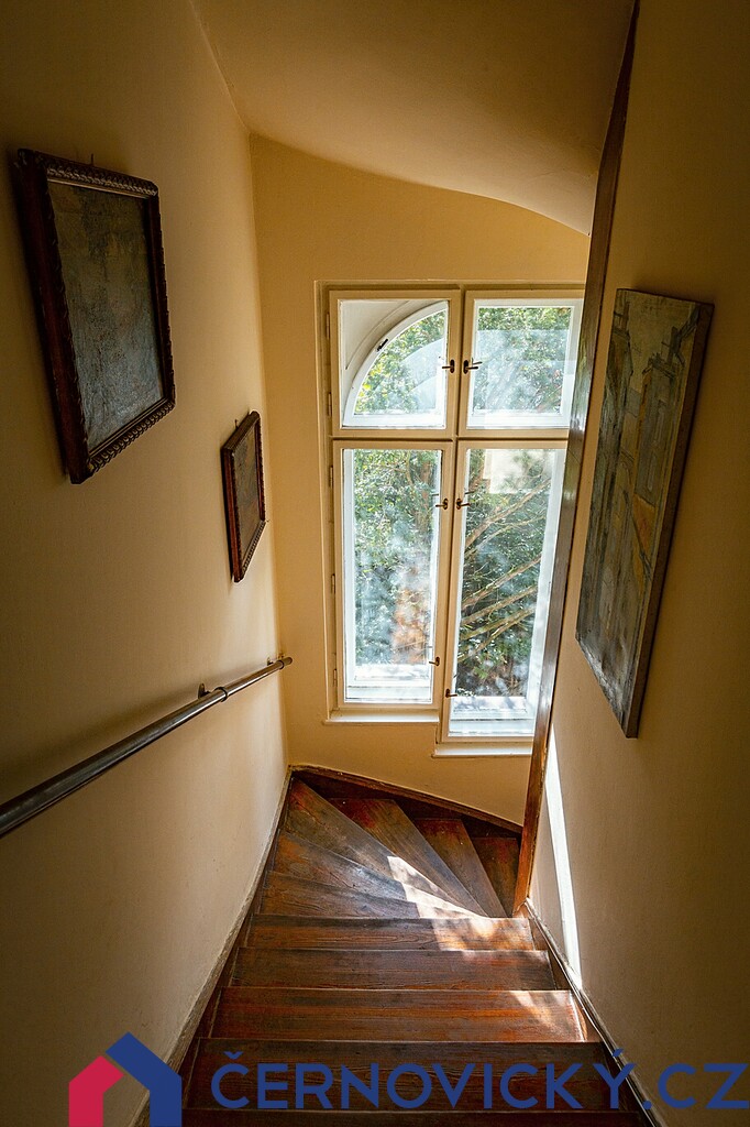 Přes úžasné původní schodiště se přesuneme do druhého podlaží domu. Schodiště je významnou pohledovou částí domu i zvenčí, a to díky řešení oken.