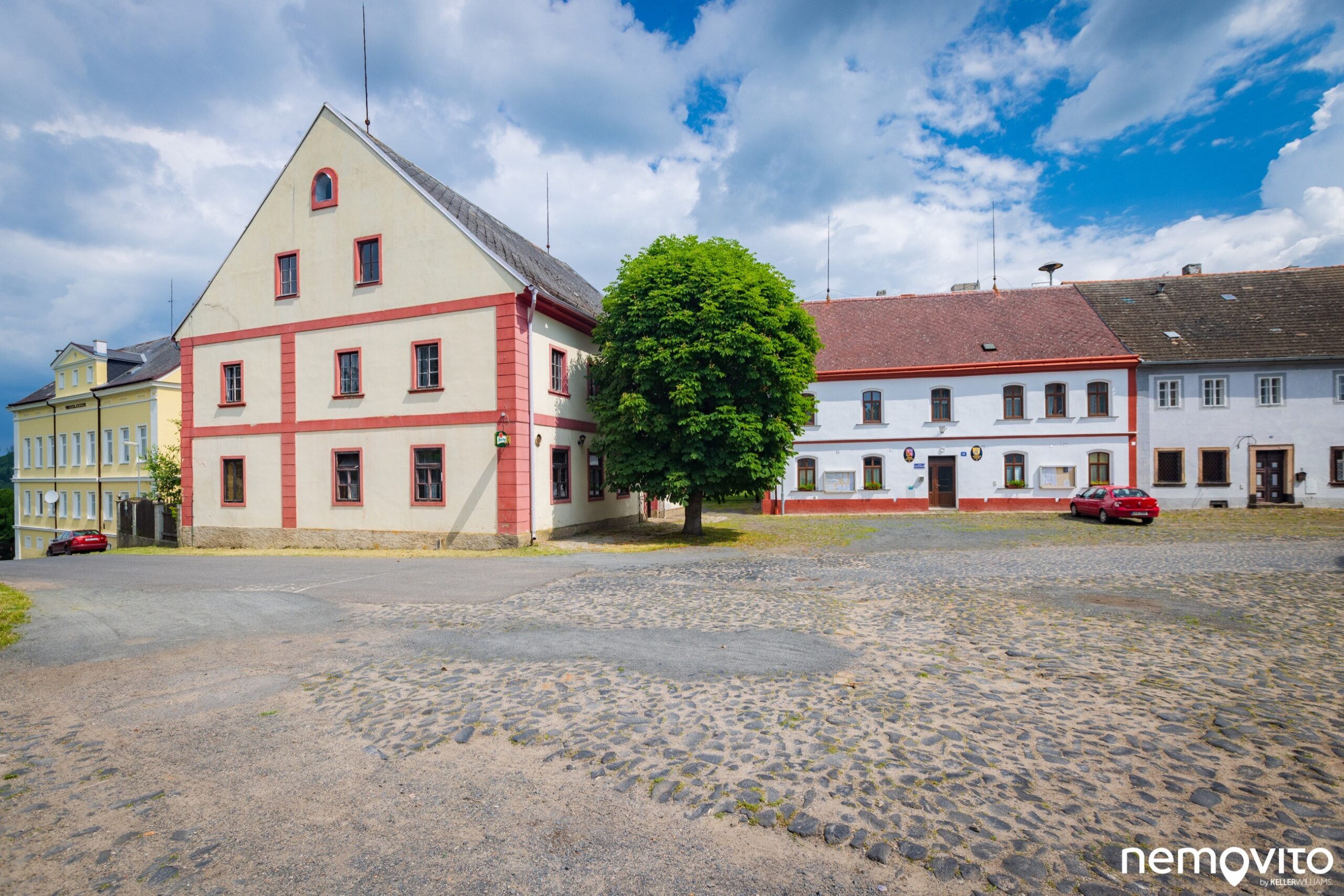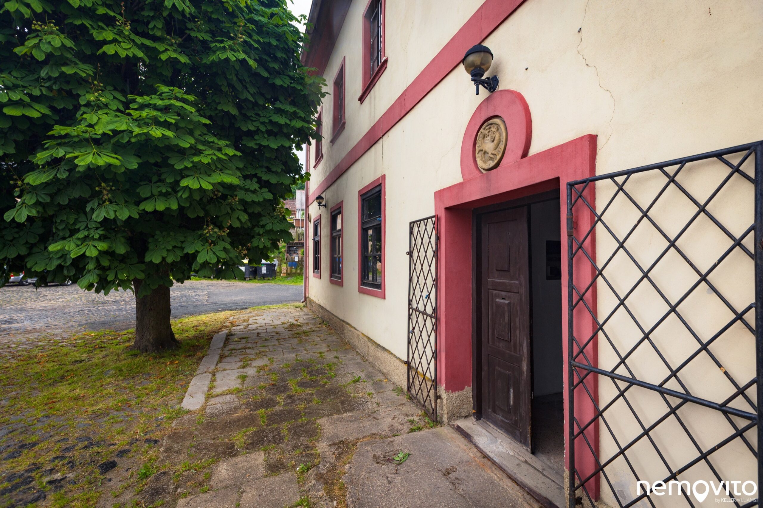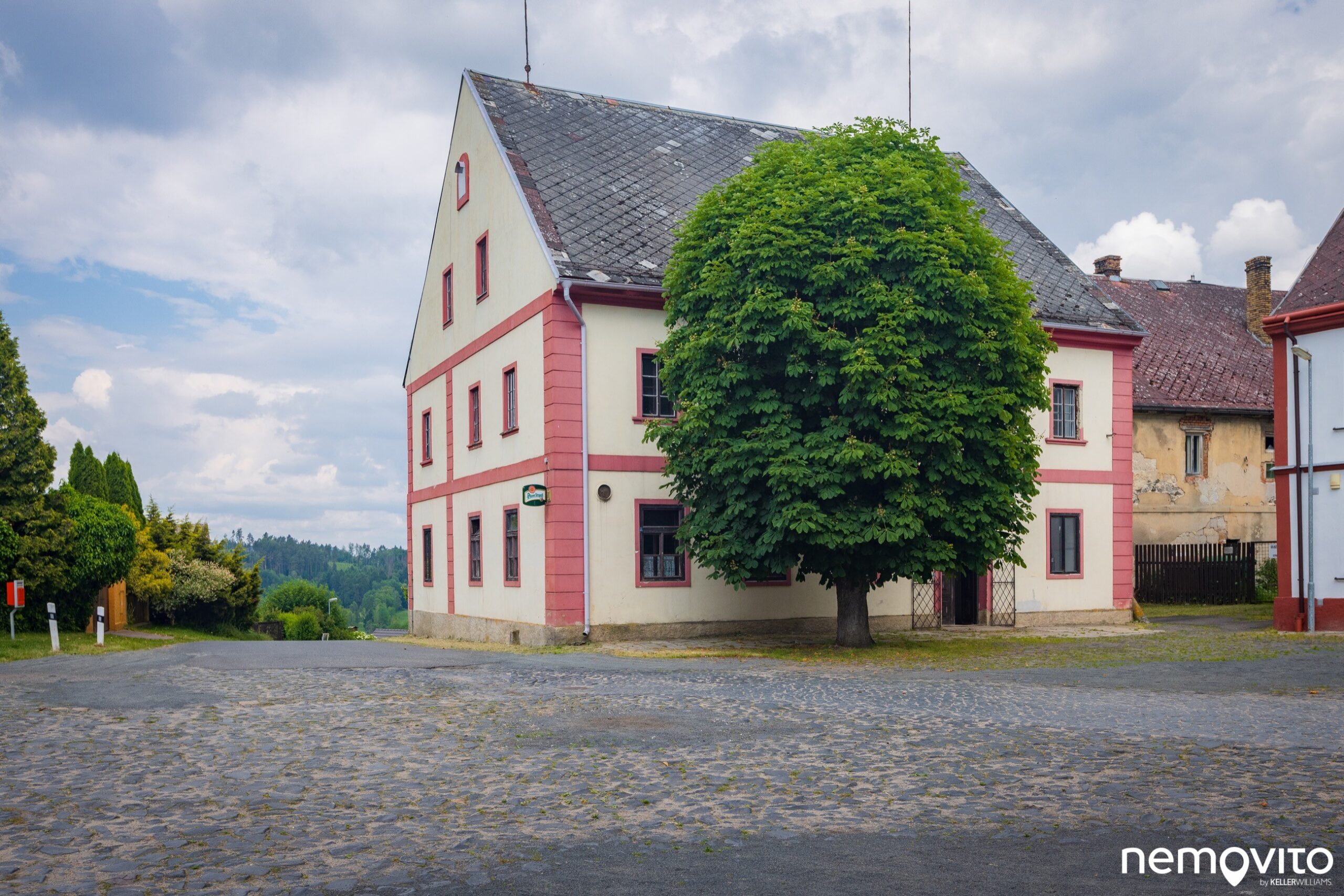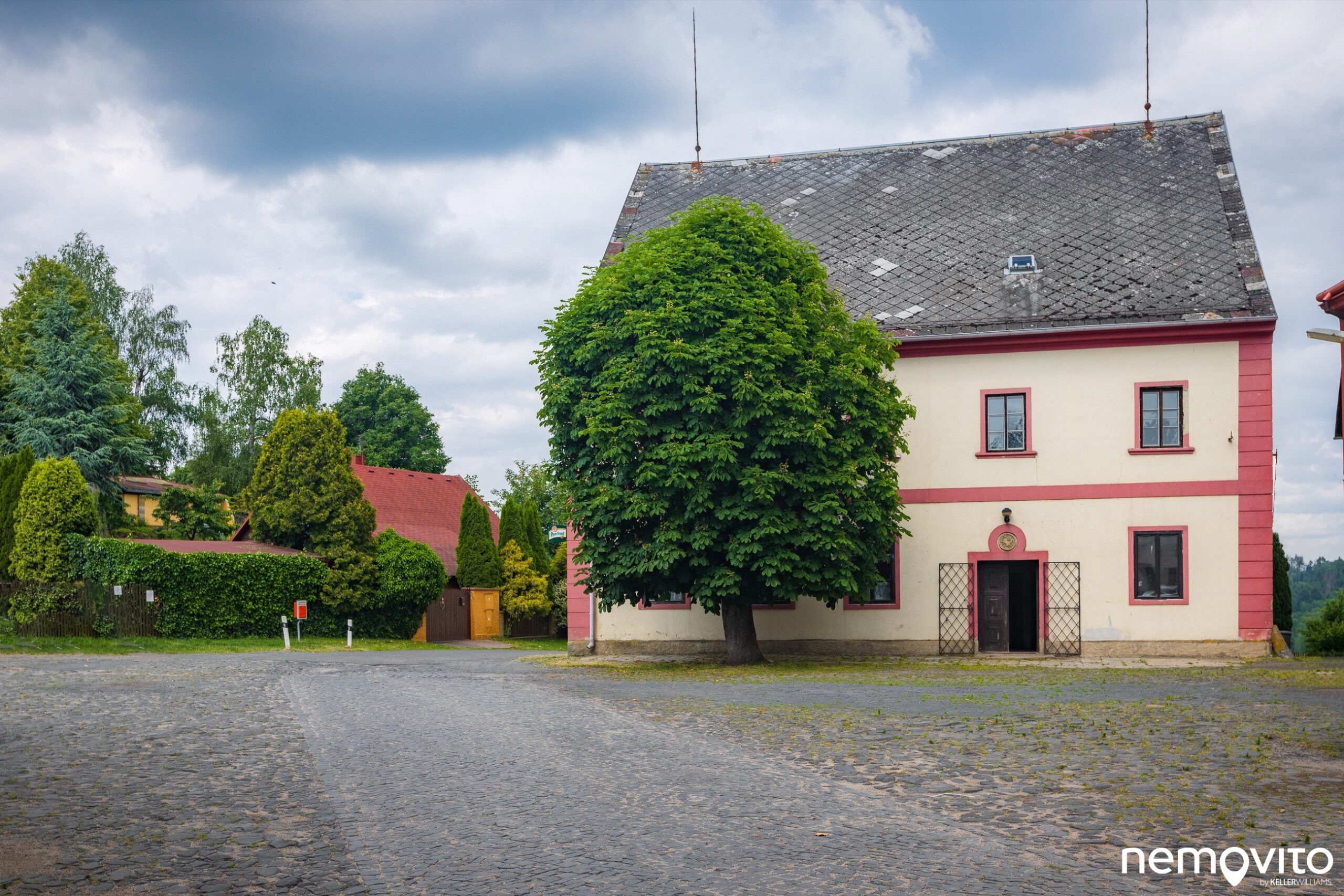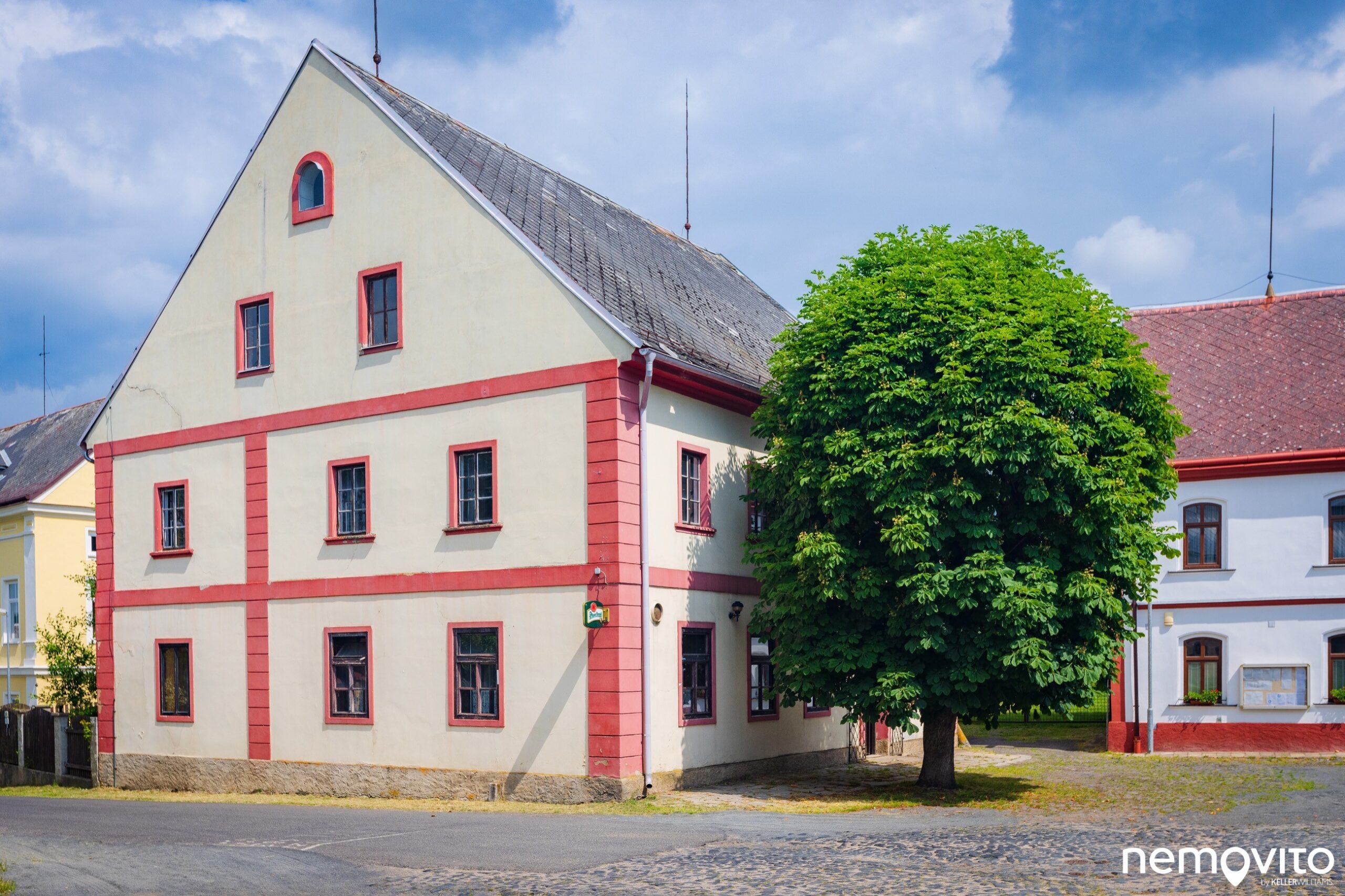 Až pojedete na prohlídku, dům určitě nepřehlédnete. Je totiž jediný, který má před sebou na návsi vzrostlý strom. Jednou ze sousedních budov je úřad městyse.