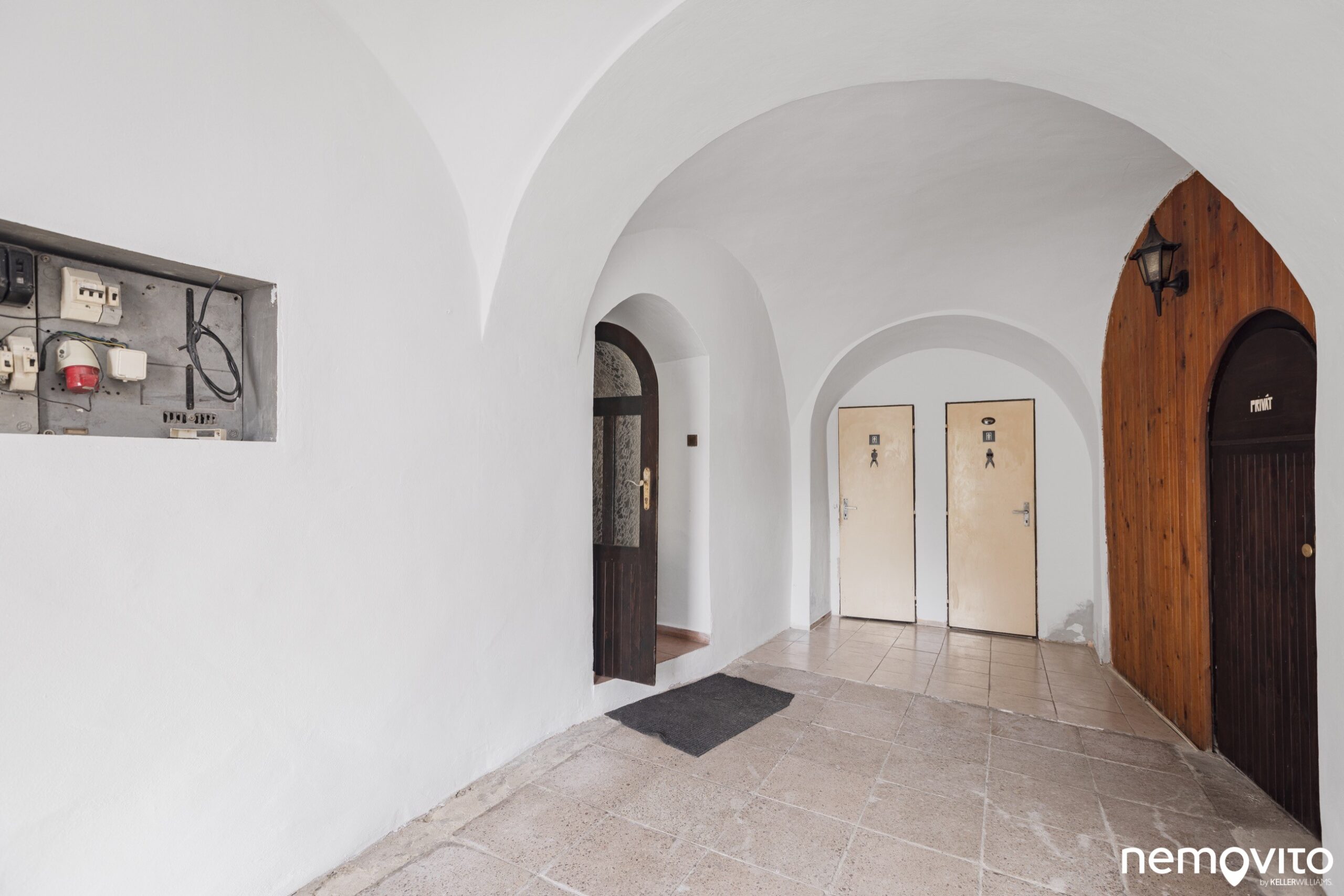 Vstup do domu je uzpůsoben provozu hostince, naproti křídlovým dveřím tak naleznete nejprve toalety.