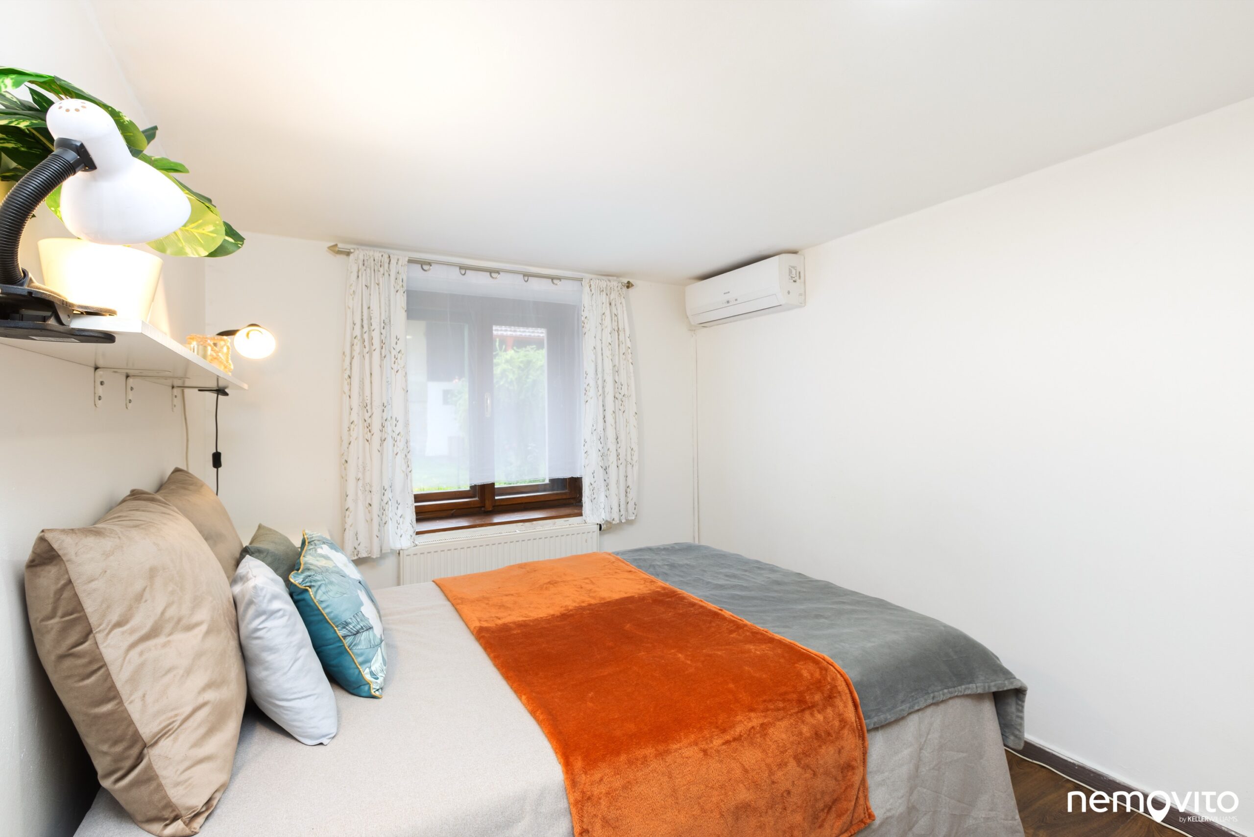 I tento pokoj je vytápěn tepelným čerpadlem vzduch-vzduch a podlahovým topením. Okno do ložnice je vpravo od pískovcové části domu, na fasádě je vidět jednotka čerpadla.