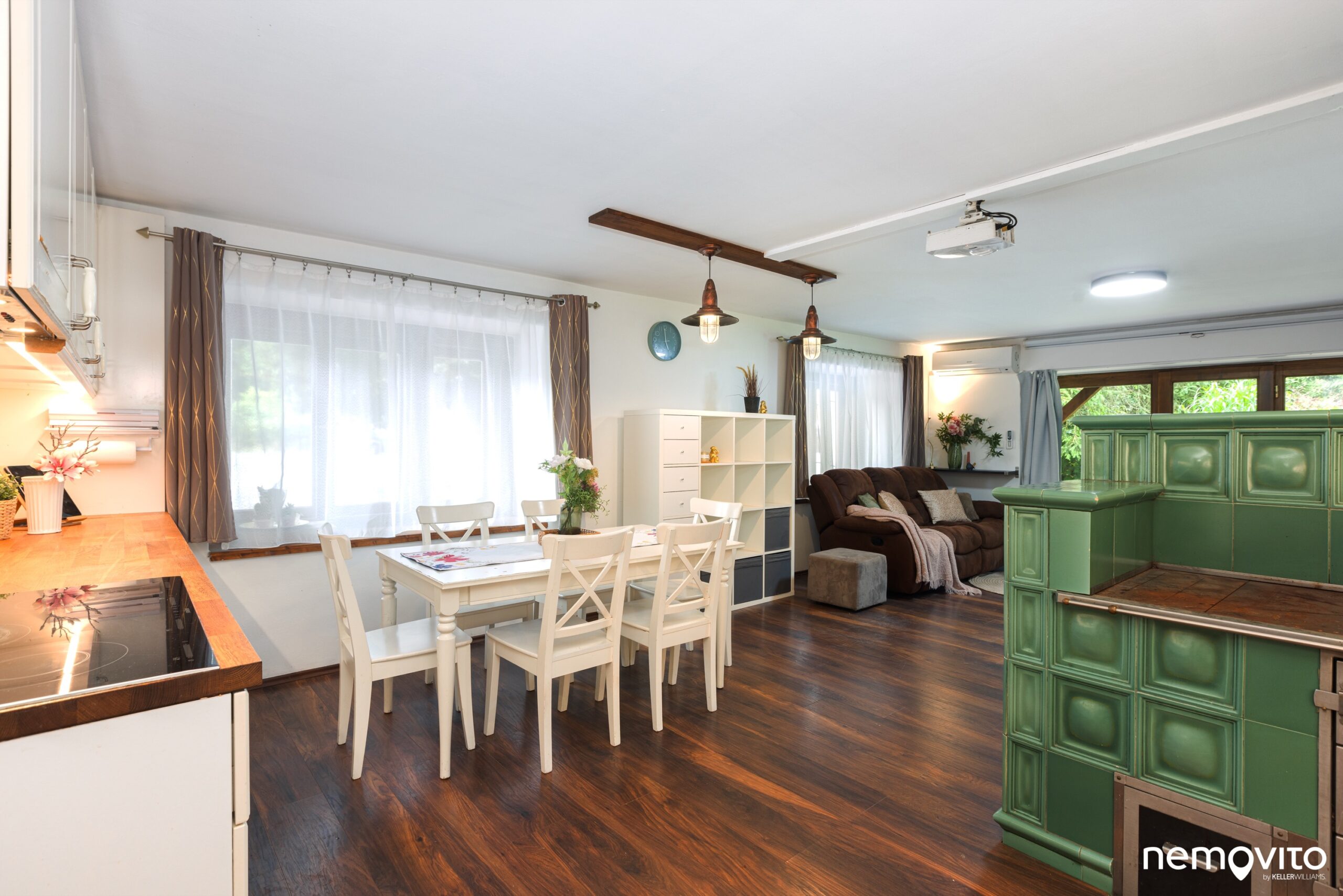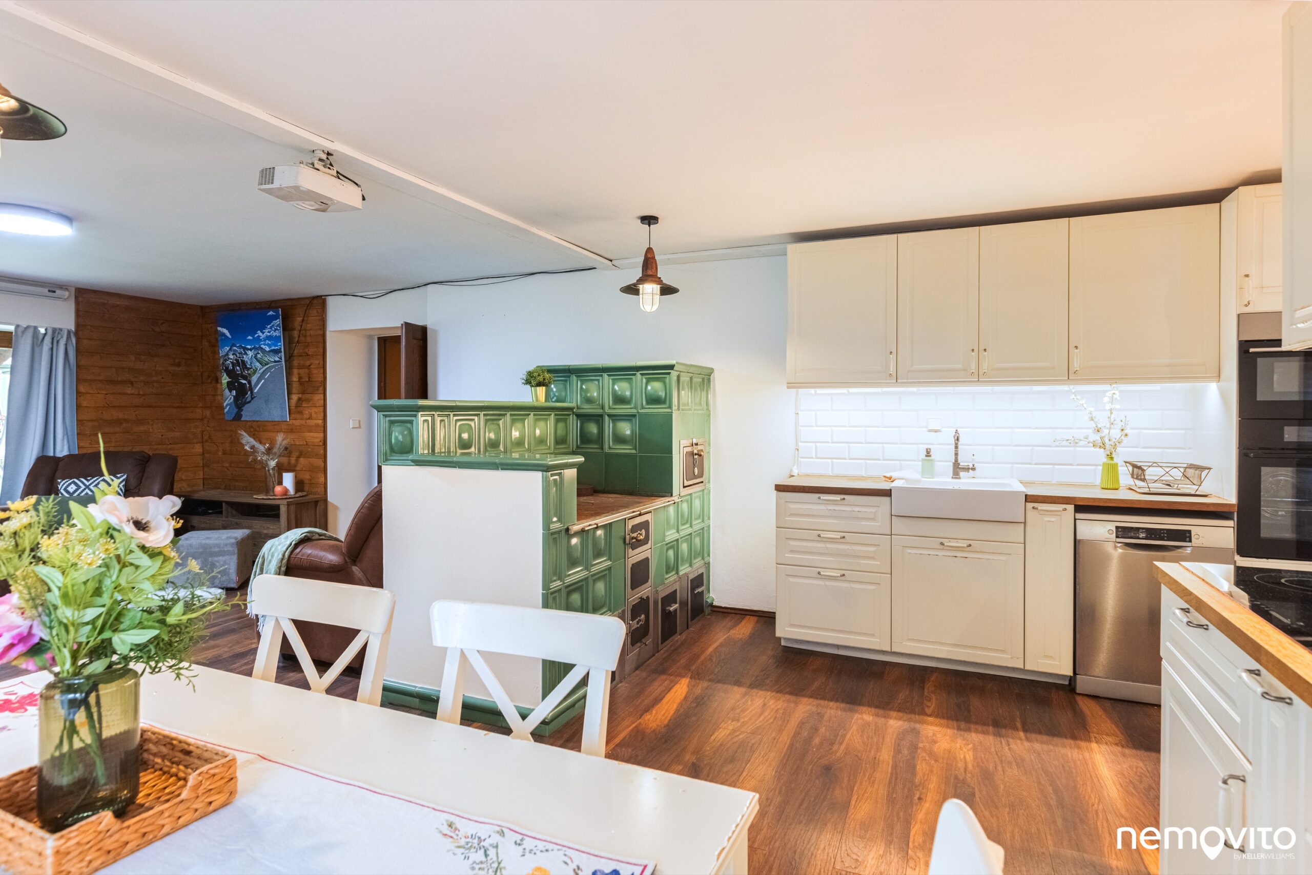 V pořádném domě nesmí chybět kachlová kamna. Jsou hnedka u kuchyně. V té sice trouba je, ale odkud vyletí pečená kachna je asi už jasné. V obýváku je teplovodní podlahové topení.