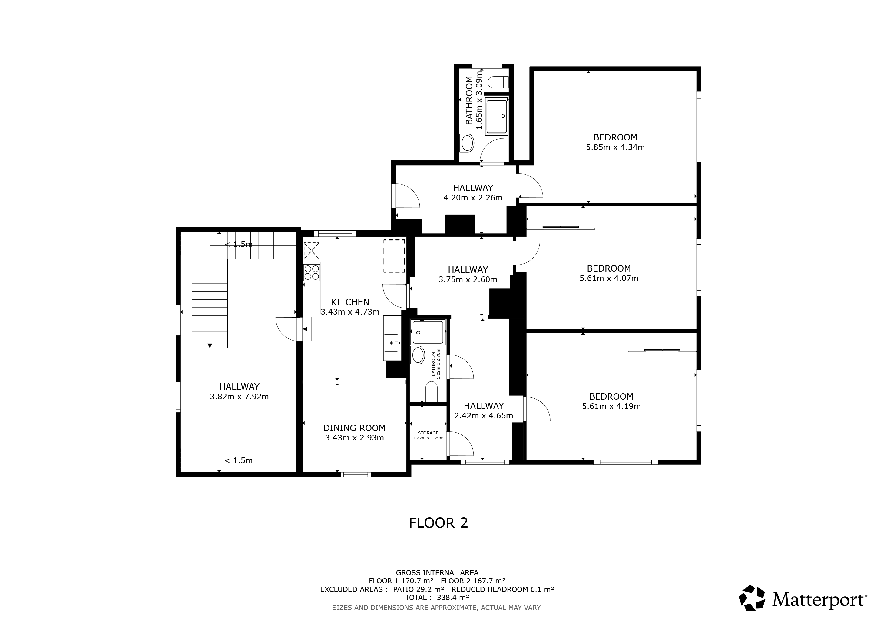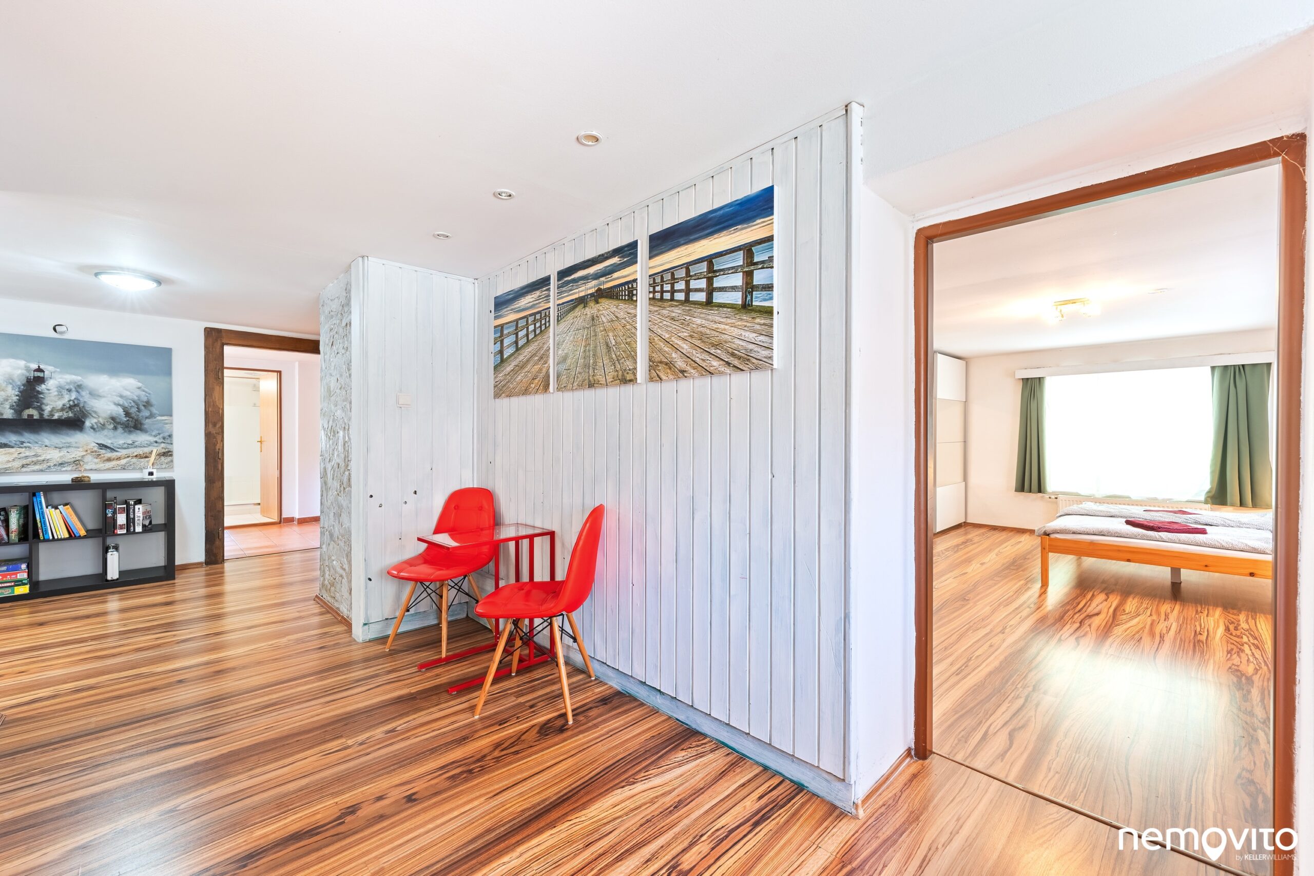 Vstupní chodba s podlahovkou má zhruba 15 m2. Vstupujete odtud do obýváku i do hlavní ložnice. Její plocha je 20 m2 a má dvě části.