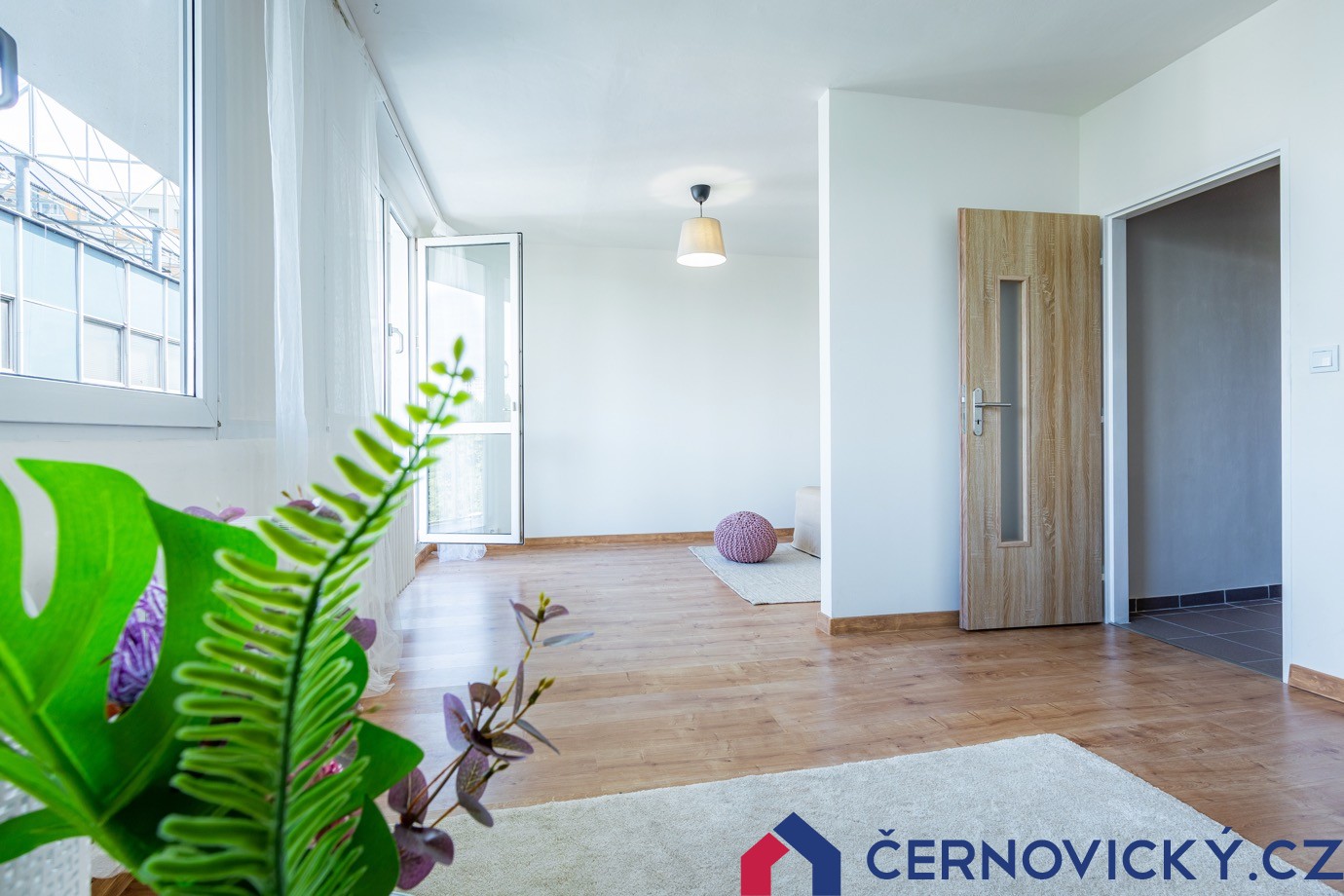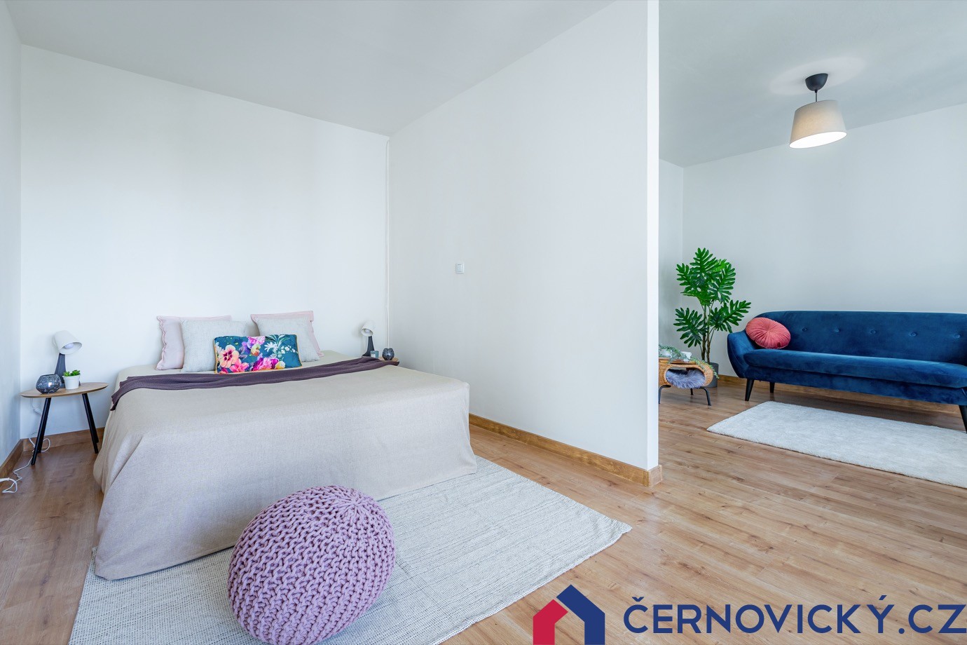 Pokud byste chtěli, můžete obývák od ložnice oddělit úplně. Obě místnosti by měly okno a z ložnice by pak byl výstup na lodžii. Tuto jednoduchou stavební úpravu můžete řešit kdykoliv a velmi rychle. Prostor pro spaní má velikost 12.6 m2, obývák pak 11.7 m2.