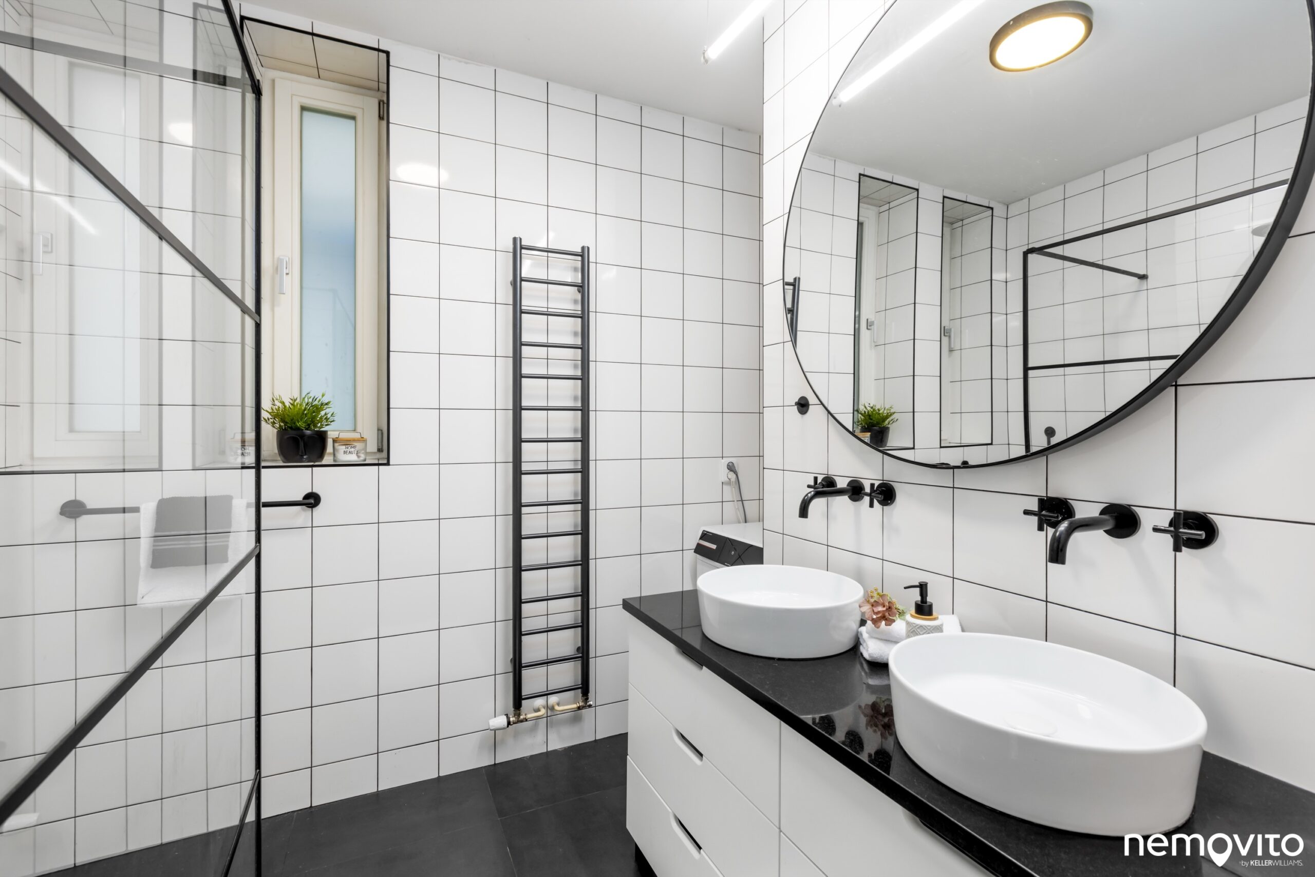 Pro koupelnu (5,5 m2) byl zvolen minimalistický design v kombinaci bílé a černé. Za rohem za umyvadly je místo na pračku a nad ní je pak plynový kotel Viessman.