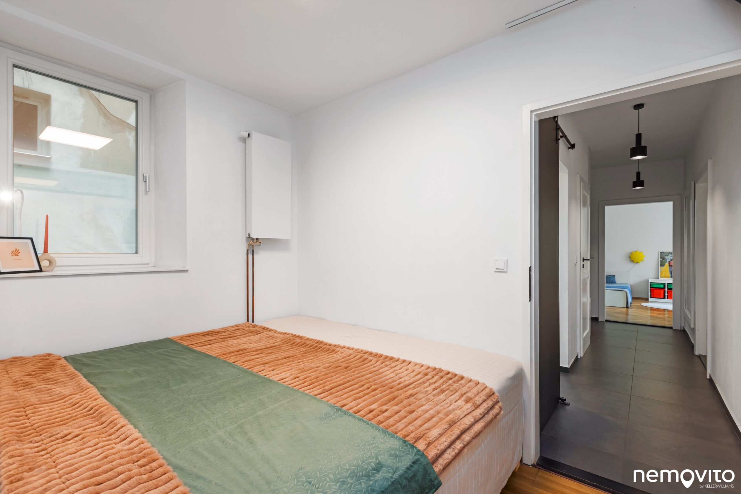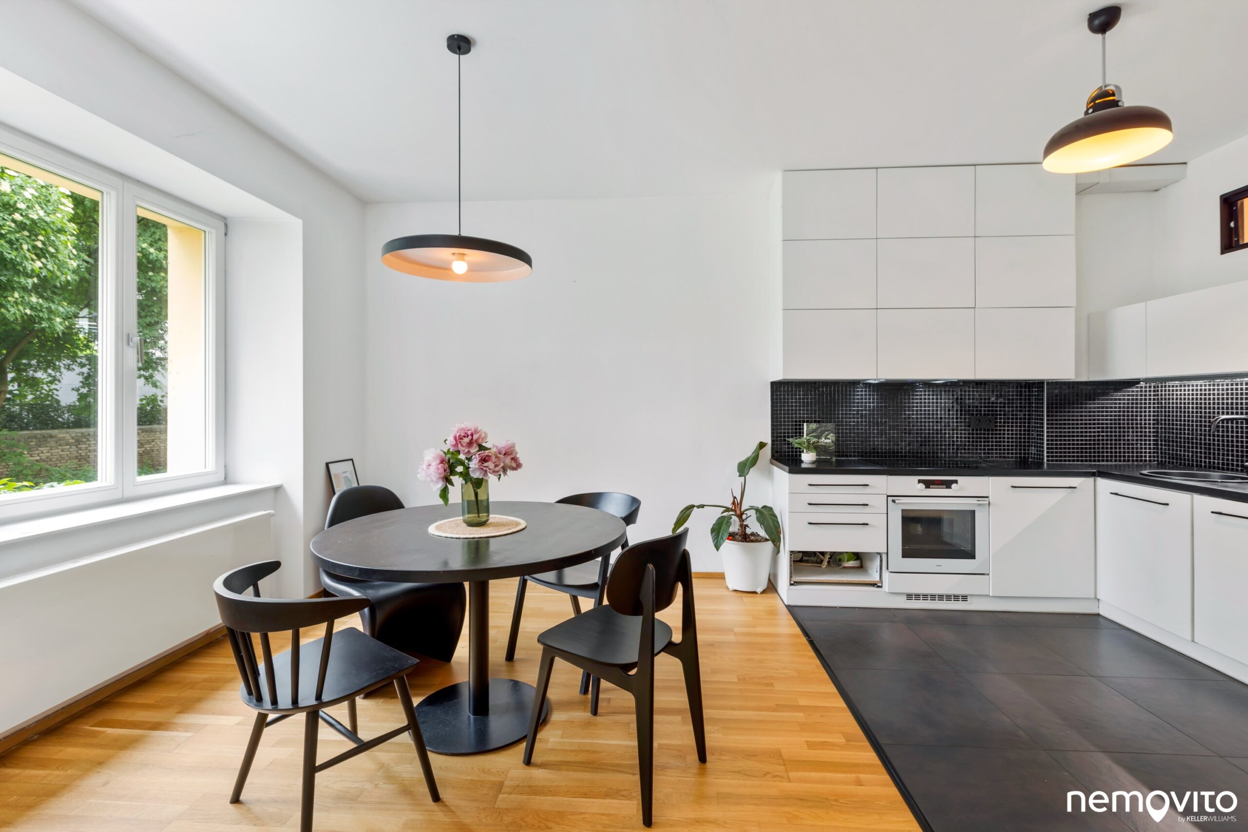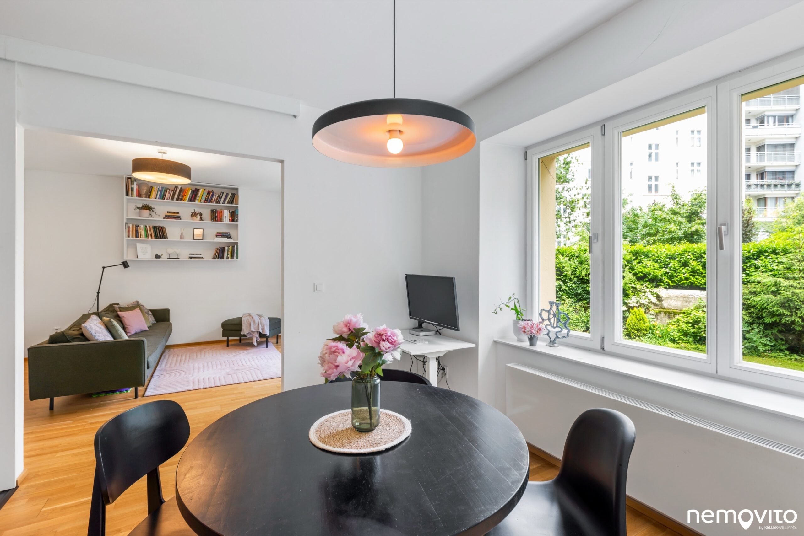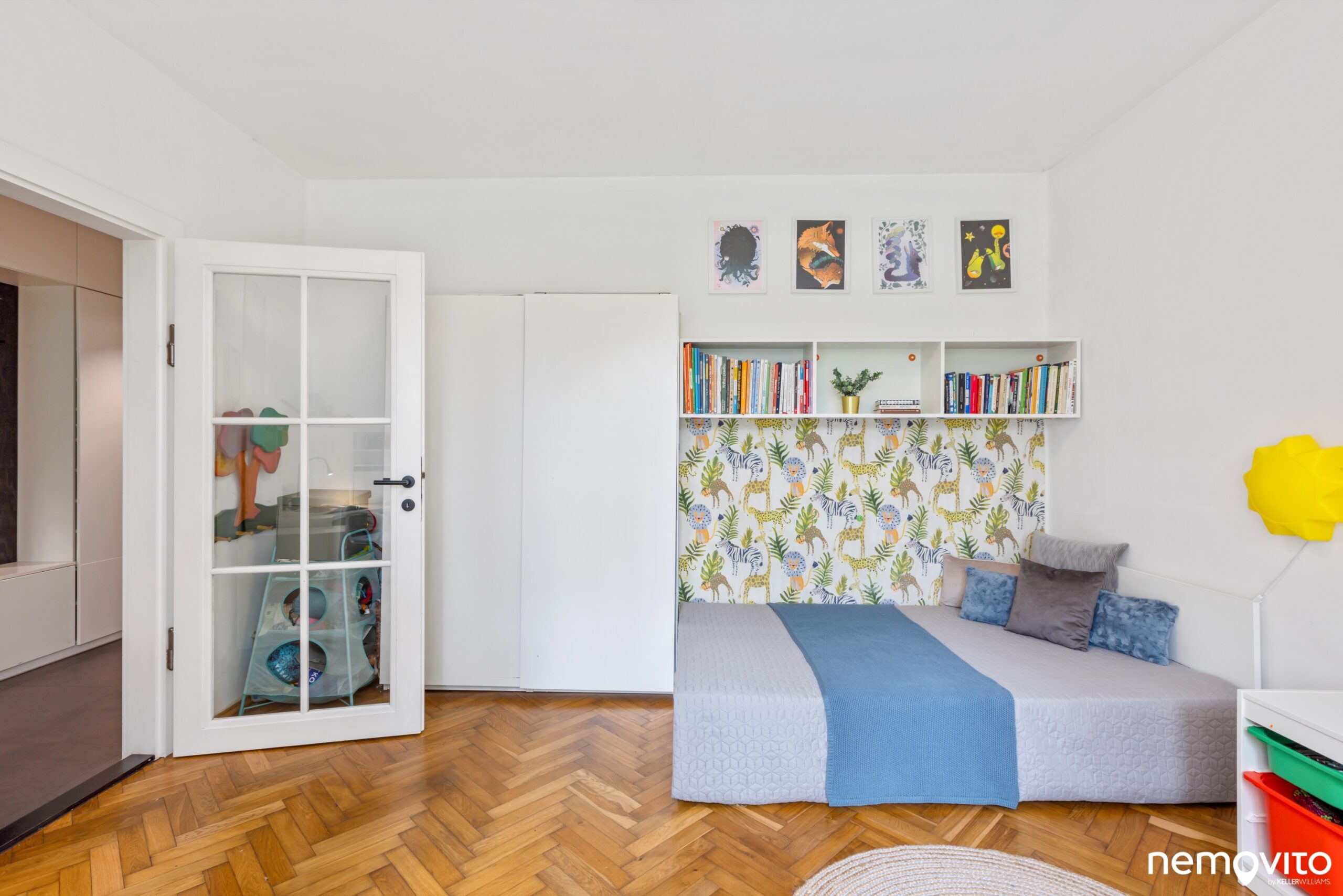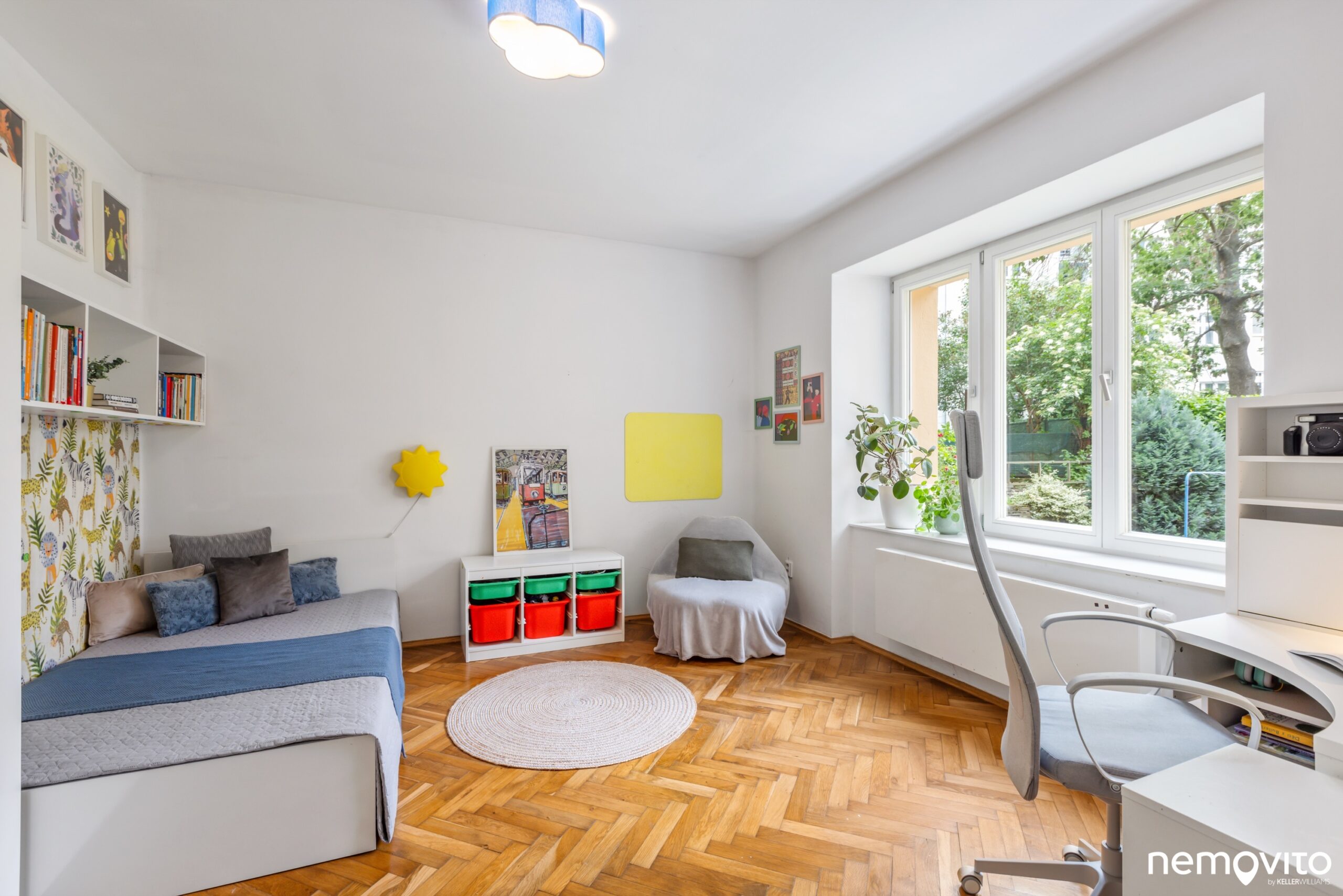 Nahoře 82 m2, dole dalších 11. Dispozice je 4+kk (případně 3+1), ale počítejte s lehce atypickým řešením. Nejmenší ložnice má okno do světlíku a plochu lehce přes 9 m2. To stačí pro kvalifikaci jako obytná místnost, ale zbylé pokoje jsou s obrovskými 2 metry širokými okny samozřejmě trošku jiná písnička. Kdo ale chodí do ložnice hlavně spát, ten spokojený. Tančit můžete ve zbylých 3 pokojích, které mají plochu od 17 do 20 m2. Byt prošel v roce 2022 kompletní rekonstrukcí a všechno je v něm nové. V krajním pokoji potěší dobové dřevěné parkety, které se ještě daly zachránit. Obývák s kuchyní a jídelnou je aktuálně rozdělen příčkou a pokud byste raději 3+kk s velkým obývákem, stačí ji jednoduše odstranit. Nová koupelna s velkou sprchou je od WC oddělená a na chodbě zůstává skutečně hooodně místa (má přes 10 m2). Mimo všeho, co vidíte, je v bytě také kompletně nový rozvod elektřiny a vytápění, který je nezávislé na budově. S vlastním plynovým kotlem si tak zatopíte přesně tehdy, kdy se vám zachce. Žádné čekání na topnou sezonu a mrznutí.