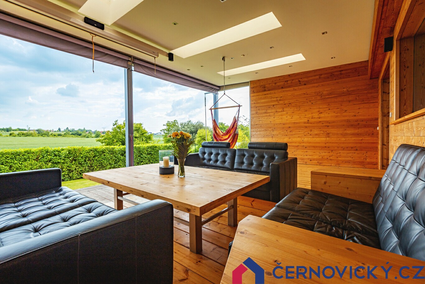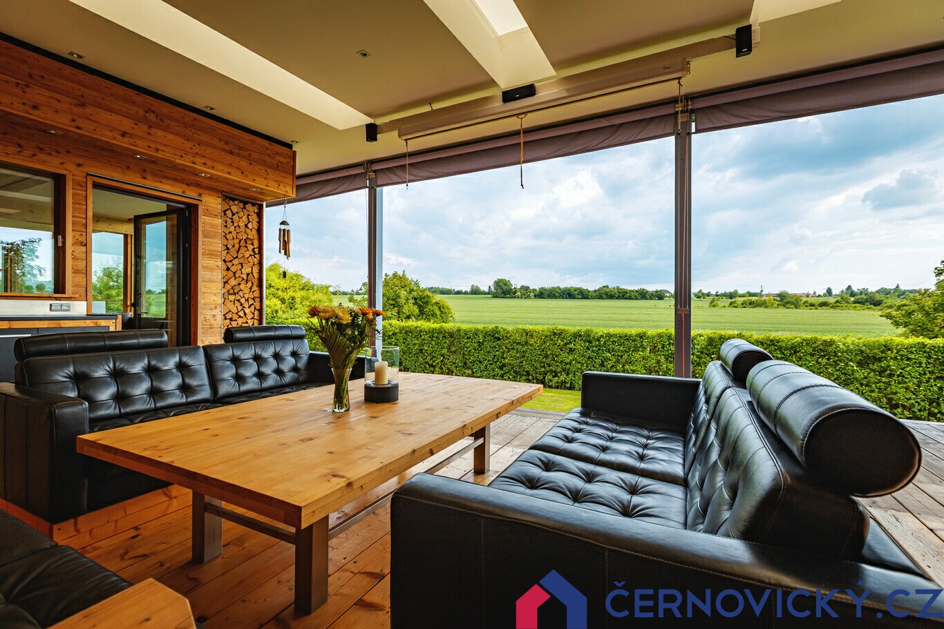Výhled z vaší nové terasy je skutečně uklidňující. Žádní sousedé, žádné silnice, jen lán pole. Obvod domu je možné zaclonit stahovacími roletami. I na terase najdete rozvod audio, světelné prostupy pro přirozené osvětlení..